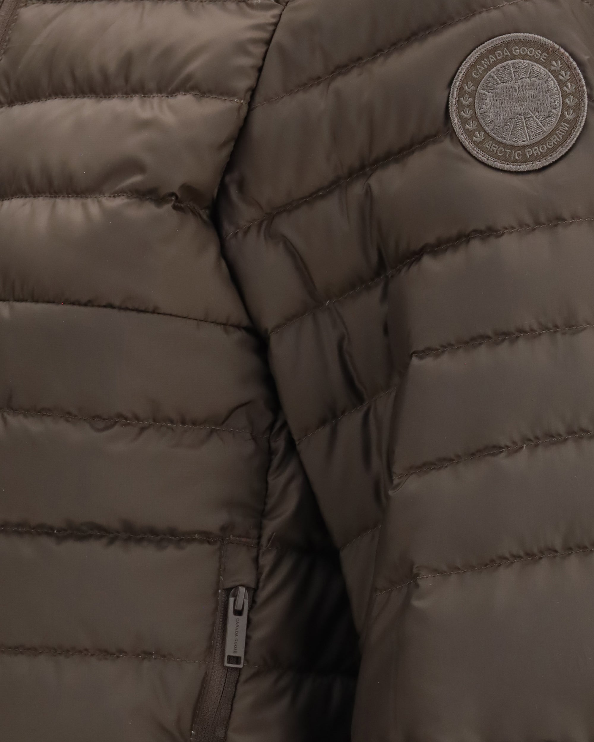 The Aethera Tonal Label hooded Jacket by Canada Goose is designed for effortless outdoor activities and travel. Fully packable into its right pocket, it provides lightweight protection and layers easily over other garments. It features a fixed hood with elasticated trim, a one-way front zipper, articulated sleeves with elastic cuffs, and an adjustable drawcord hem to customize the fit and retain warmth. Functional details include two zippered hand pockets, one interior drop-in pocket, and one interior security zip pocket.