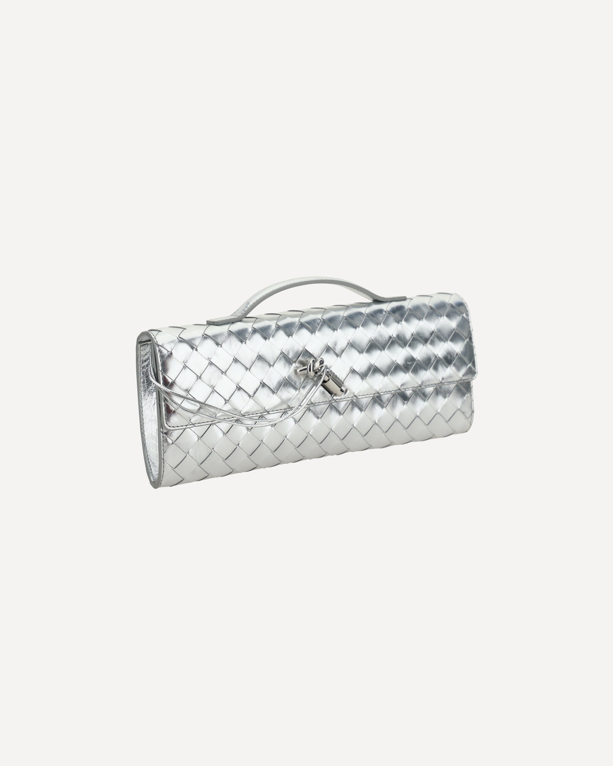 Bottega Veneta's Andiamo Clutch Bag is made of metallic leather with the brand's distinctive handcrafted weave. Featuring a flat top handle, it has a front closure with a magnetic flap and swivel for added security. The interior is spacious, with a single compartment for essentials. Elegant and versatile, it is a perfect accessory for any occasion, combining functionality and luxurious sophistication.