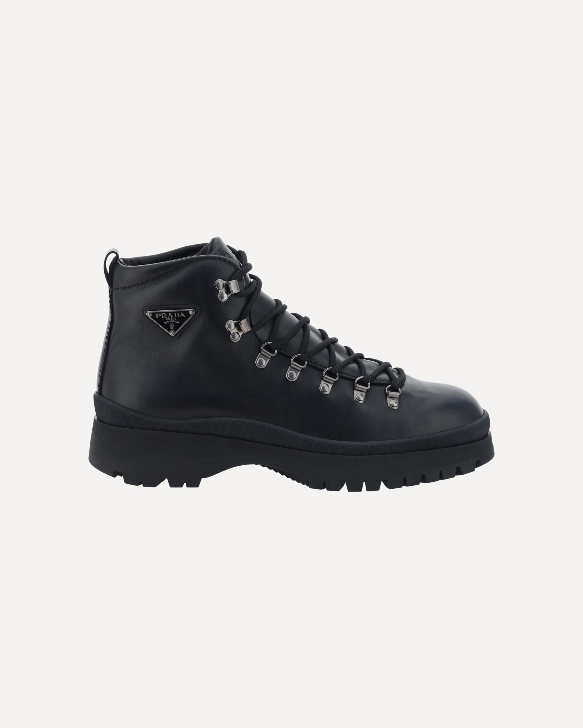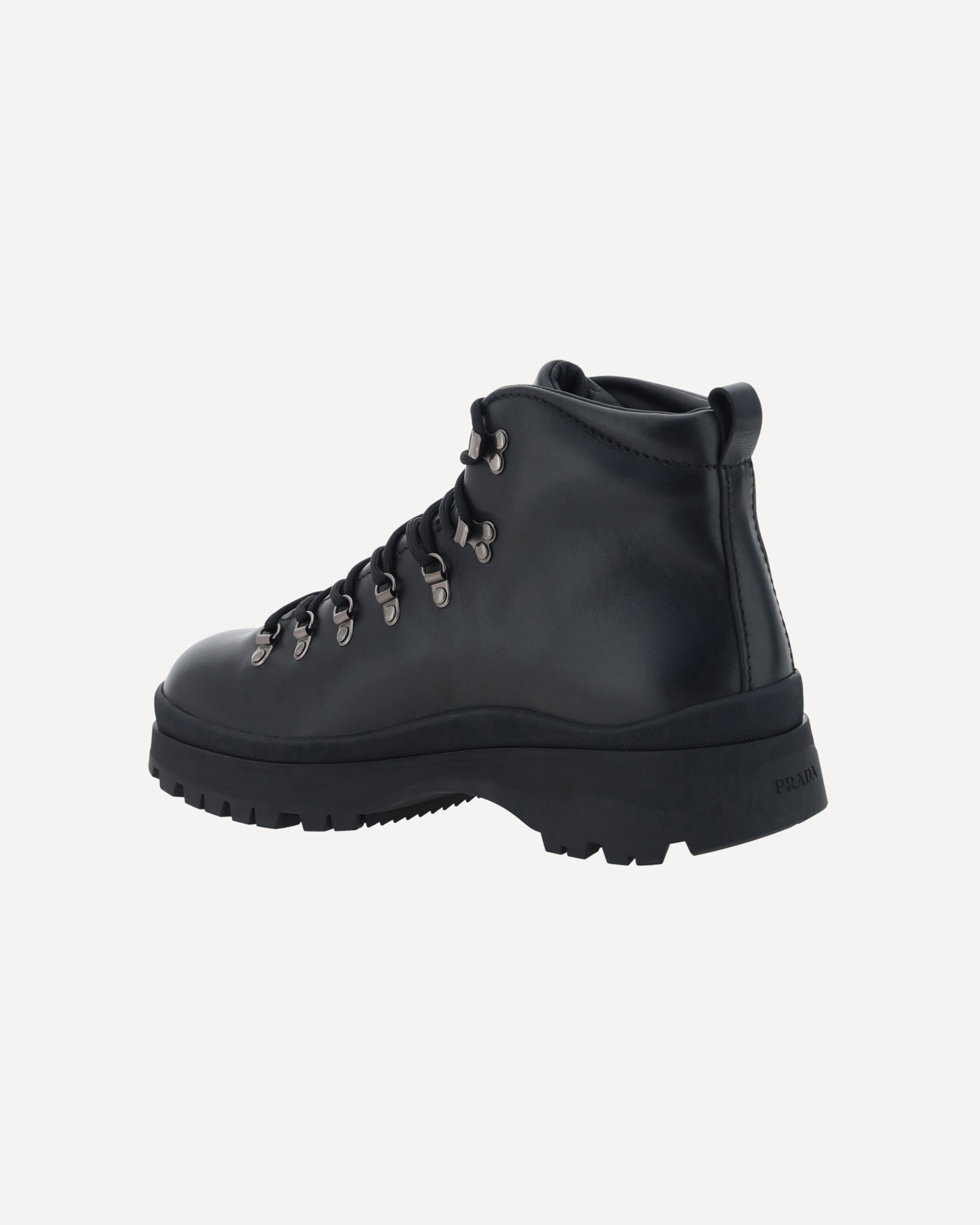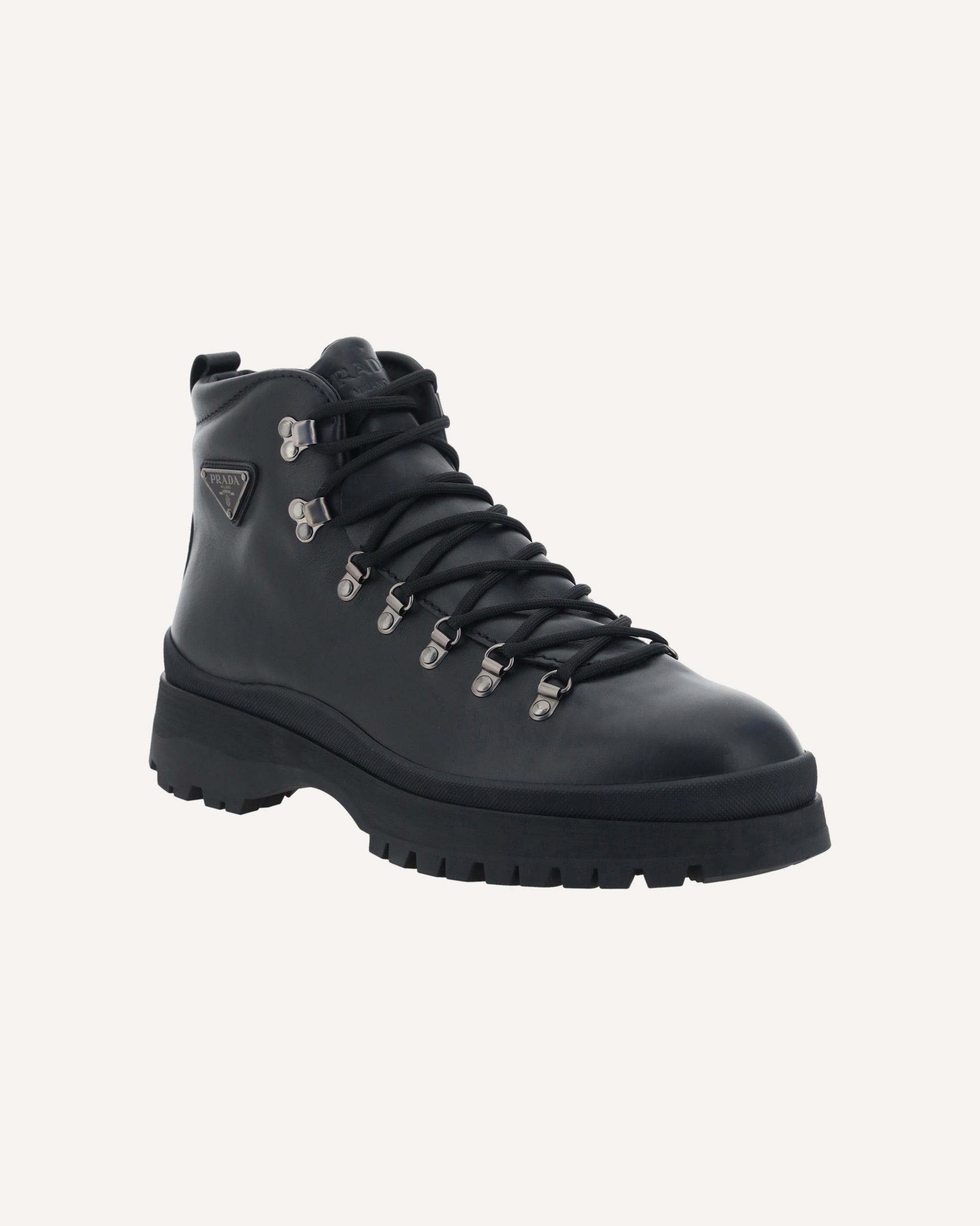 Leather Ankle Boots by Prada reinterpret a wardrobe classic with a bold, contemporary attitude. Featuring a front lace-up closure and a handy pull-on at the back for easy donning, they feature a slip-resistant rubber lug sole that provides stability and grip. The iconic triangular embossed plaque on the ankle sign the model with a distinctive touch, while the round toe completes the design with balance and versatility.