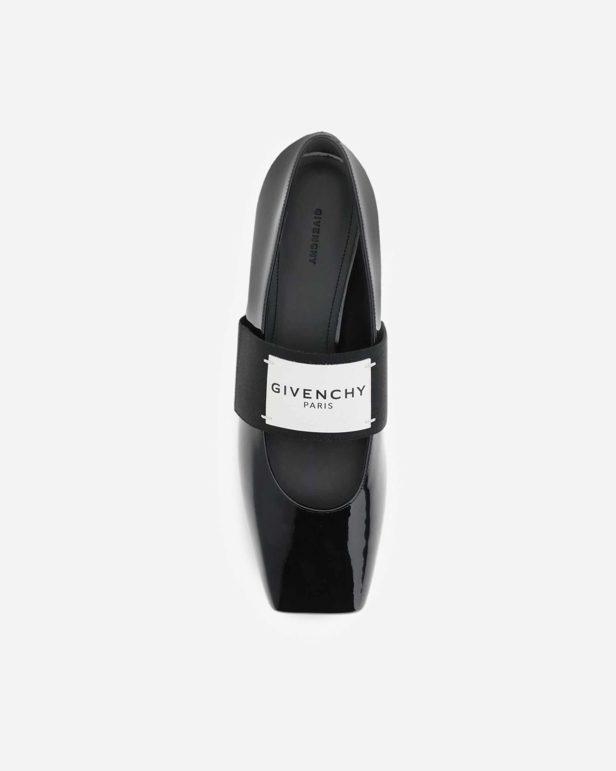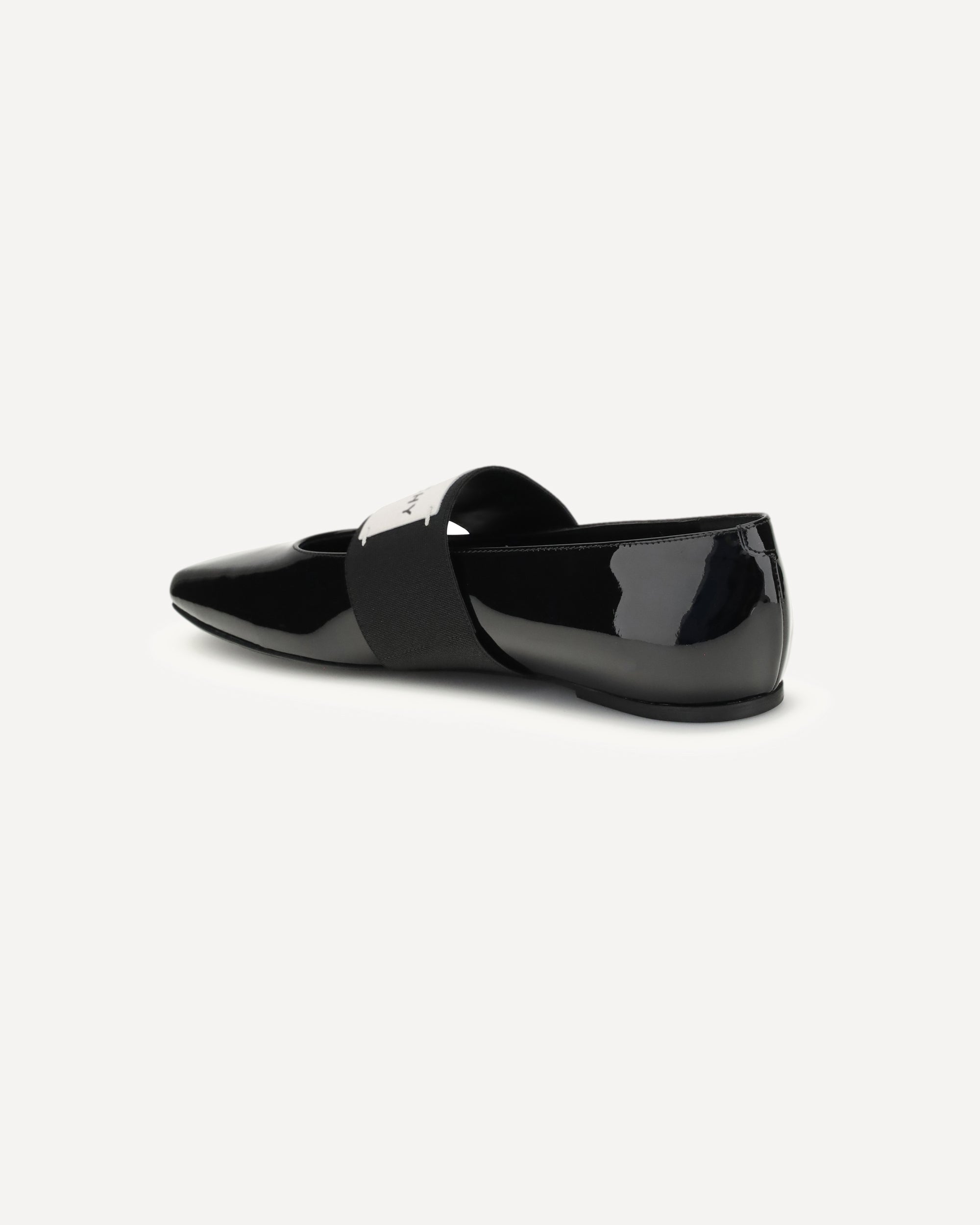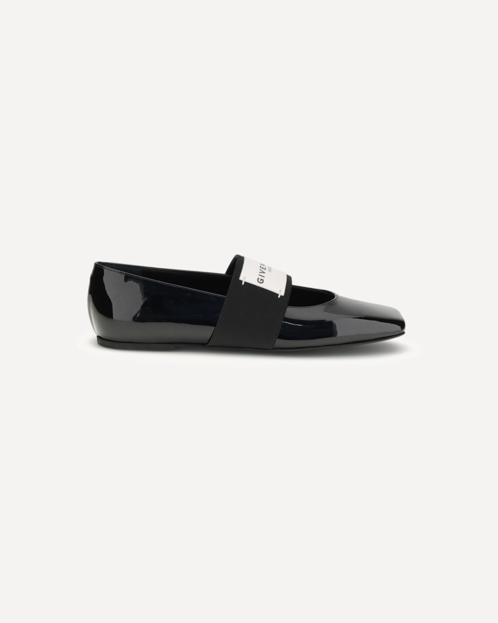The patent-leather Squared Ballerinas by Givenchy stand out for their modern and refined design. Featuring a square toe, they are enhanced by an elastic instep strap with the Givenchy Paris label, which adds a distinctive, contemporary detail. The embossed logo on the inside elegantly completes this iconic design.