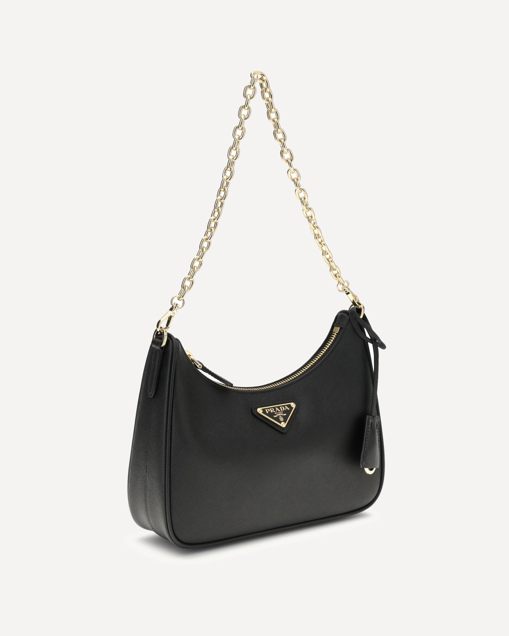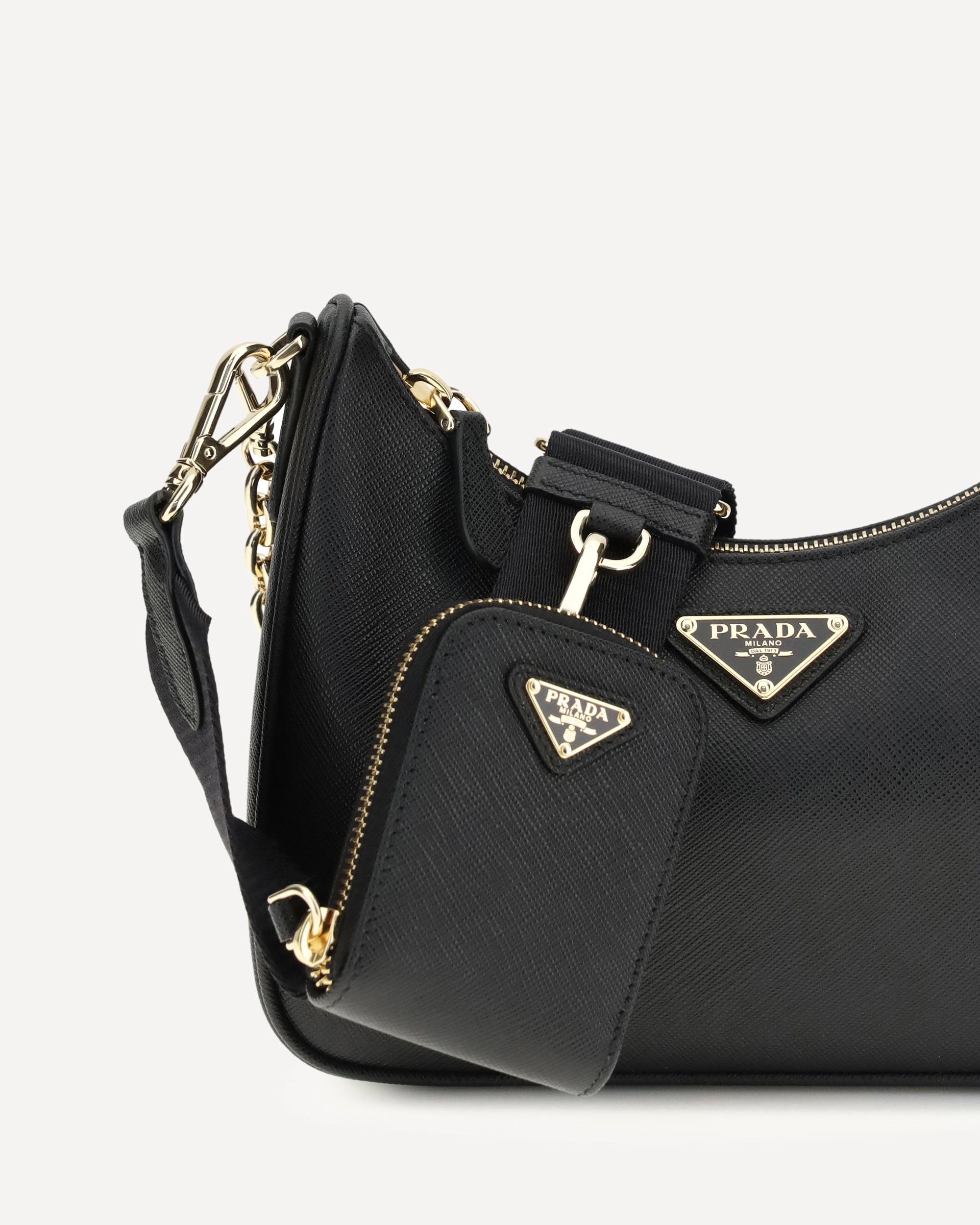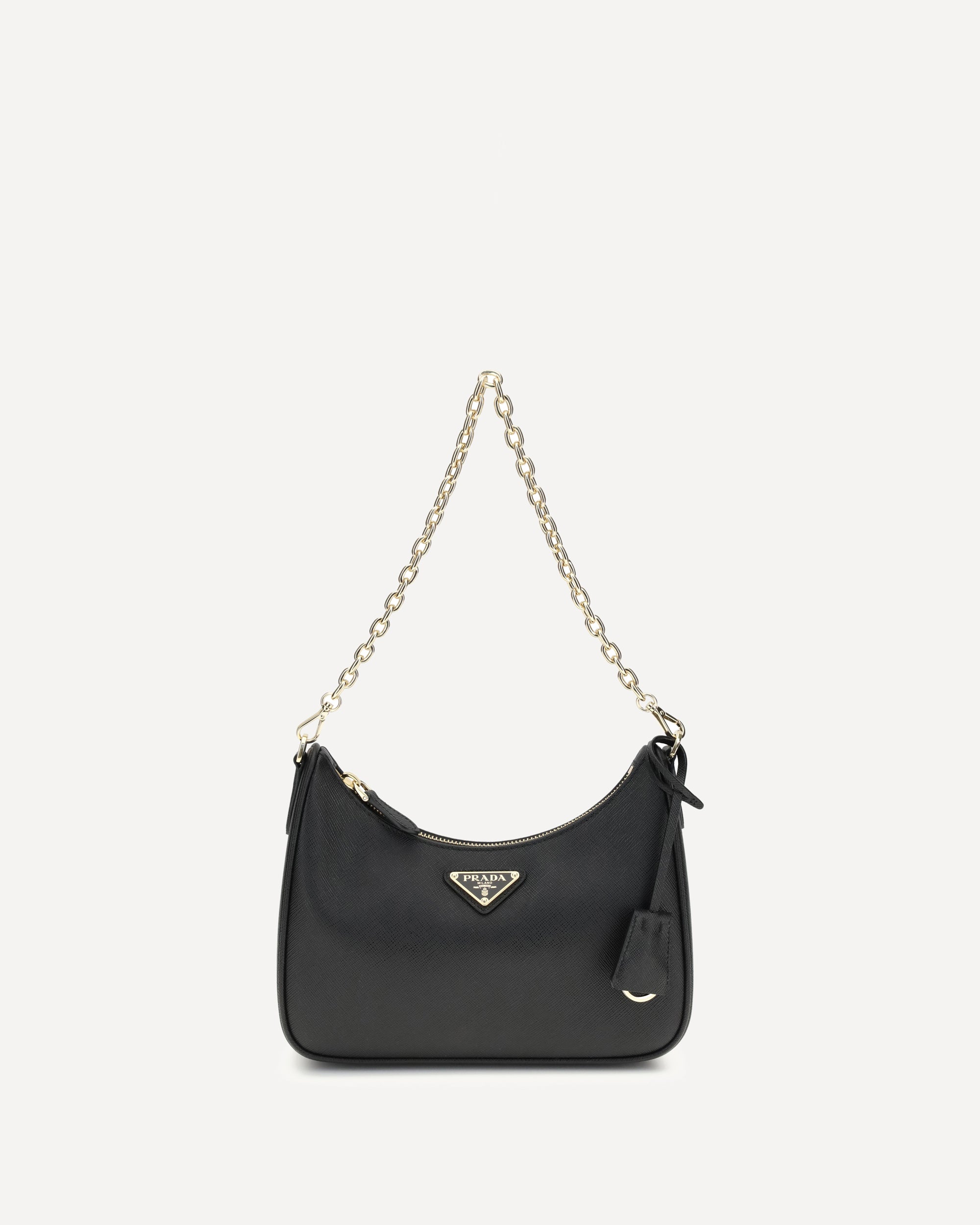 The 2005 Re-Edition Shoulder Bag by Prada is made of Saffiano leather, with an elegant logoed triangle on the front and a removable leather accessory with key ring. Equipped with a metal chain handle and adjustable tonal fabric shoulder strap, the bag also offers a removable storage. The zippered closure provides practicality and security, making it a refined and versatile accessory.