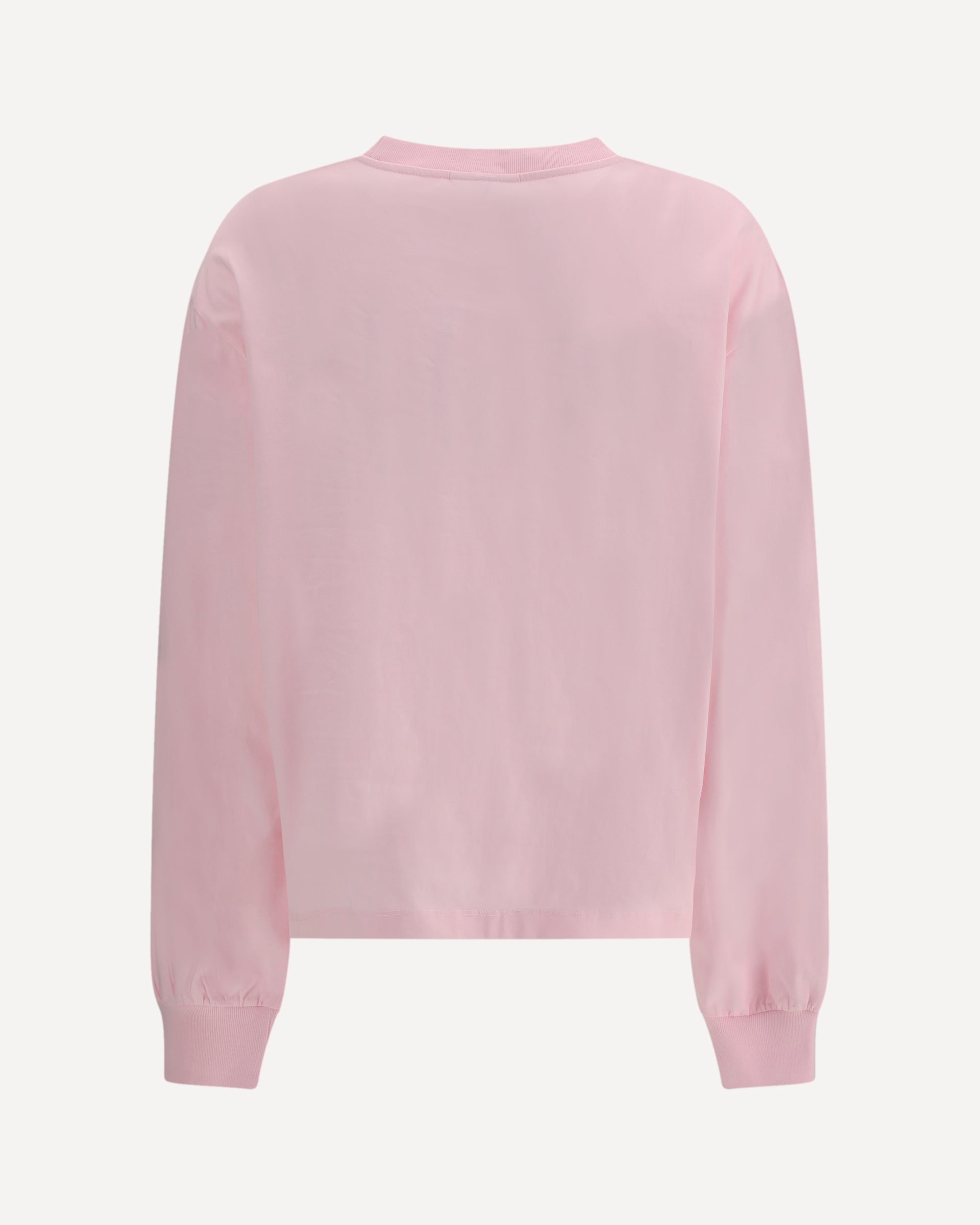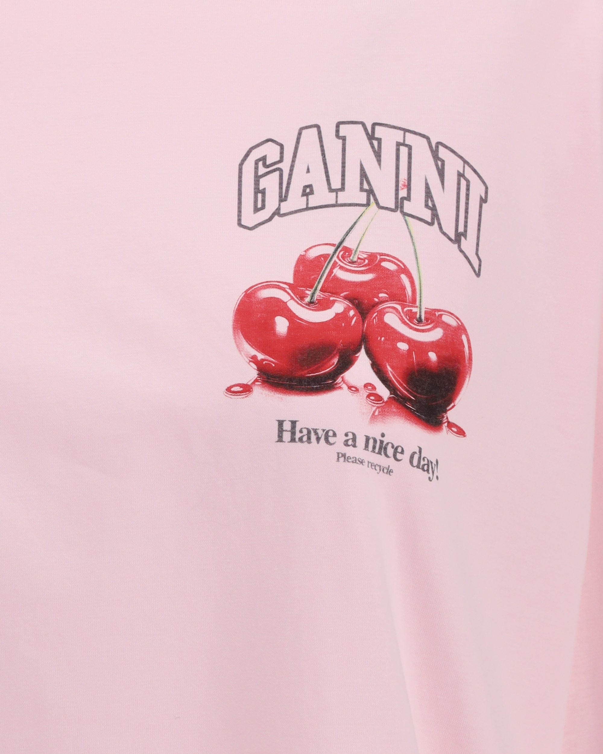 The Long-Sleeve T-shirt By Ganni brings subtle charm to a clean, everyday silhouette. The round neckline creates a balanced, minimal frame, while ribbed cuffs add soft structure. On the upper left side, the small cherry graphic introduces a playful, signature touch that reflects Ganni’s joyful aesthetic. A piece that turns simplicity into quiet personality.