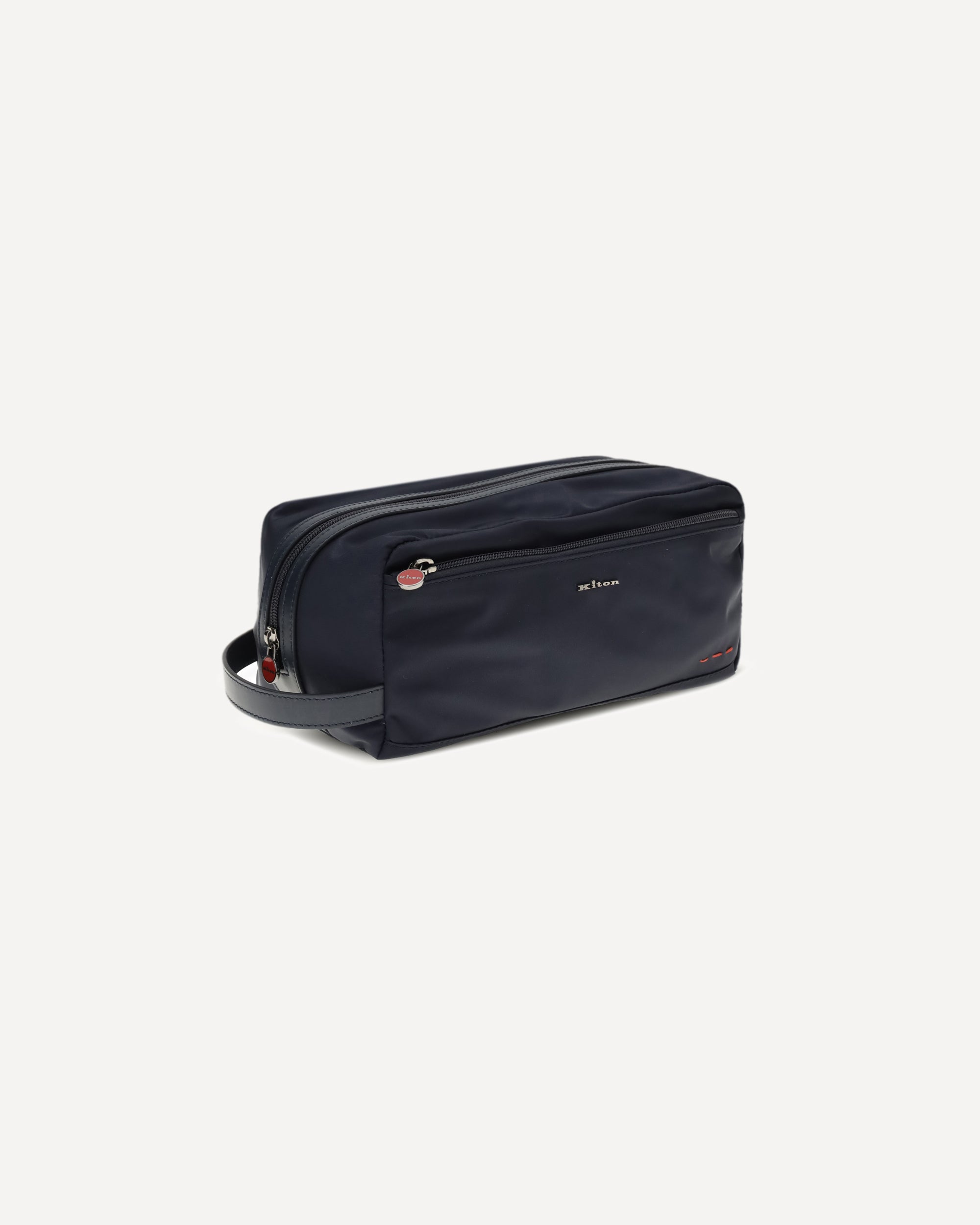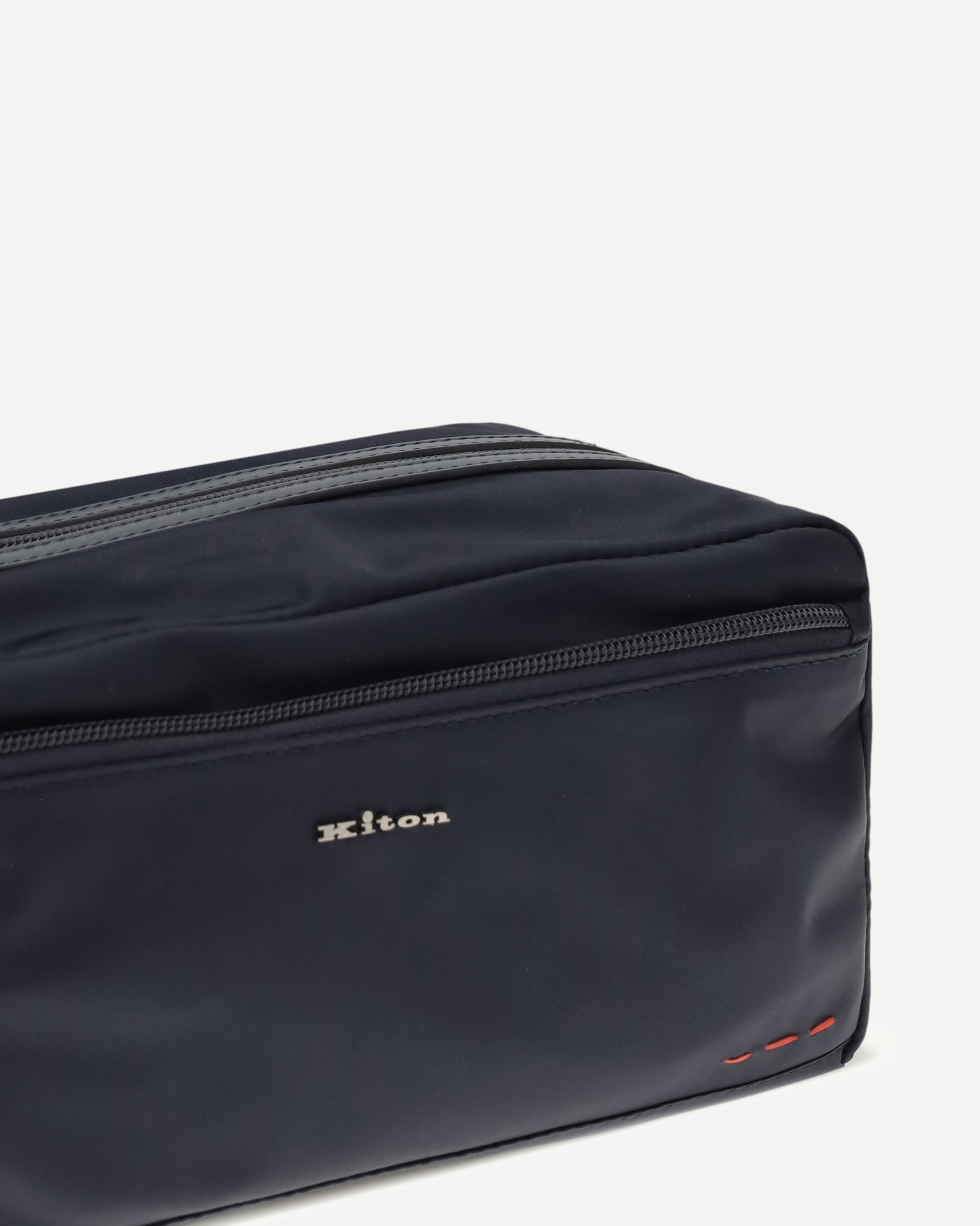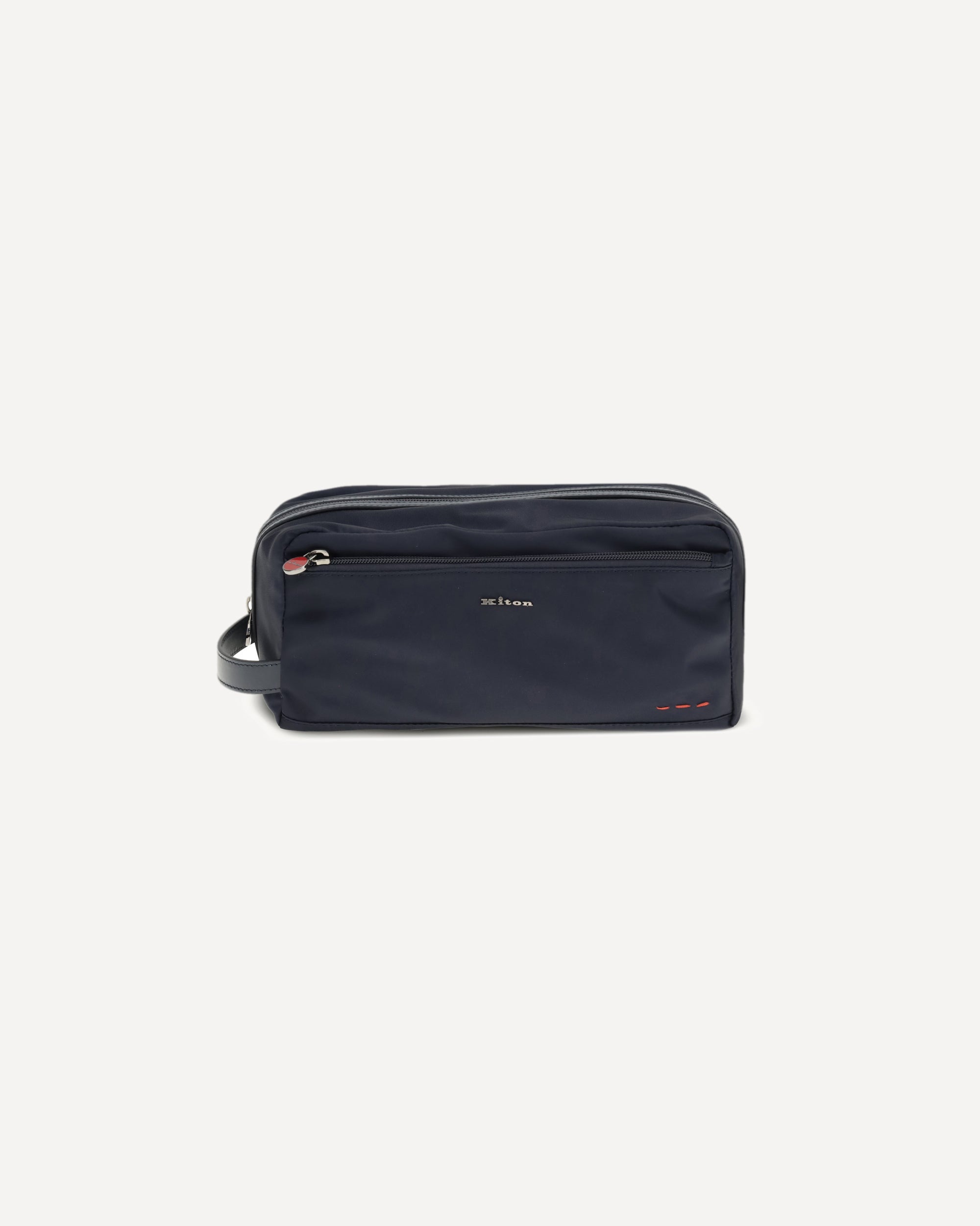 The nylon Beauty case by Kiton is perfect for travel and is enriched with refined leather inserts that enhance its essential and minimalist design. The zip fastening, large external front pocket with logo, and top handle ensure practicality for the dynamic, cosmopolitan man. The interior features an open pocket, while Kiton’s artisanal craftsmanship provides exceptional lightness and quality.