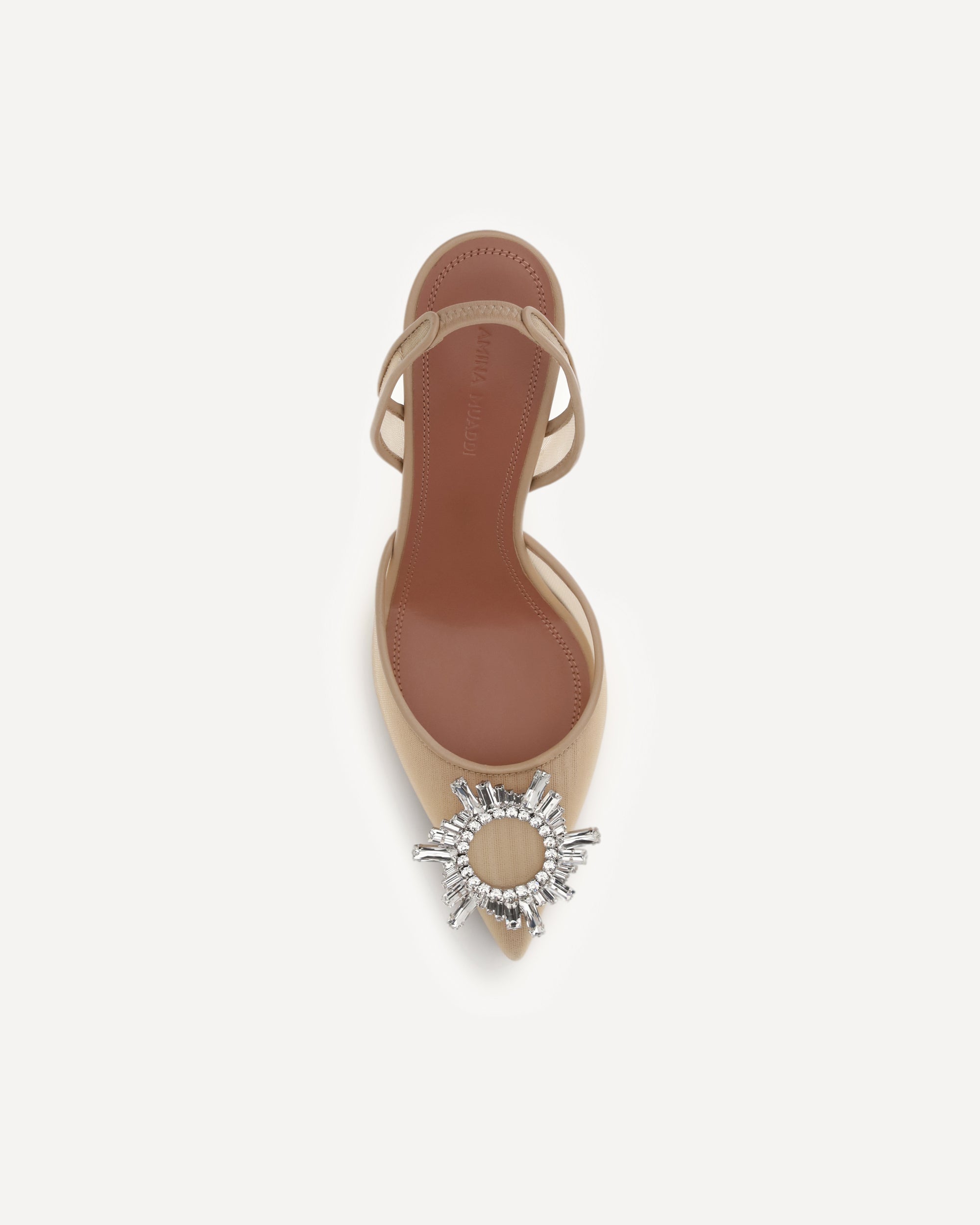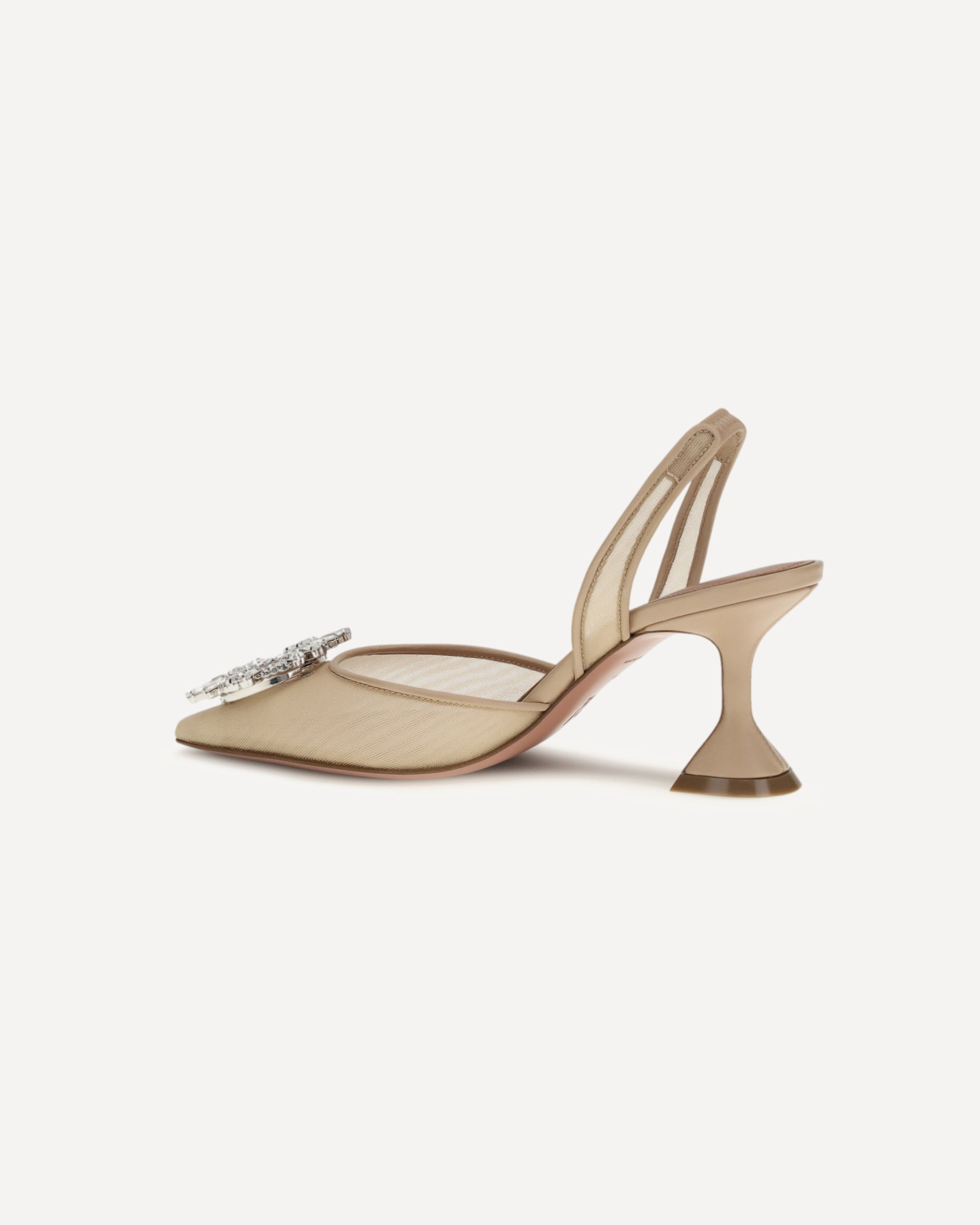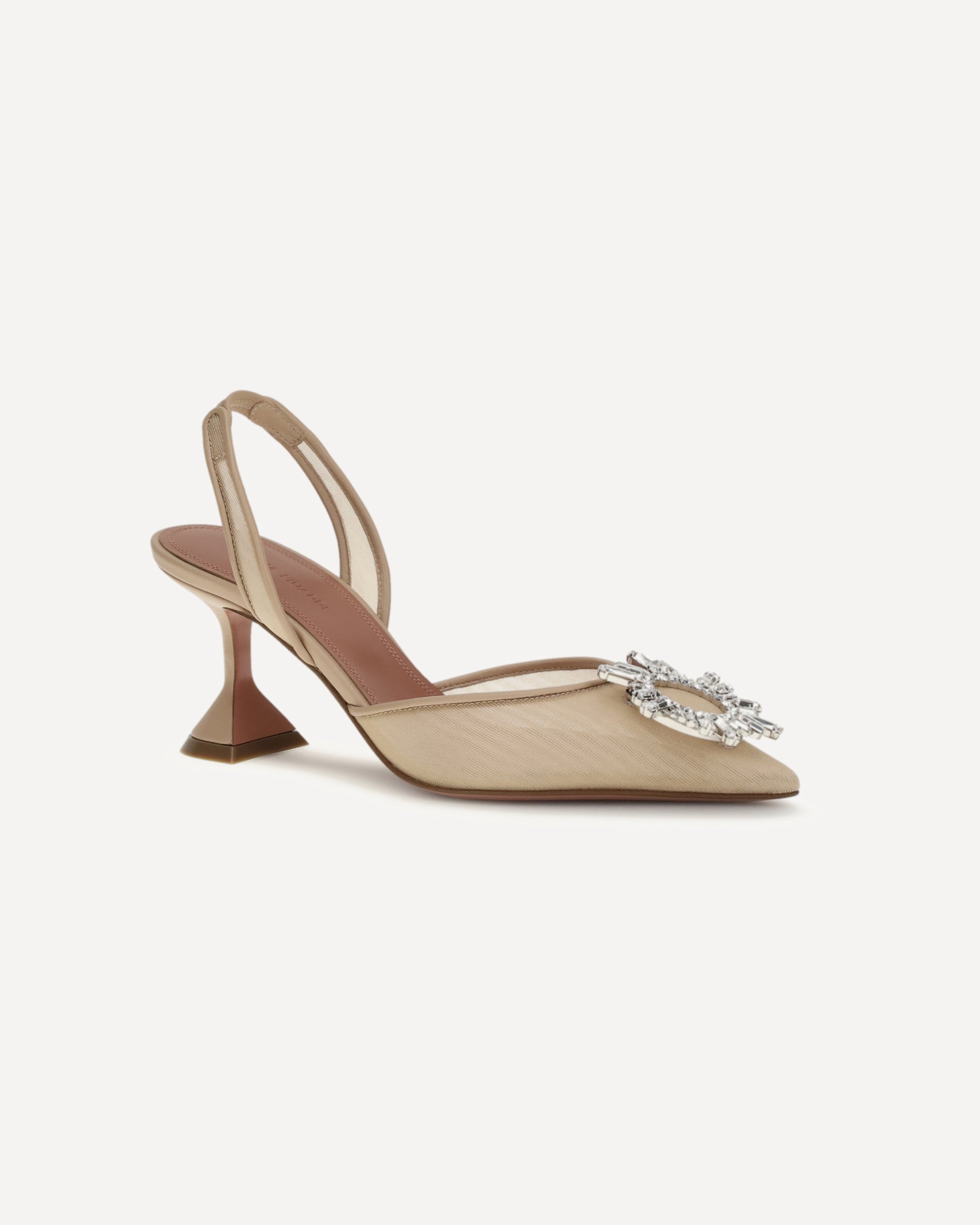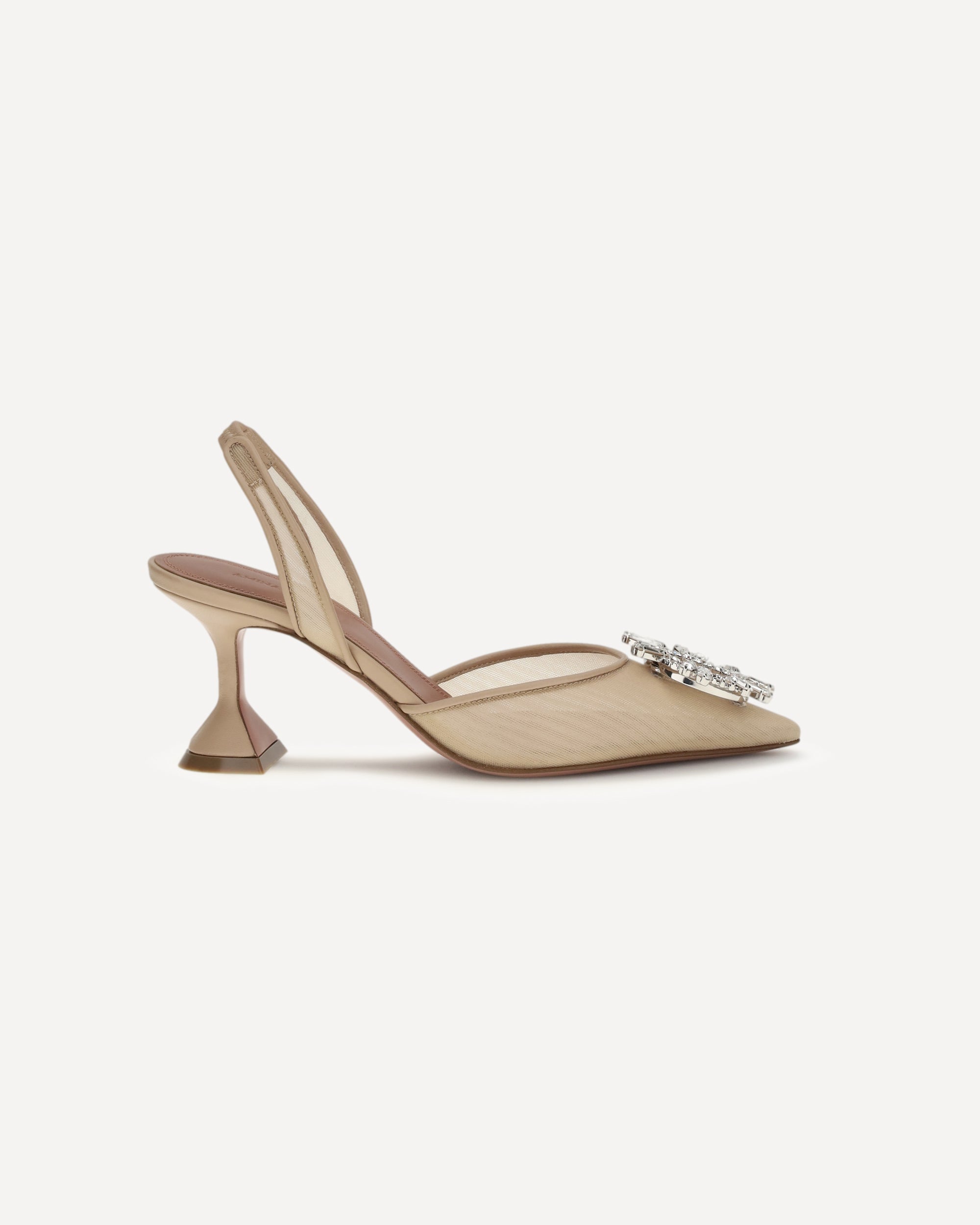 The Begum Pumps by Amina Muaddi are the epitome of elegance and glamour. With their elongated almond toe, they lend a sophisticated and refined silhouette, while the geometric leather heel adds a modern and bold touch. The slingback detail at the heel ensures a perfect fit, while also adding a distinctive style element. The rhinestone and diamond jewel applied in relief on the toe captures the light, enriching the design with a touch of sparkling luxury. The mesh upper completes the look, making these pumps a true masterpiece of design.