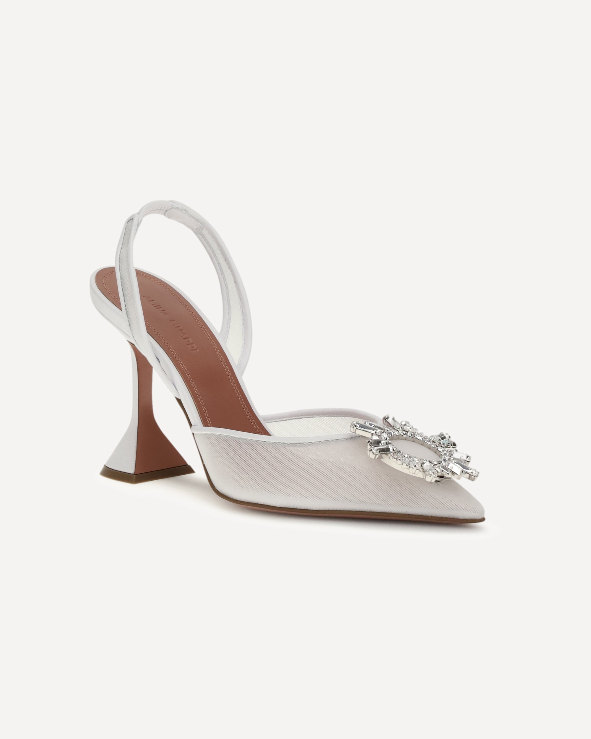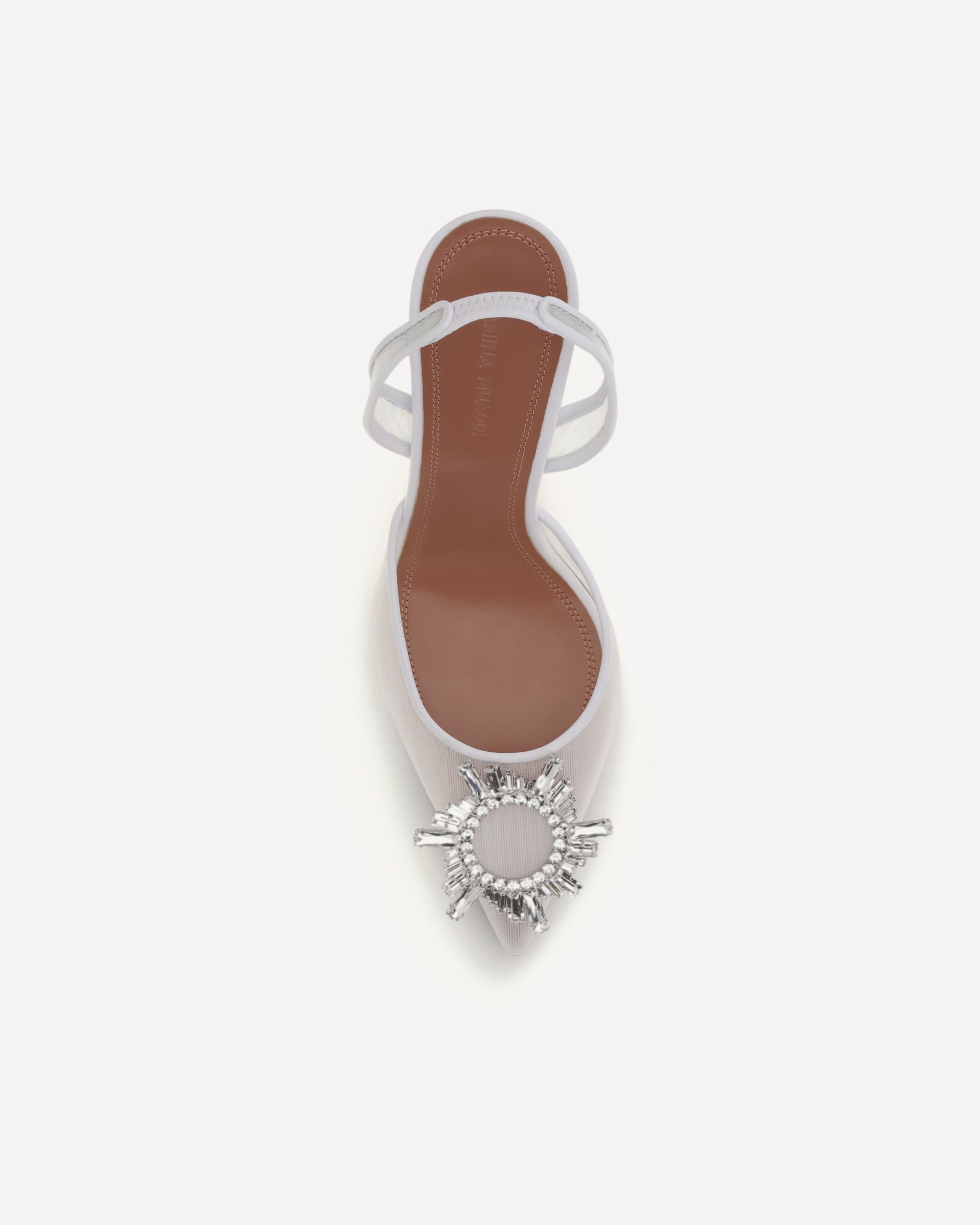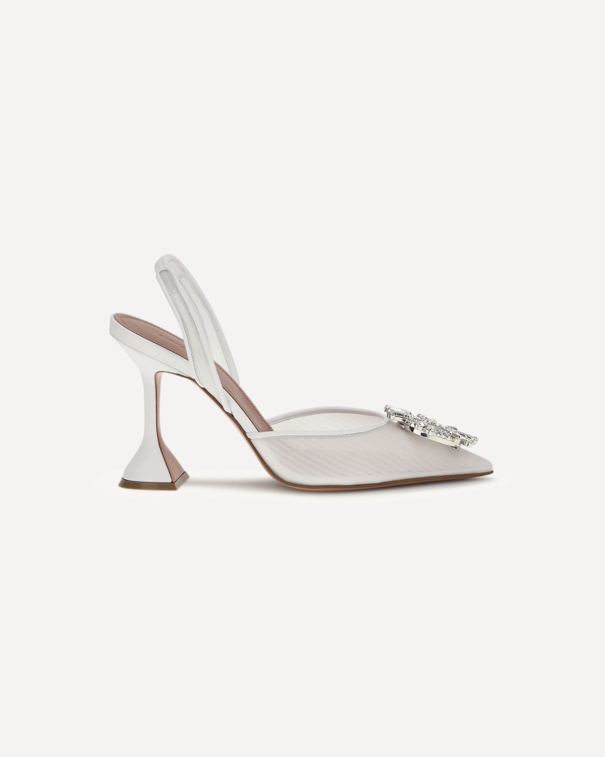 The Begum Pumps by Amina Muaddi are the epitome of elegance and glamour. With their elongated almond toe, they lend a sophisticated and refined silhouette, while the geometric leather heel adds a modern and bold touch. The slingback detail at the heel ensures a perfect fit, while also adding a distinctive style element. The rhinestone and diamond jewel applied in relief on the toe captures the light, enriching the design with a touch of sparkling luxury. The mesh upper completes the look, making these pumps a true masterpiece of design.