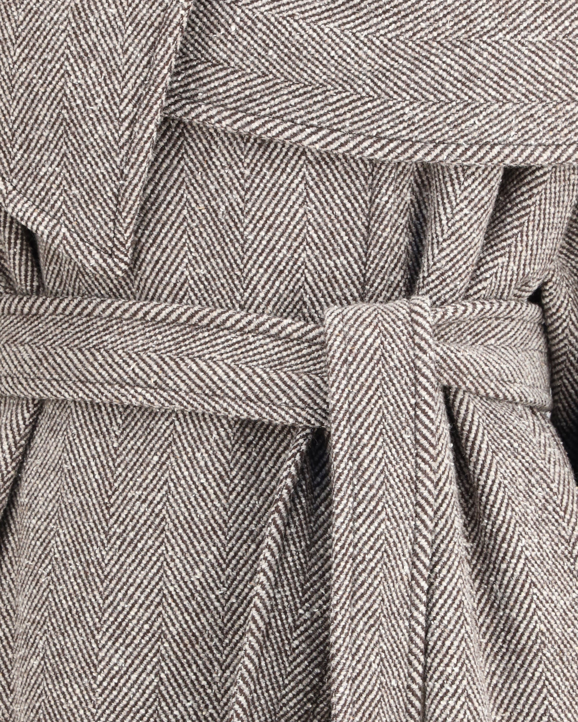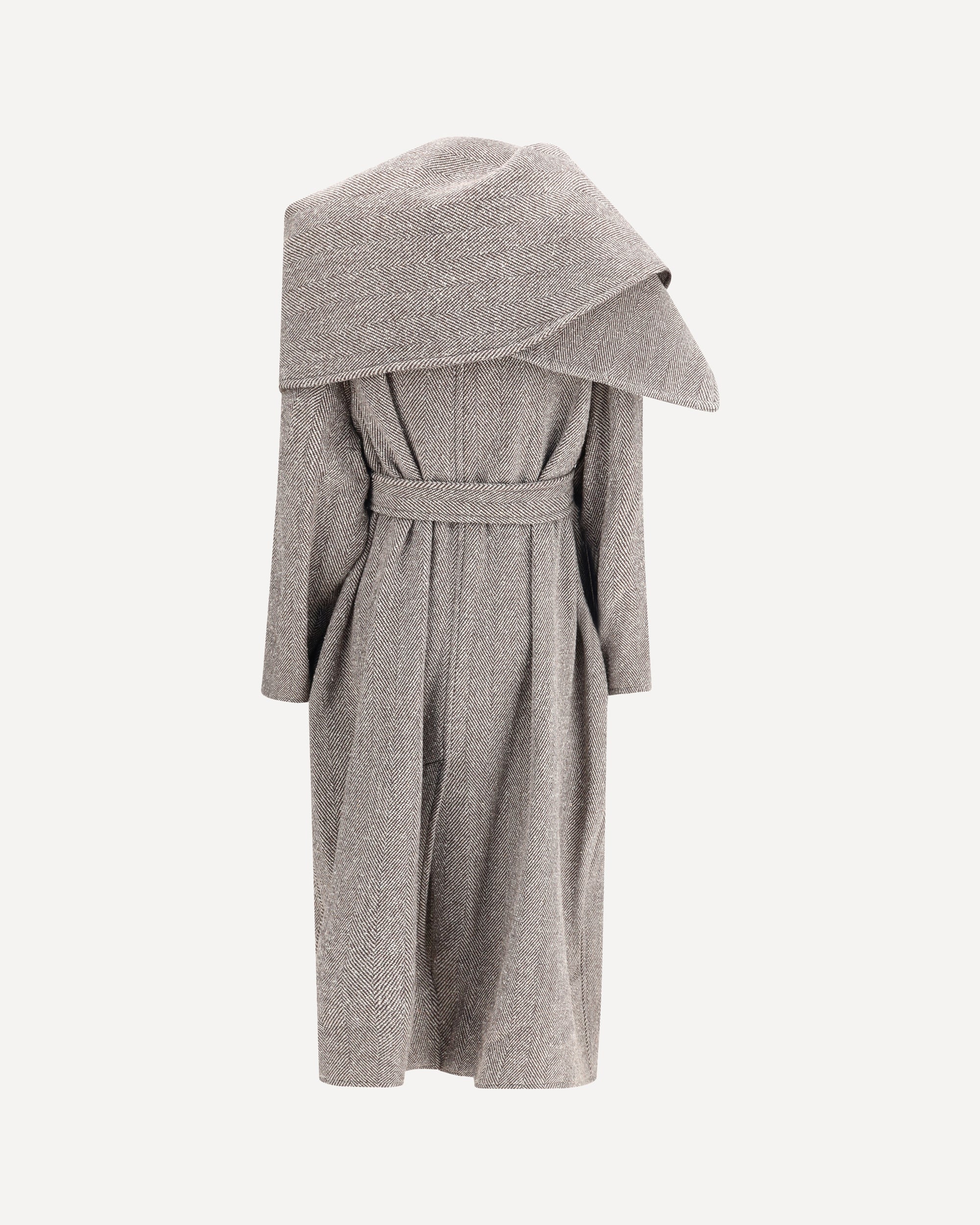 The oversized asymmetric Coat by Ferragamo embodies generous proportions and a soft chevron-textured bouclé fabric, offering a refined yet cozy allure. The couture-inspired cuts and fluid lines highlight the brand’s masterful tailoring, while kimono-style sleeves and a concealed closure add sophistication and ease. A voluminous integrated scarf drapes elegantly across the back and falls along the left side, creating graceful movement and an effortless sense of modern elegance.