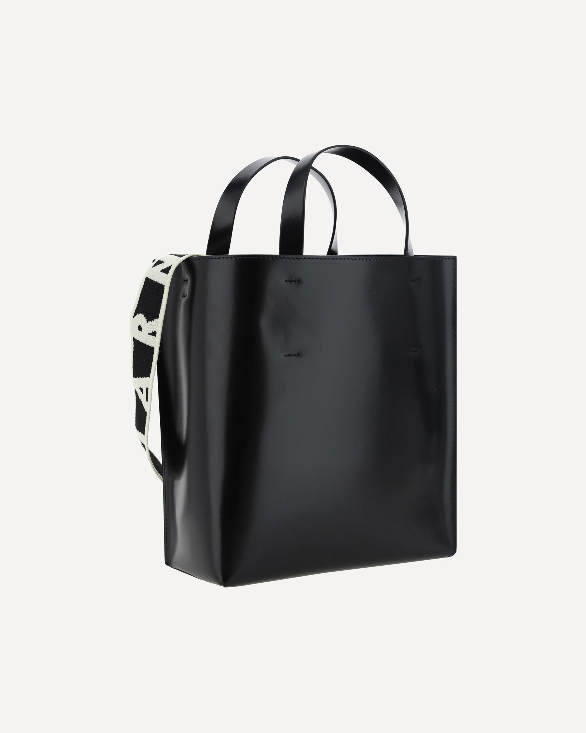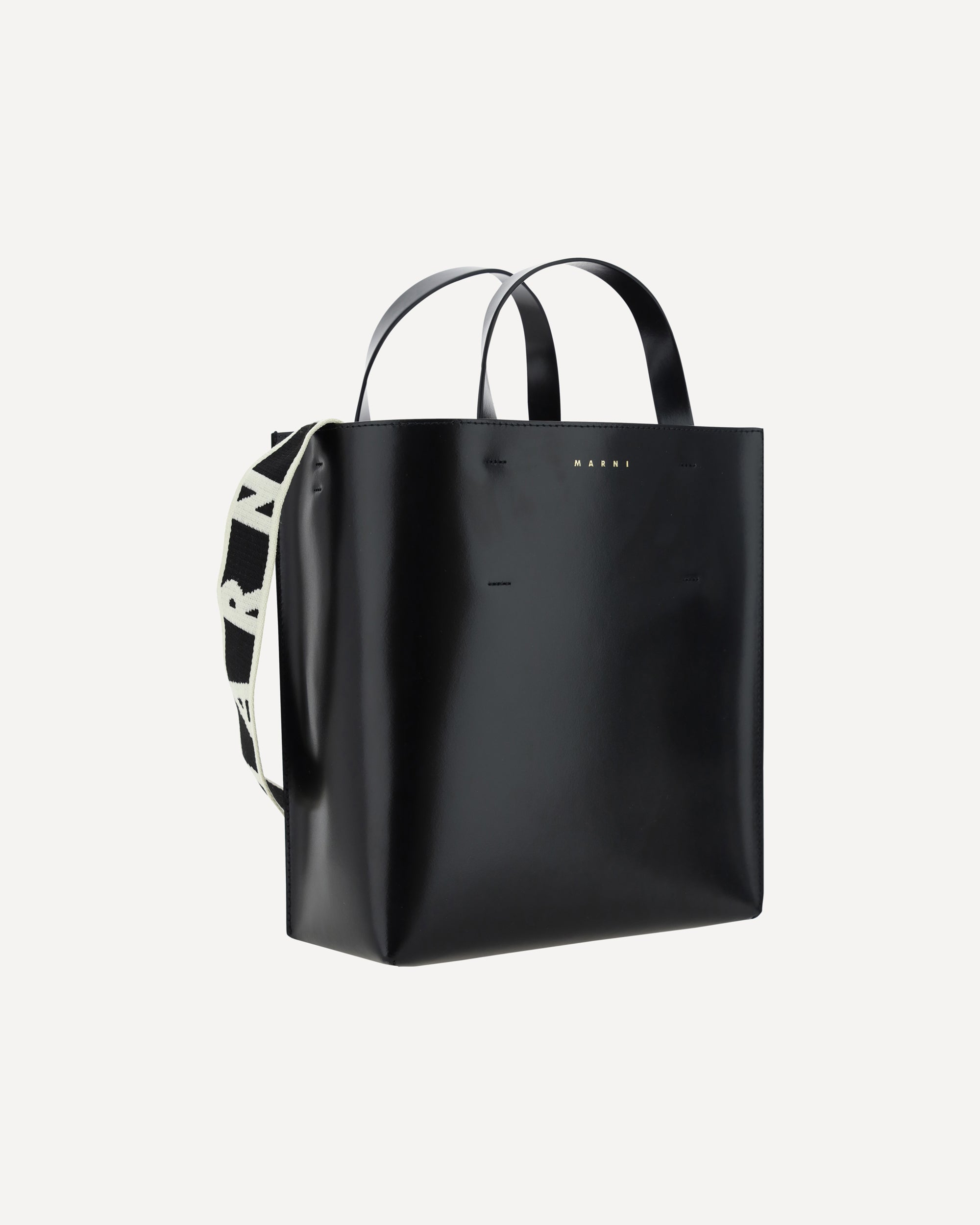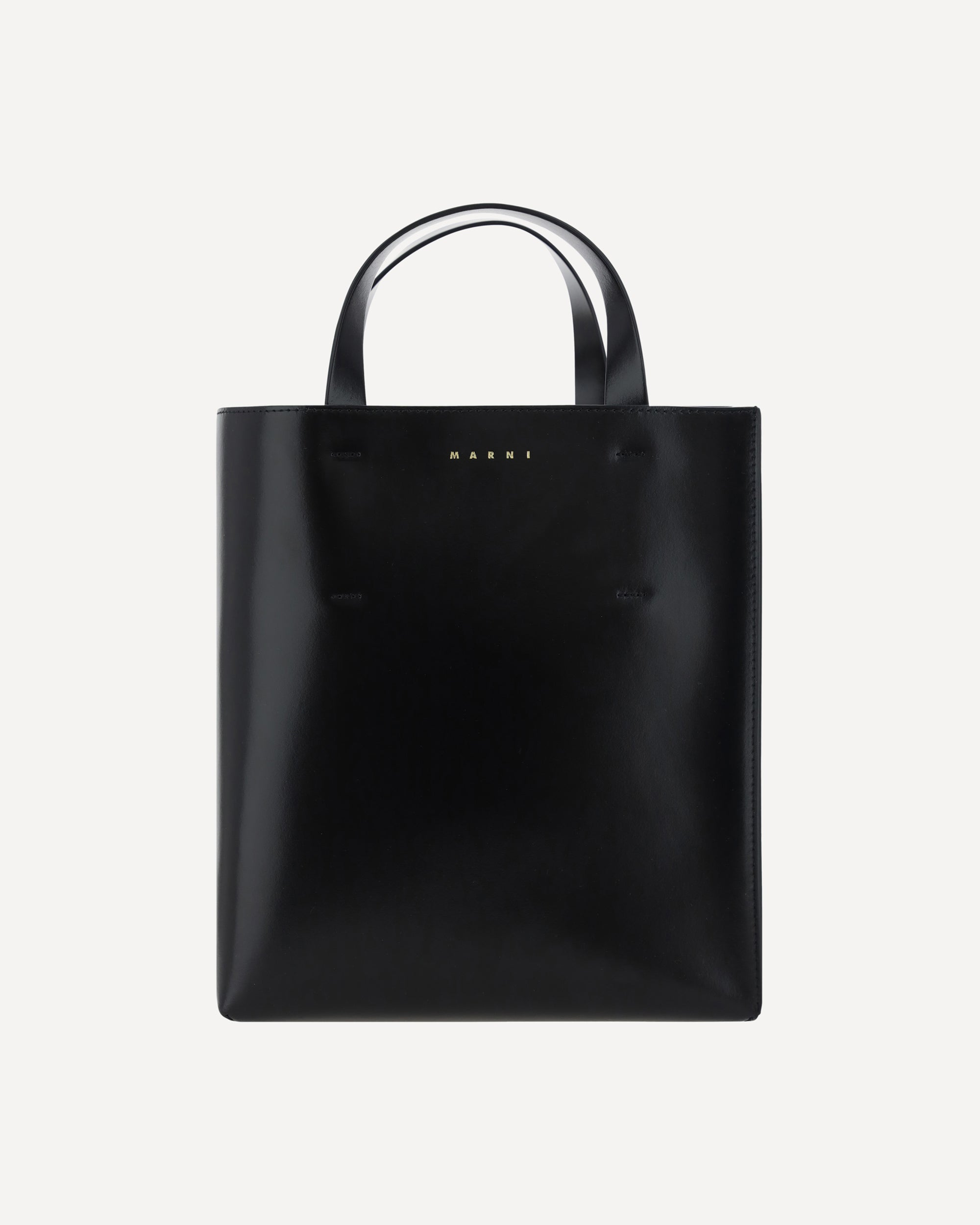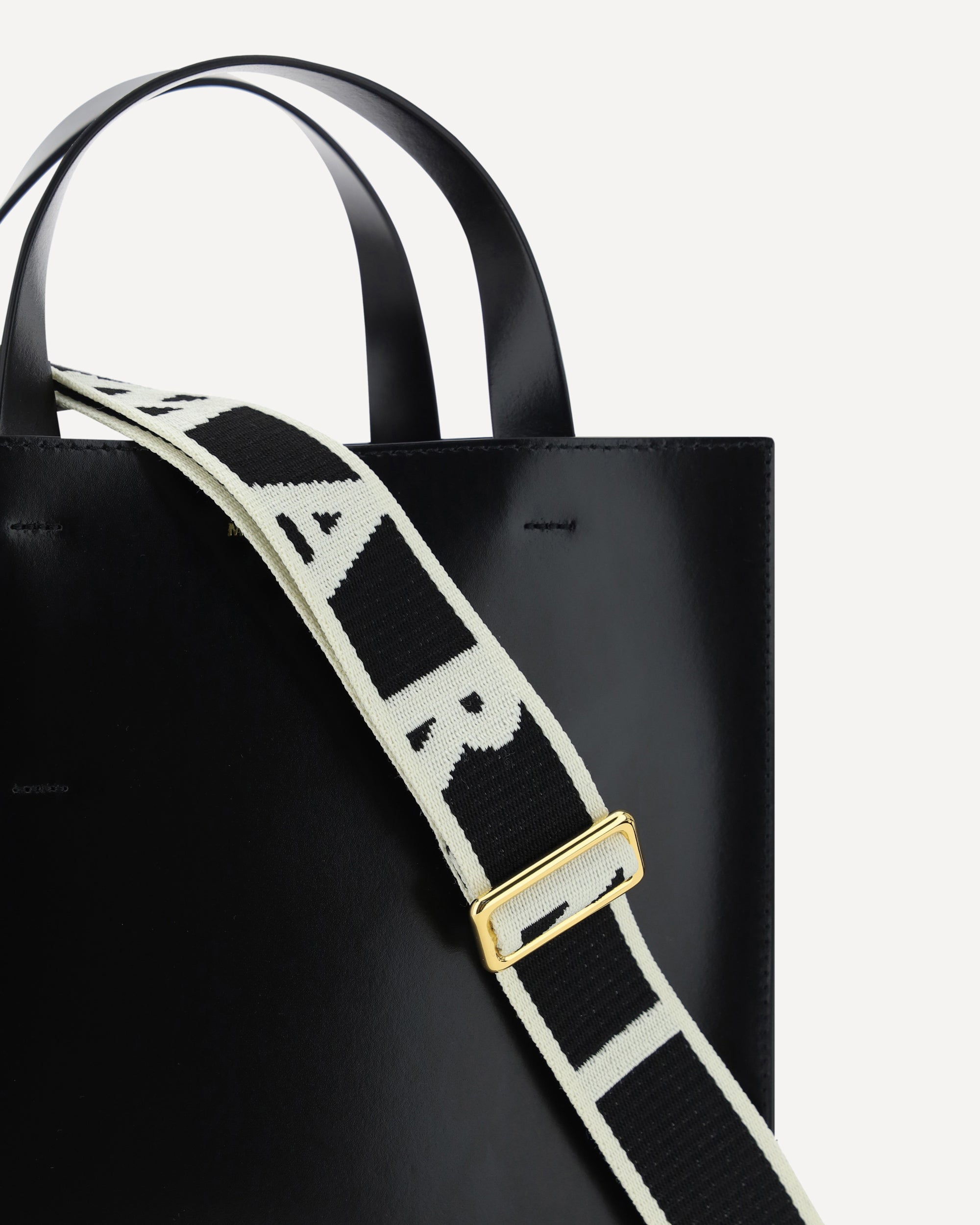 Calfskin Museo Handbag by Marni, iconic brand monogram printed in contrast on front, two flat handles for carrying it by hand, removable and adjustable flat monogrammed shoulder strap, single interior compartment, interior slit pocket, cotton lining.