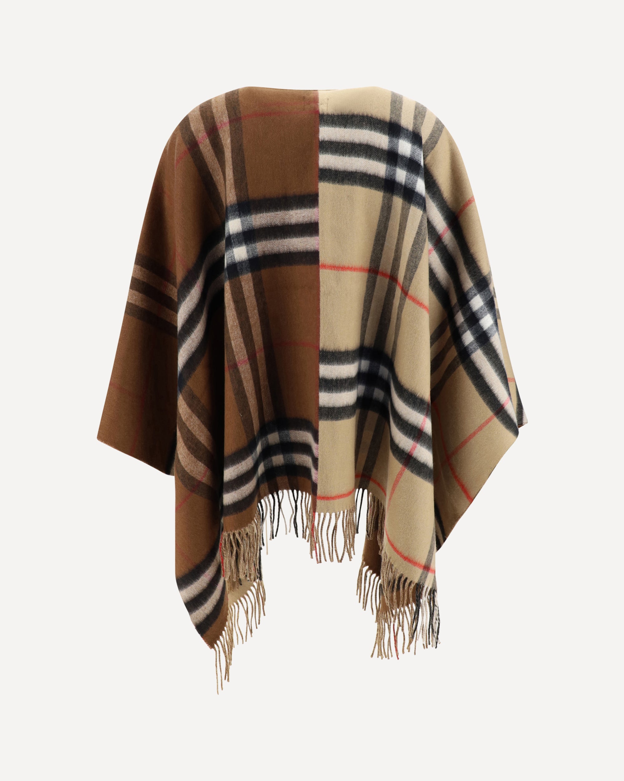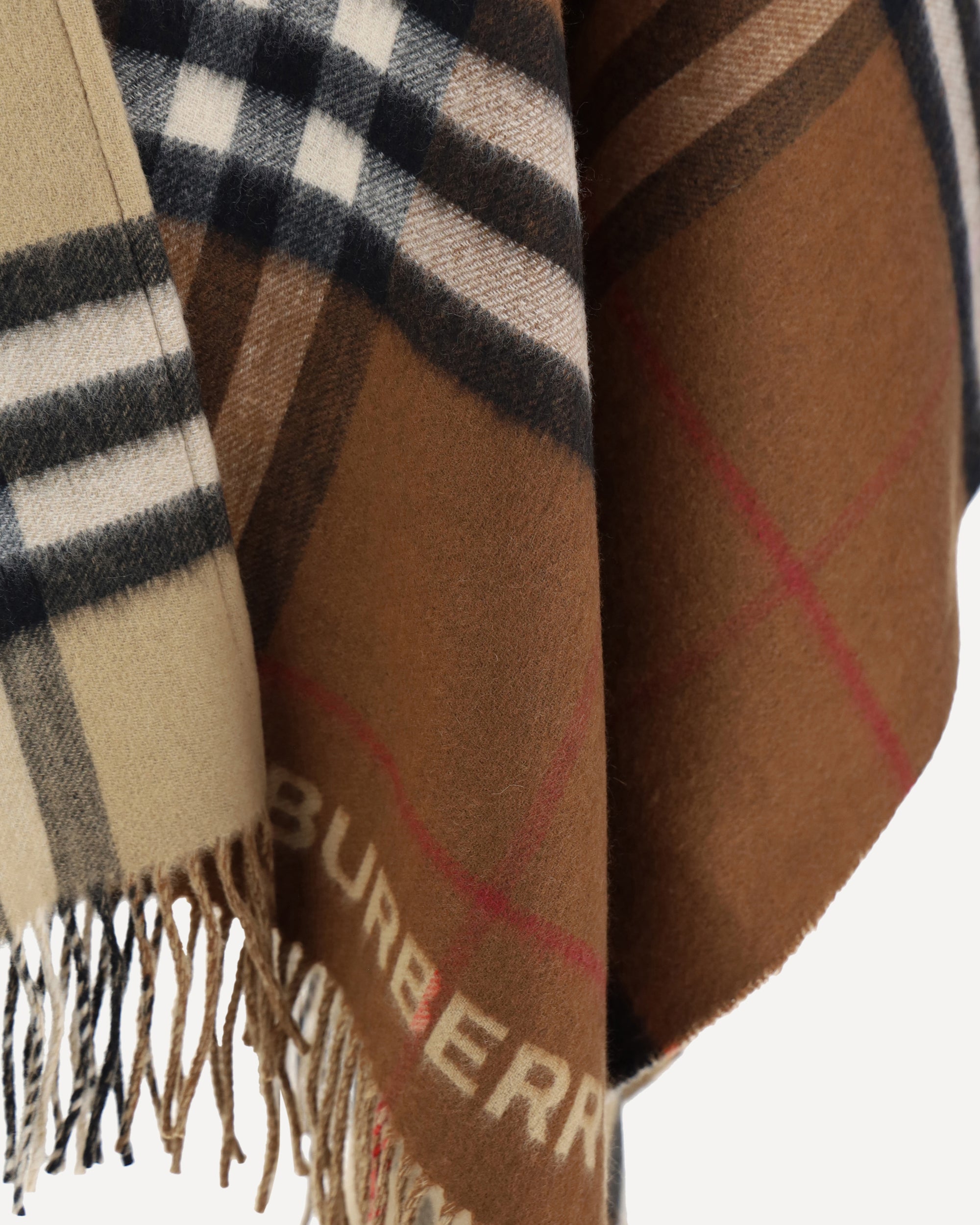 Merino Wool Cape by Burberry, the brand's iconic Archival Check pattern, frayed hems, contrasting printed brand monogram on front, shawl lapels on front.