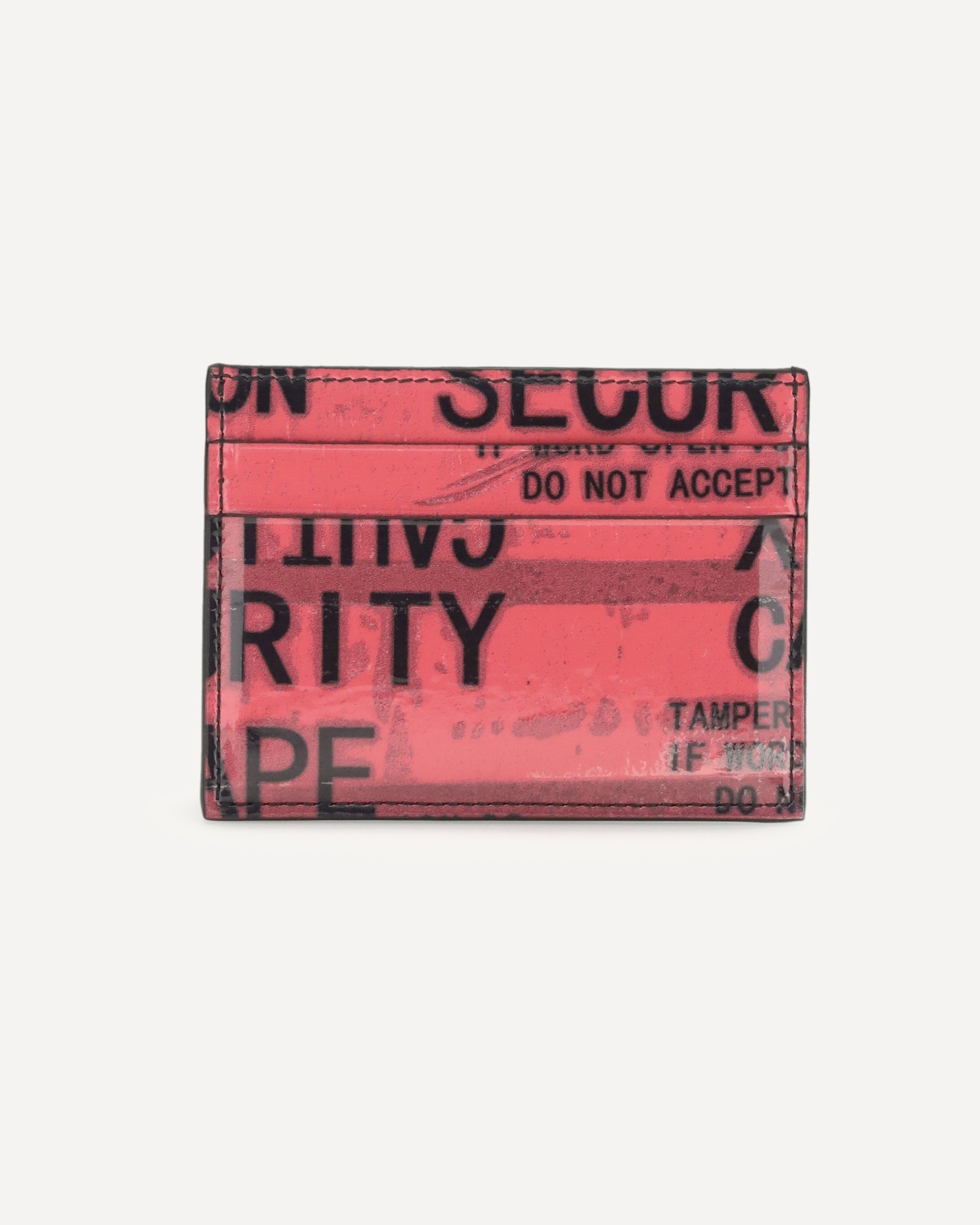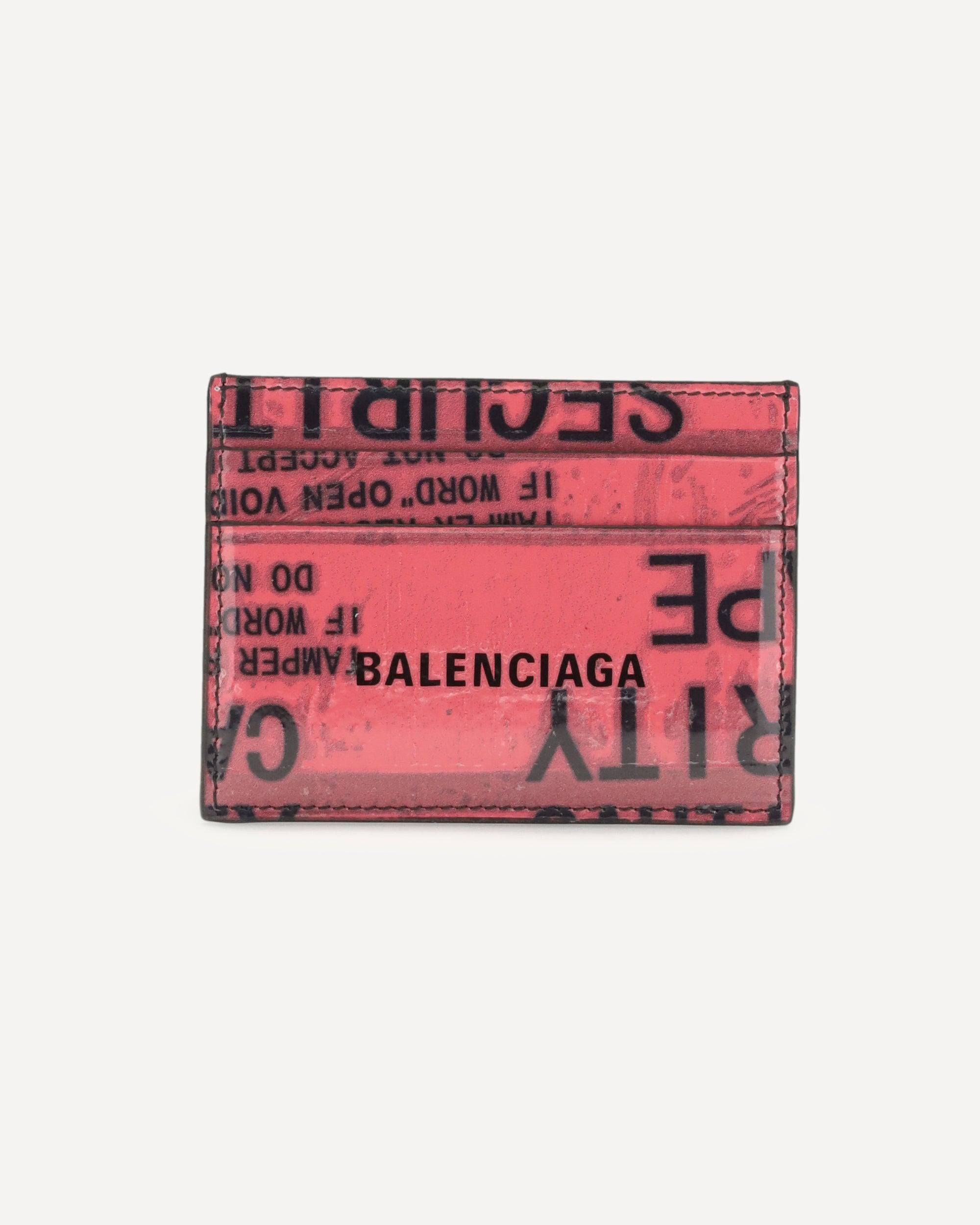 The Tape Type Card Holder by Balenciaga, crafted from fine black and red calfskin leather, combines contemporary elegance with everyday practicality. Featuring the iconic Security Tape logo, it offers four card slots and a central compartment for bills. A compact and distinctive accessory, perfect for daily use.