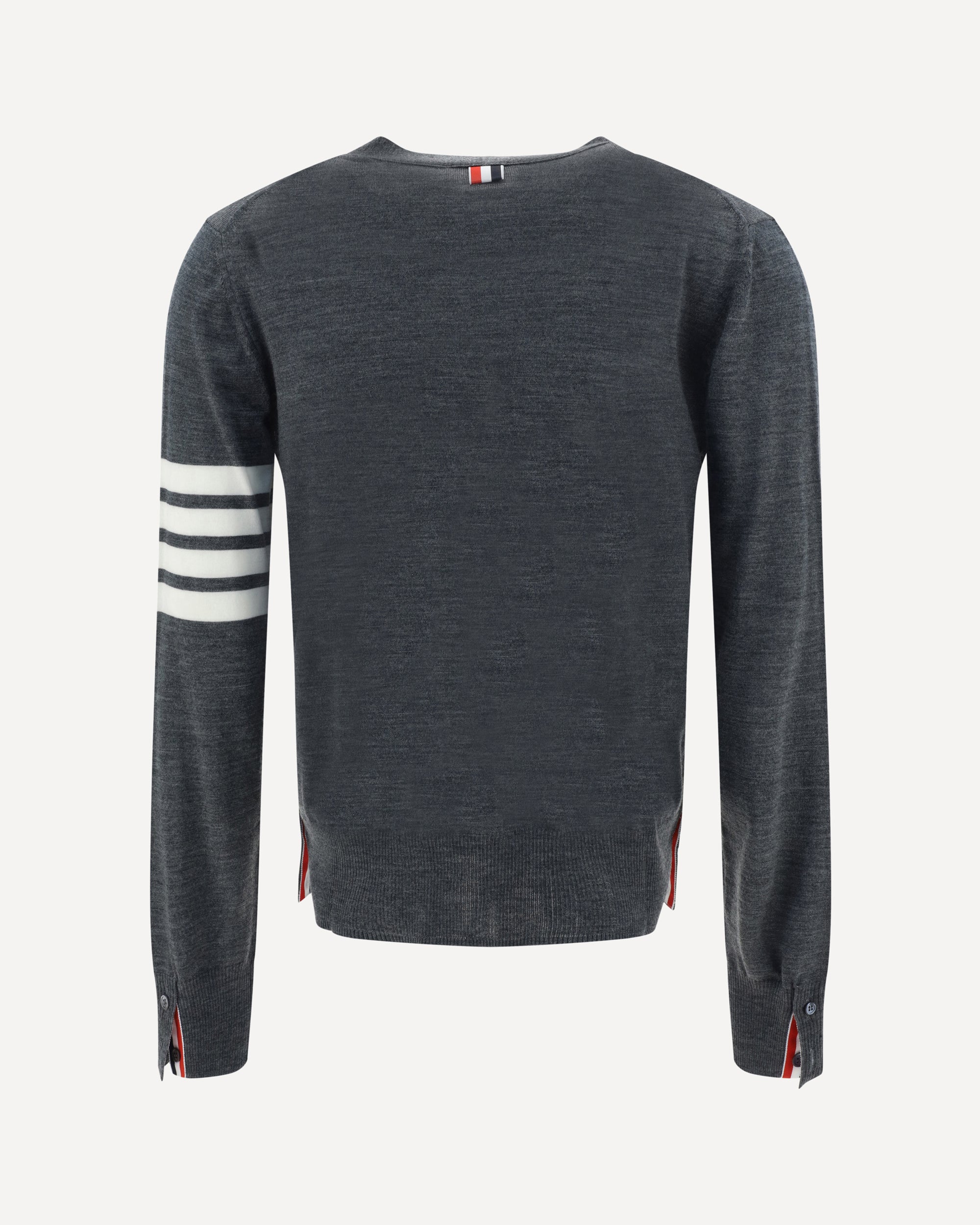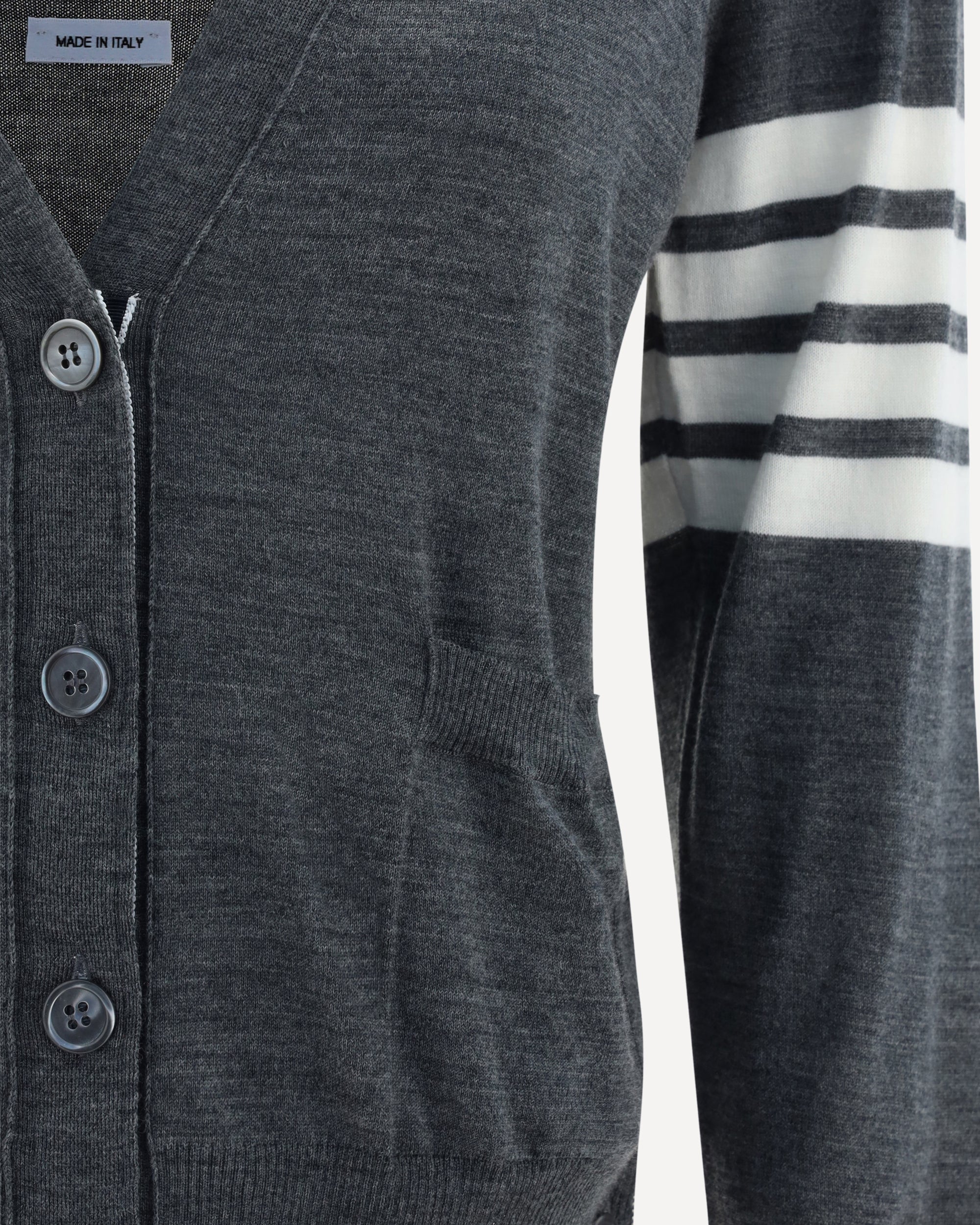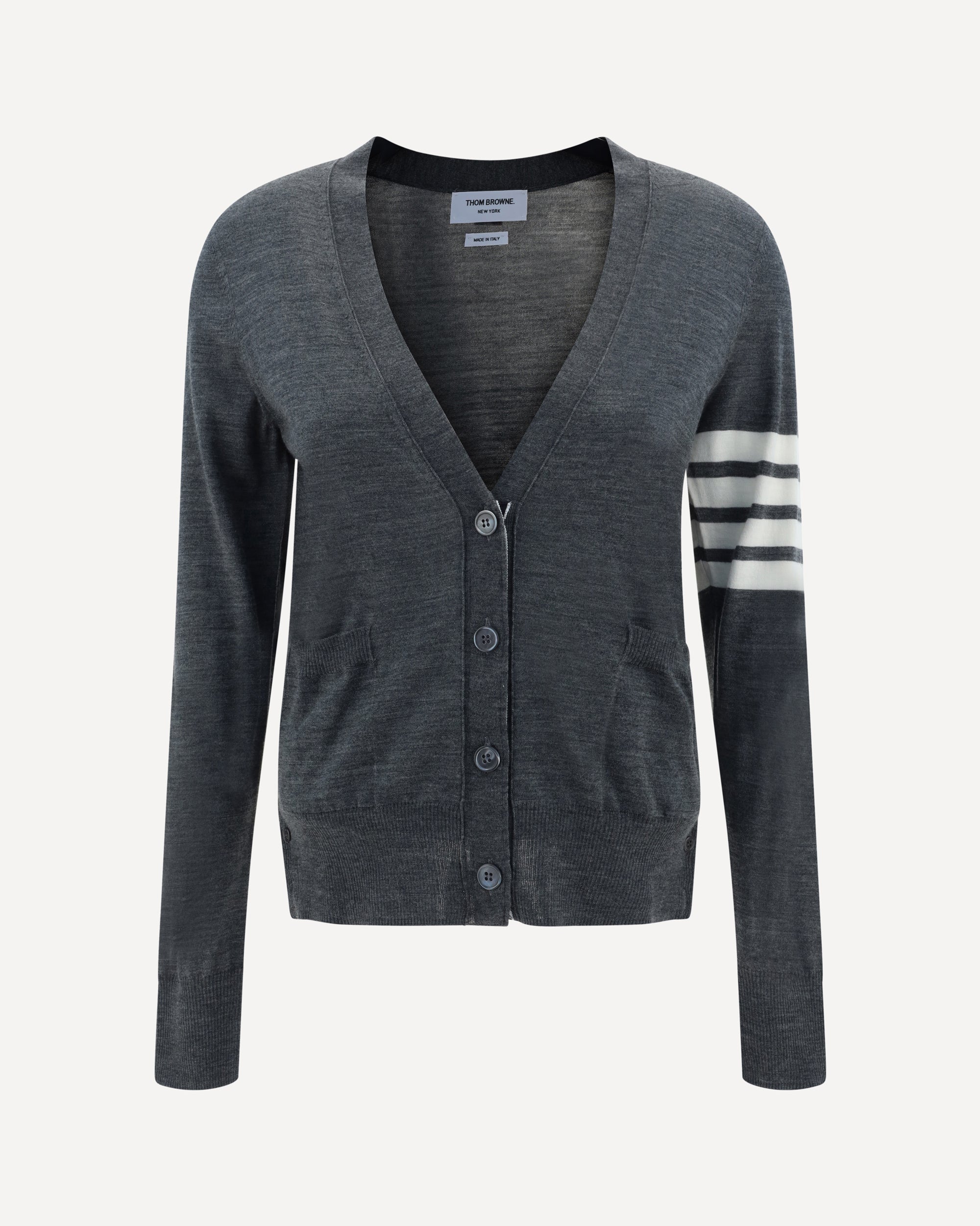 Thom Browne Cardigan made of soft merino wool, featuring a monochrome design and slim fit. Featuring a V-neck with ribbed trim, it has a front button closure and two patch pockets on the front. The brand's iconic horizontal bands decorate the left arm, adding a distinctive touch. Slight adjustable side slits with buttons complete the garment, for greater freedom of movement. A refined and versatile garment, perfect for smart or casual looks.