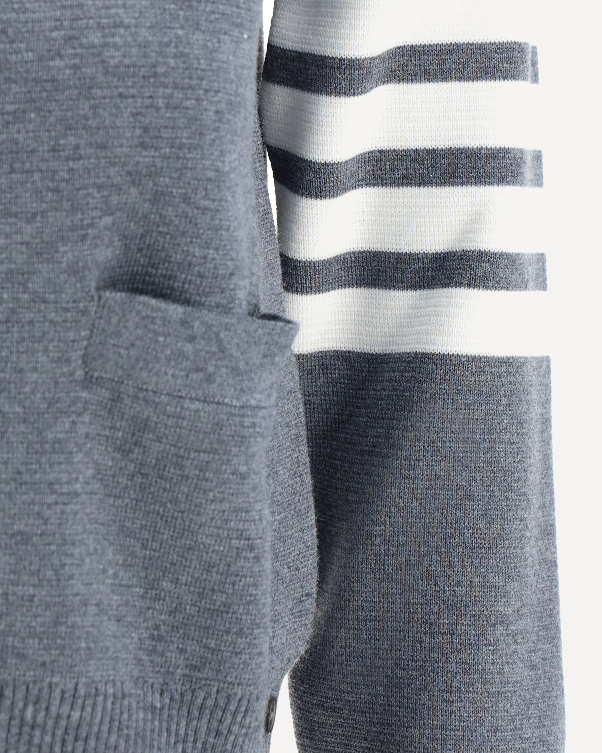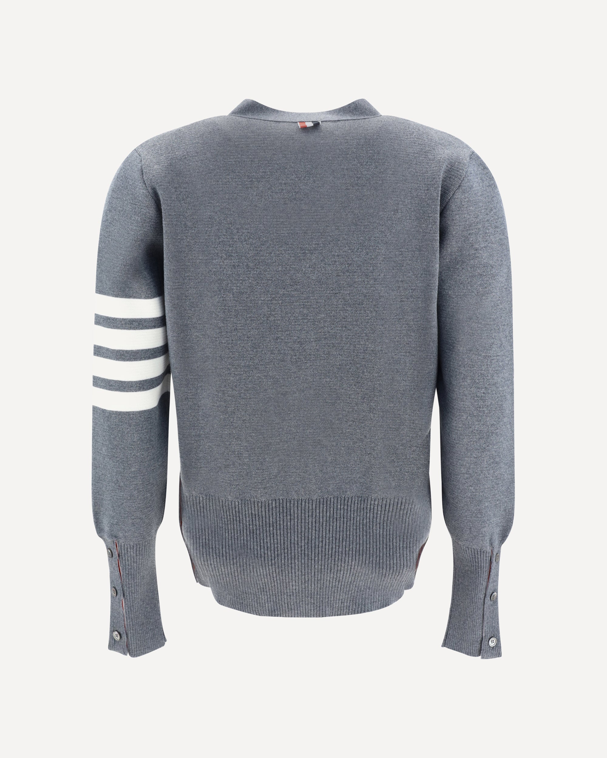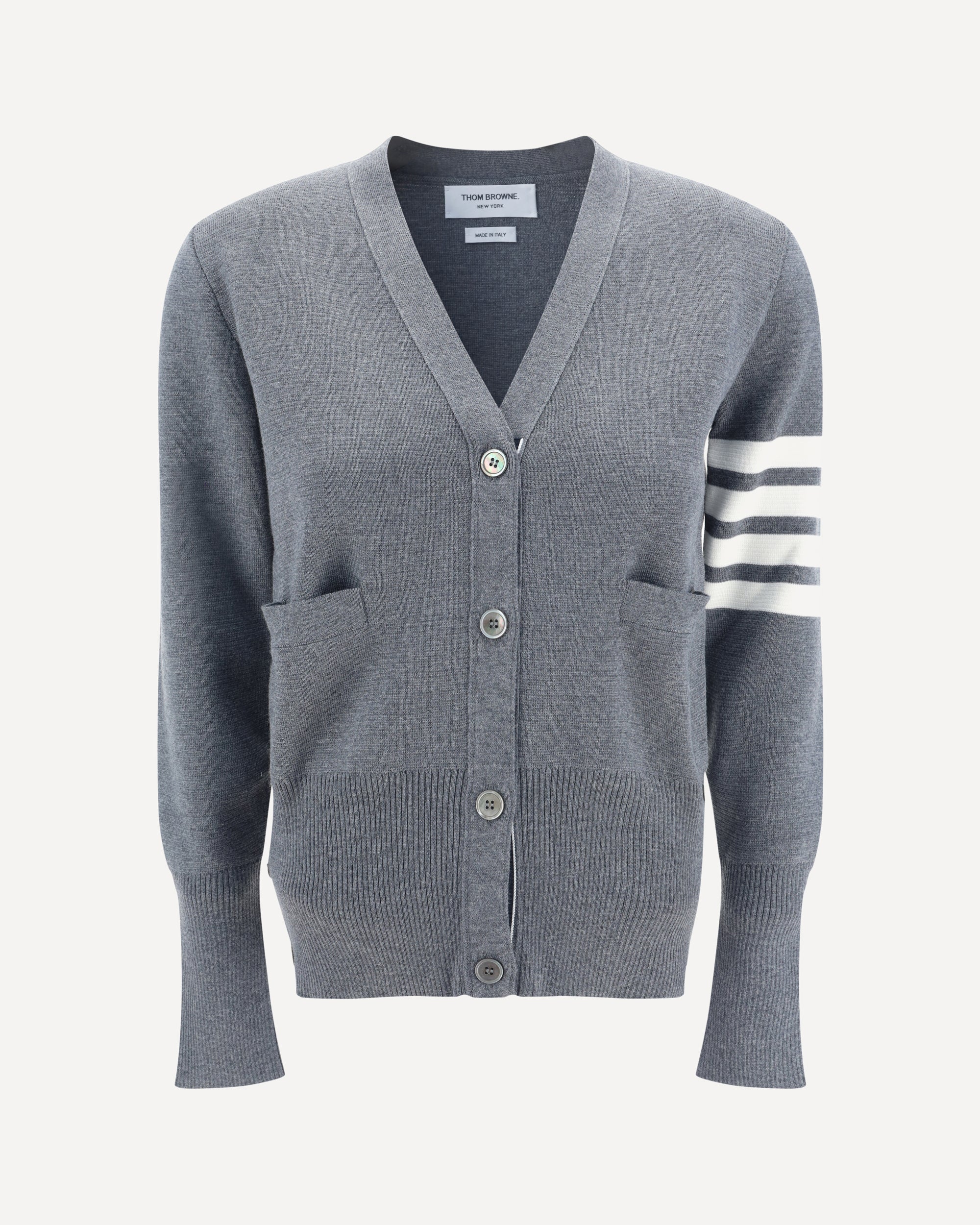 Merino Wool Cardigan by Thom Browne, contrasting button front closure, open front pockets, V-neck on front, contrasting iconic brand bands on arm, ribbed hem, ribbed cuffs.
