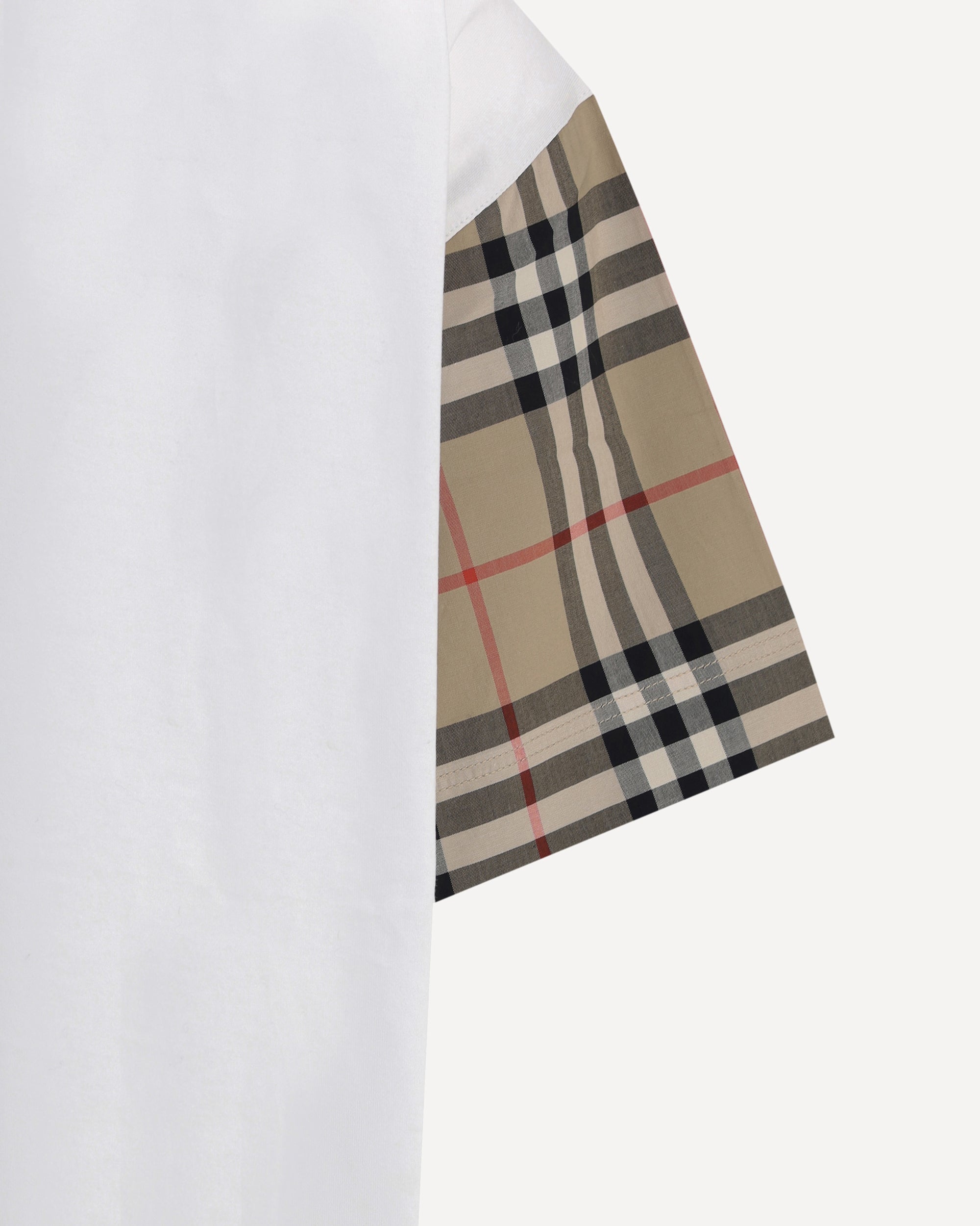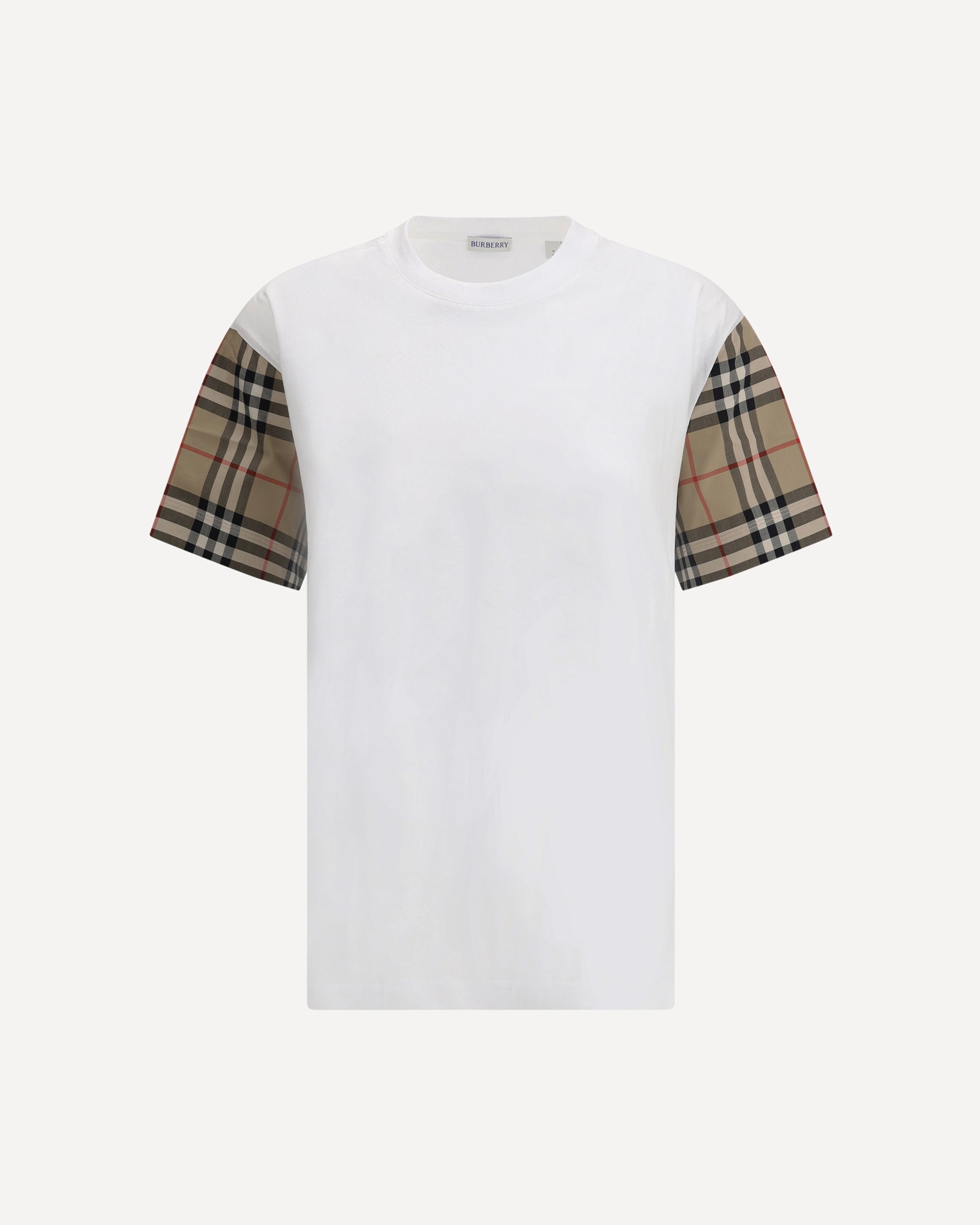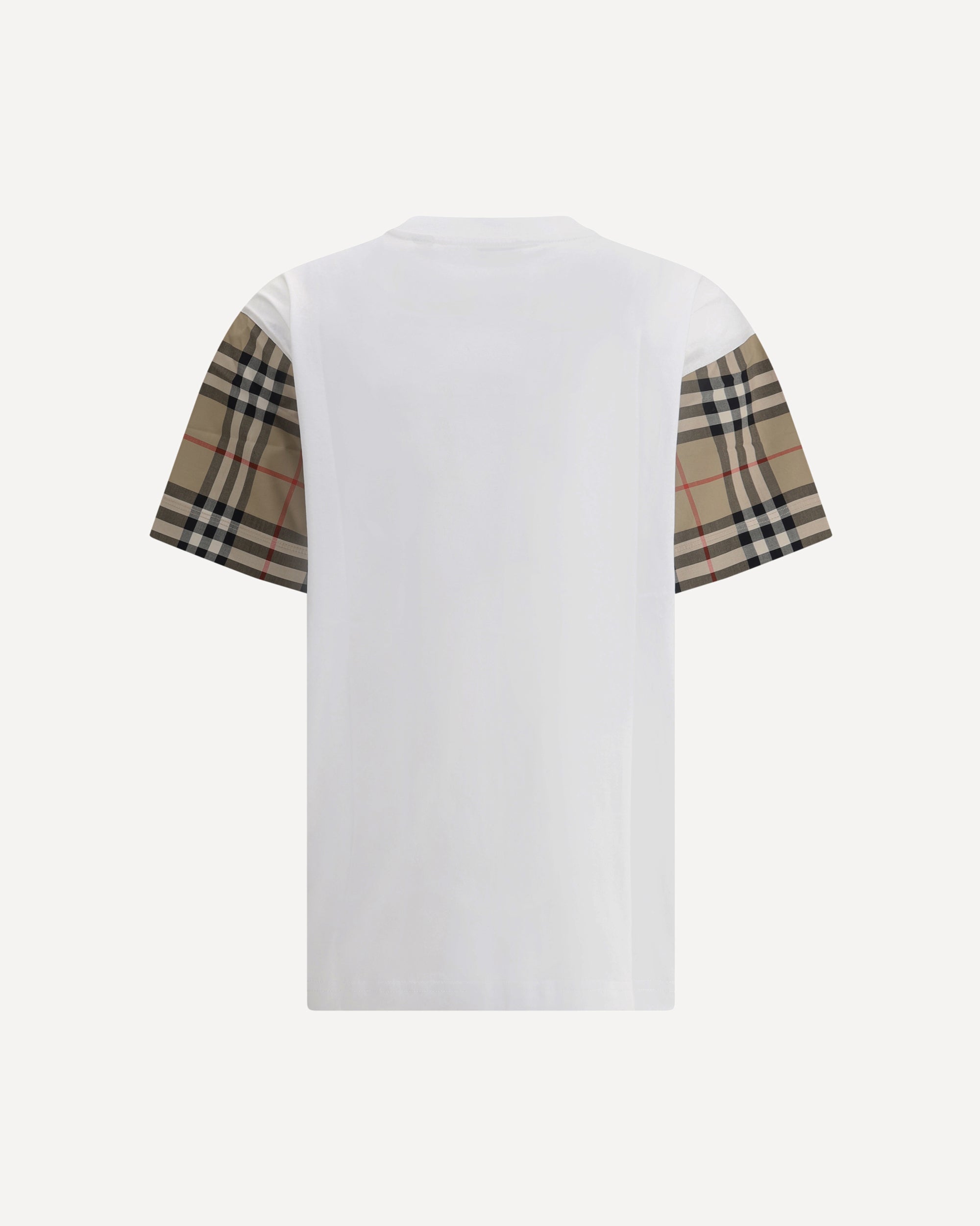 Burberry's Cotton Check Archive Sleeve T-shirt is a garment that combines comfort with distinctive style. Featuring a ribbed collar, this T-shirt features sleeves embellished with the iconic Archivio Check pattern, one of the brand's historic motifs. The simple, clean design of the T-shirt body highlights the sleeves with the famous pattern, creating a stylish and recognizable contrast.