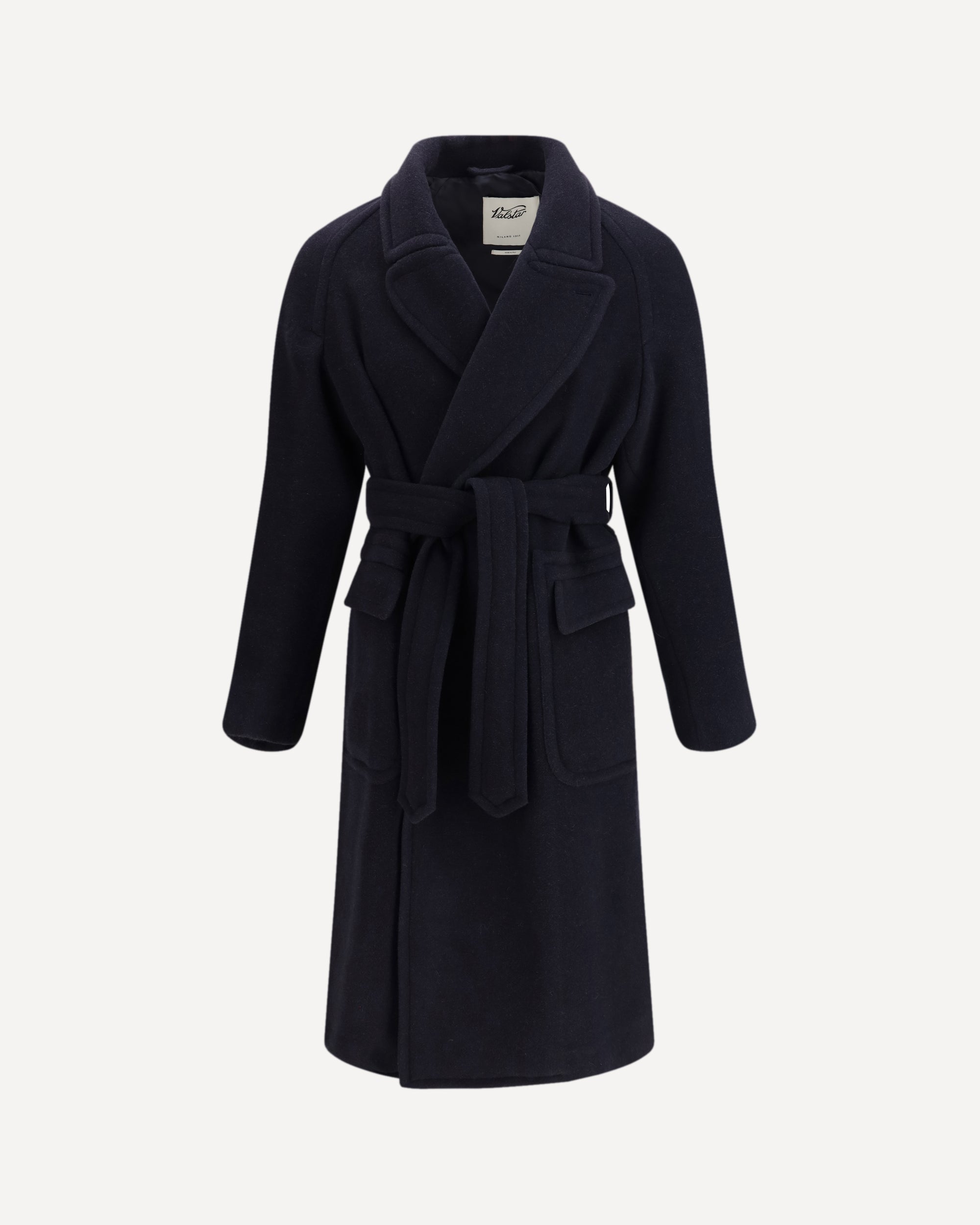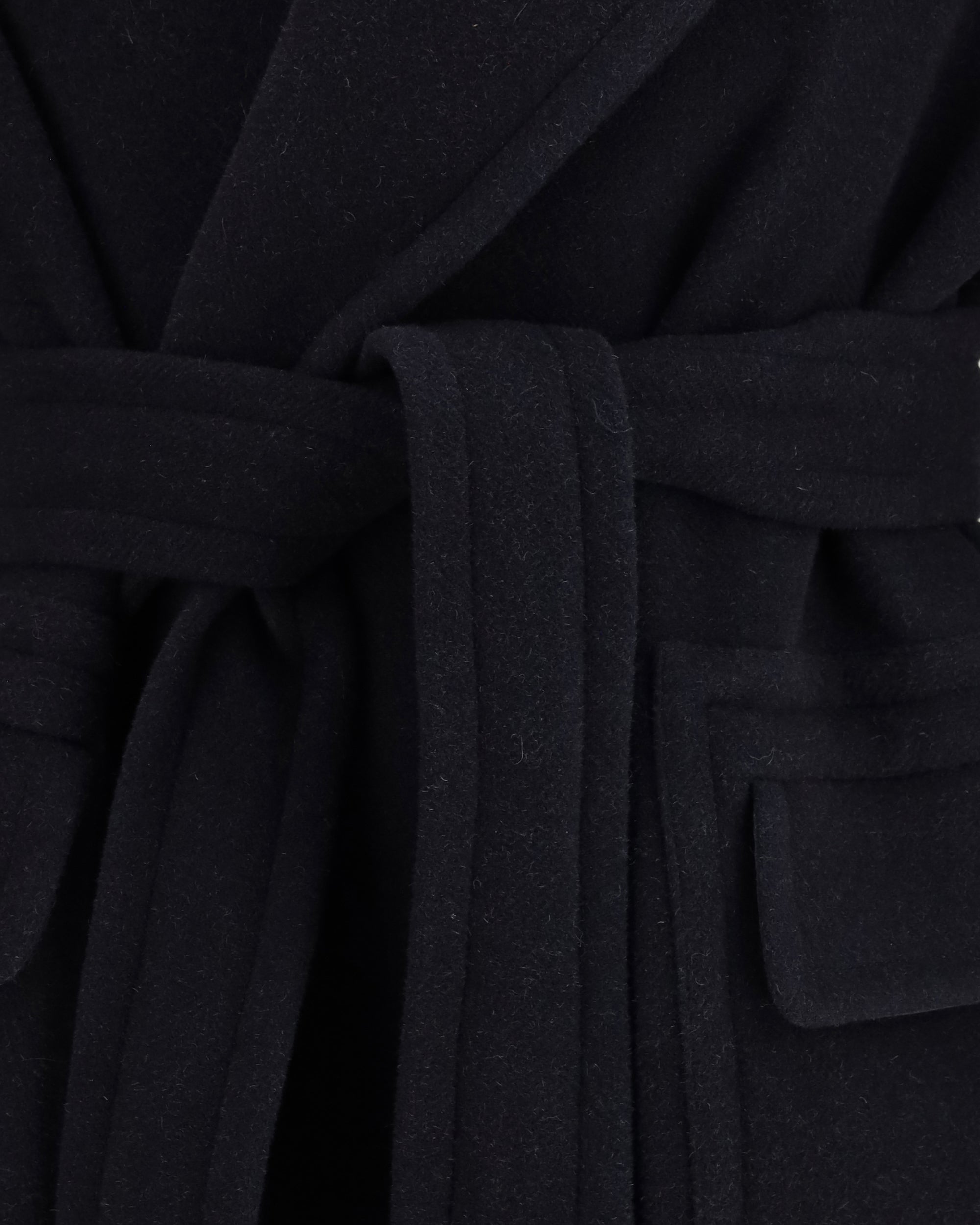 The wool robe Coat by Valstar is an elegant and sophisticated piece, featuring a maxi peaked lapel that enhances the silhouette. The matching sash, which can be tied at the waist, allows you to customize the fit, while belt loops add a touch of practicality. The two patch pockets on the front, with flaps, complete the design, lending a refined yet functional air. Perfect for a chic and versatile look.