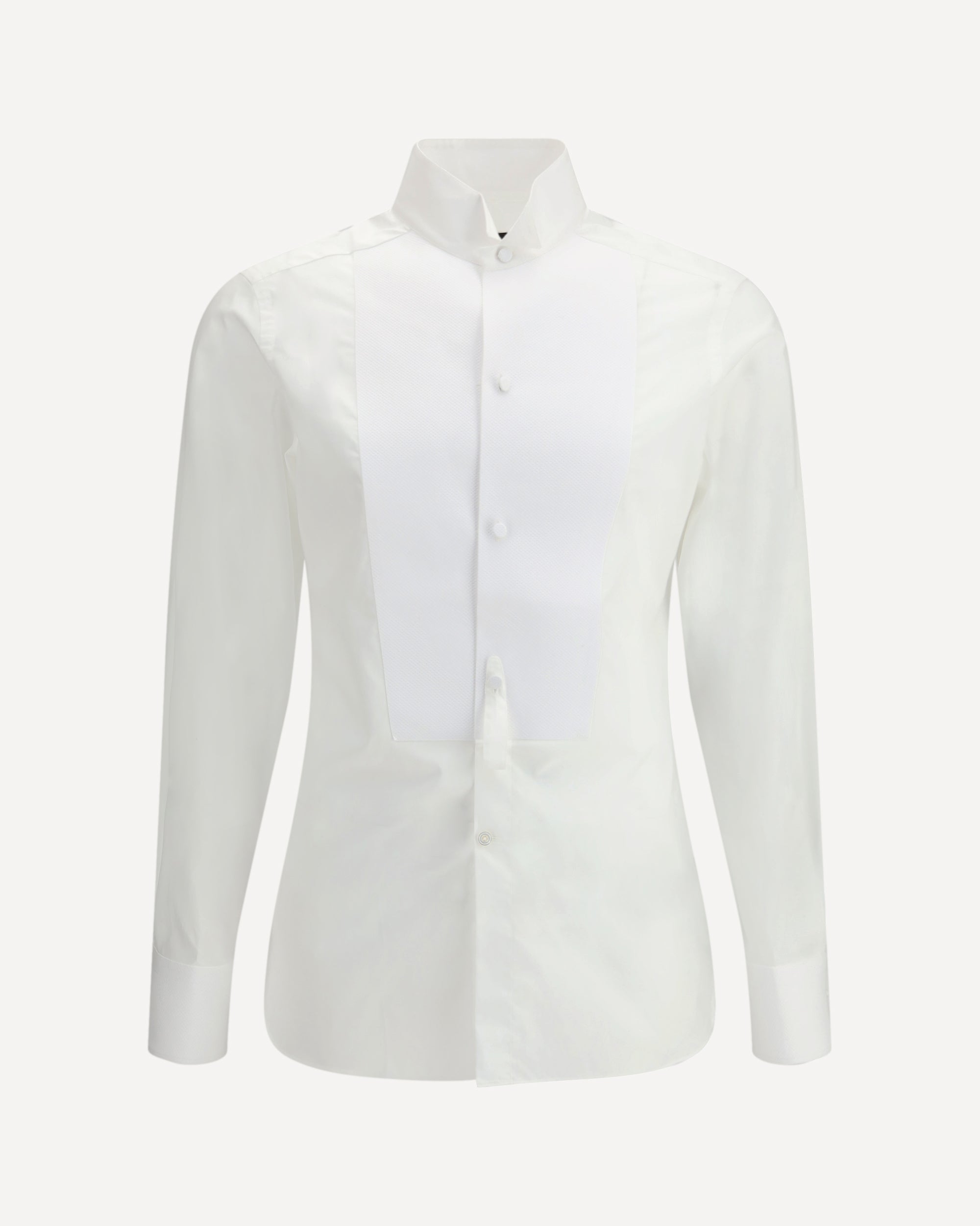 The cocktail Shirt in voile by Tom Ford embodies the brand’s signature blend of sensuality and sophistication. Crafted from lightweight voile, it features a slim fit that elegantly enhances the silhouette. The design includes a clean front button closure and buttoned cuffs, highlighting Tom Ford’s impeccable tailoring. Perfect under an evening jacket or worn alone, it adds a modern and refined touch to any formal look.