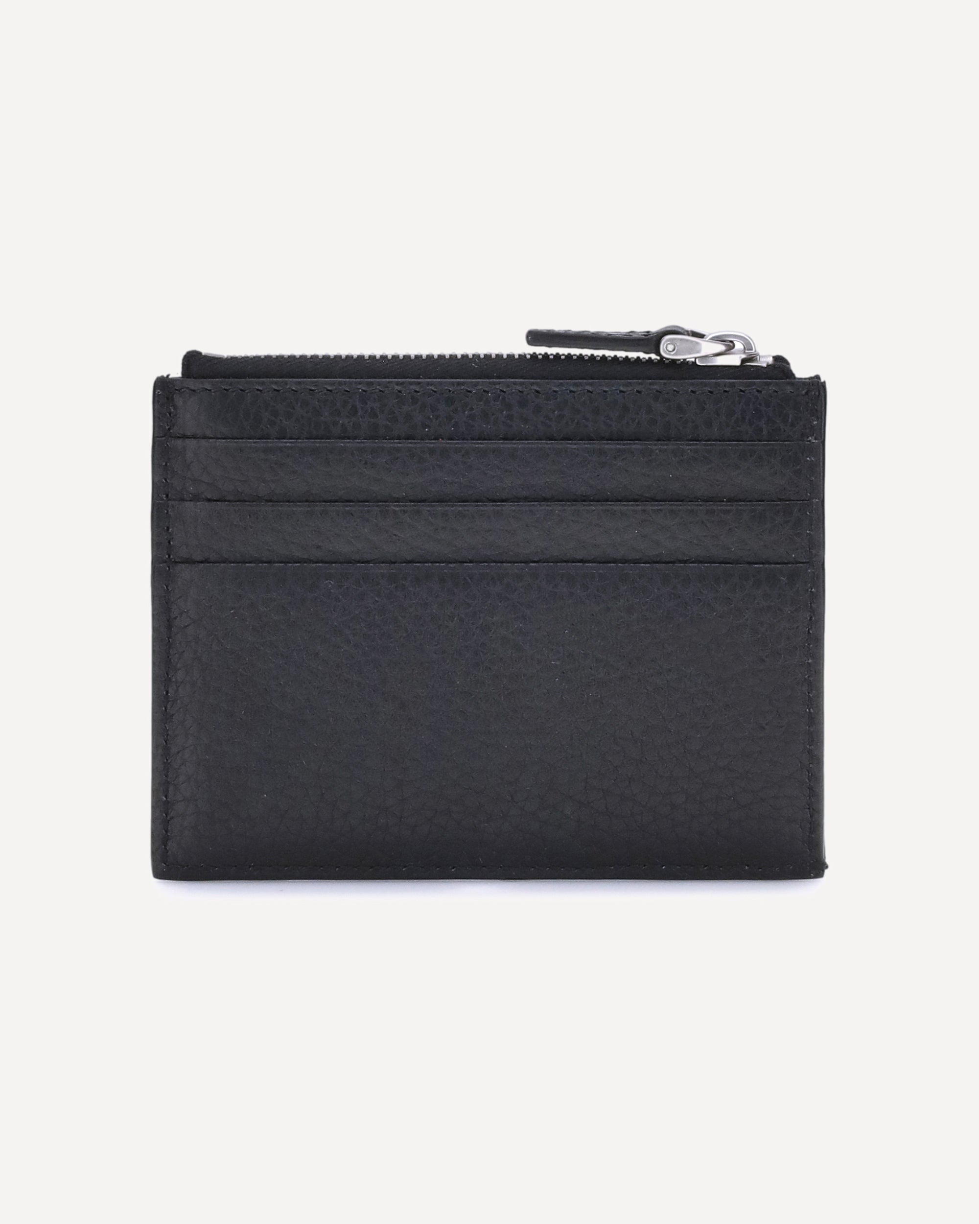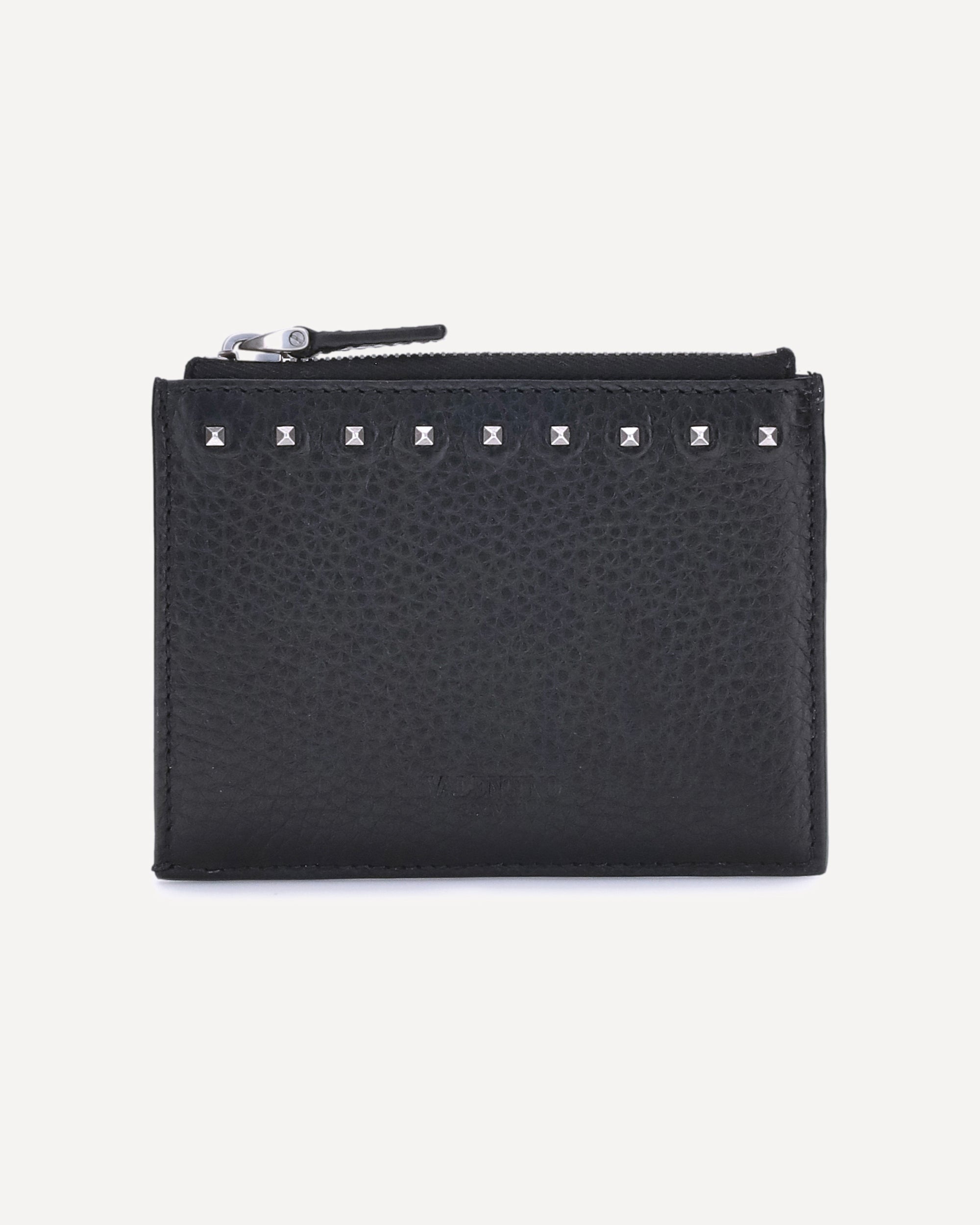 Valentino Garavani's grained leather Rockstud Card Holder features a compact and sophisticated design. Featuring the iconic Rockstud studs applied on the front, it features a welt pocket with top zipper closure, ideal for storing coins or small items. The back panel features practical card slots, perfect for organizing essentials in style. An elegant and functional accessory, an expression of the maison's distinctive aesthetic.
