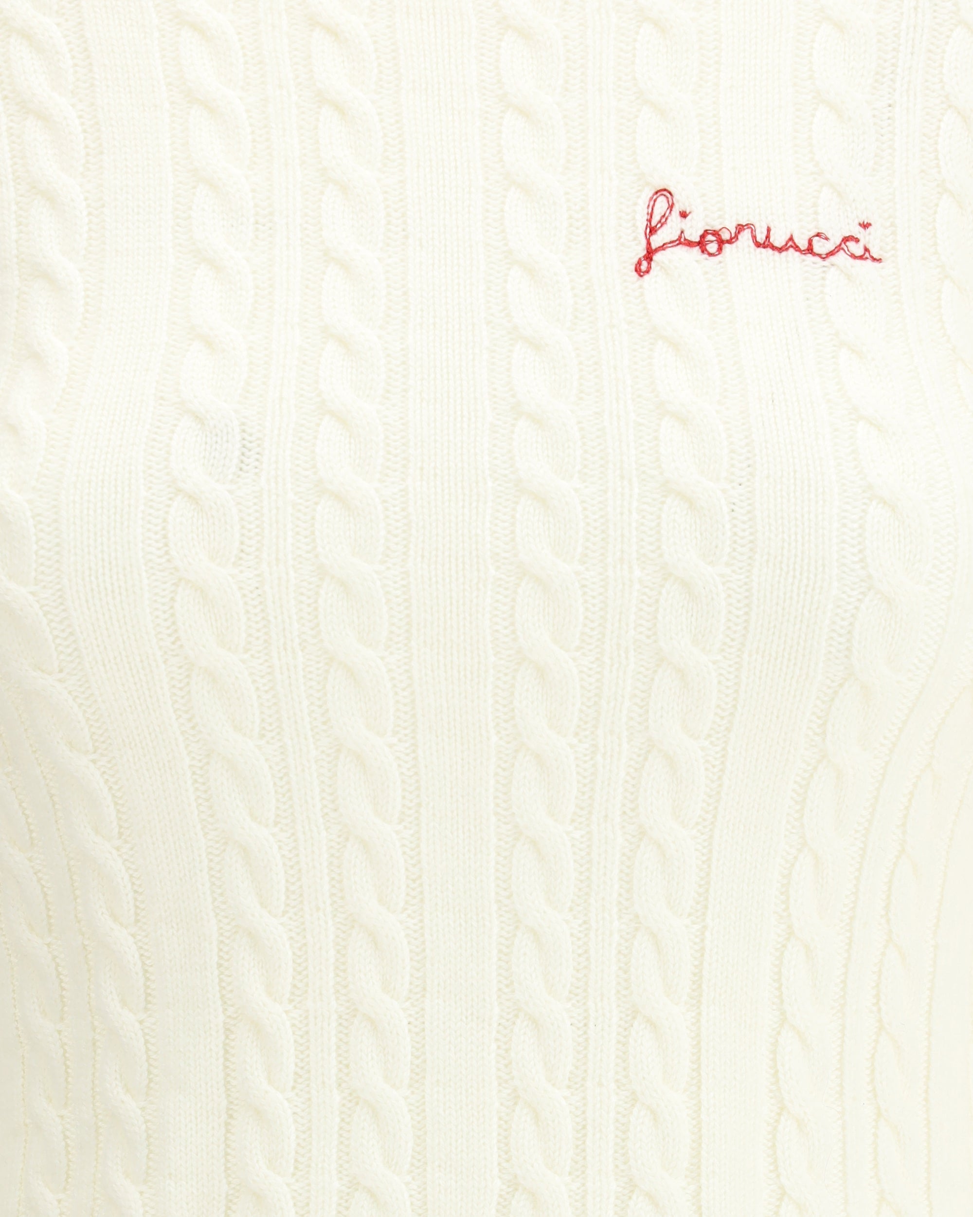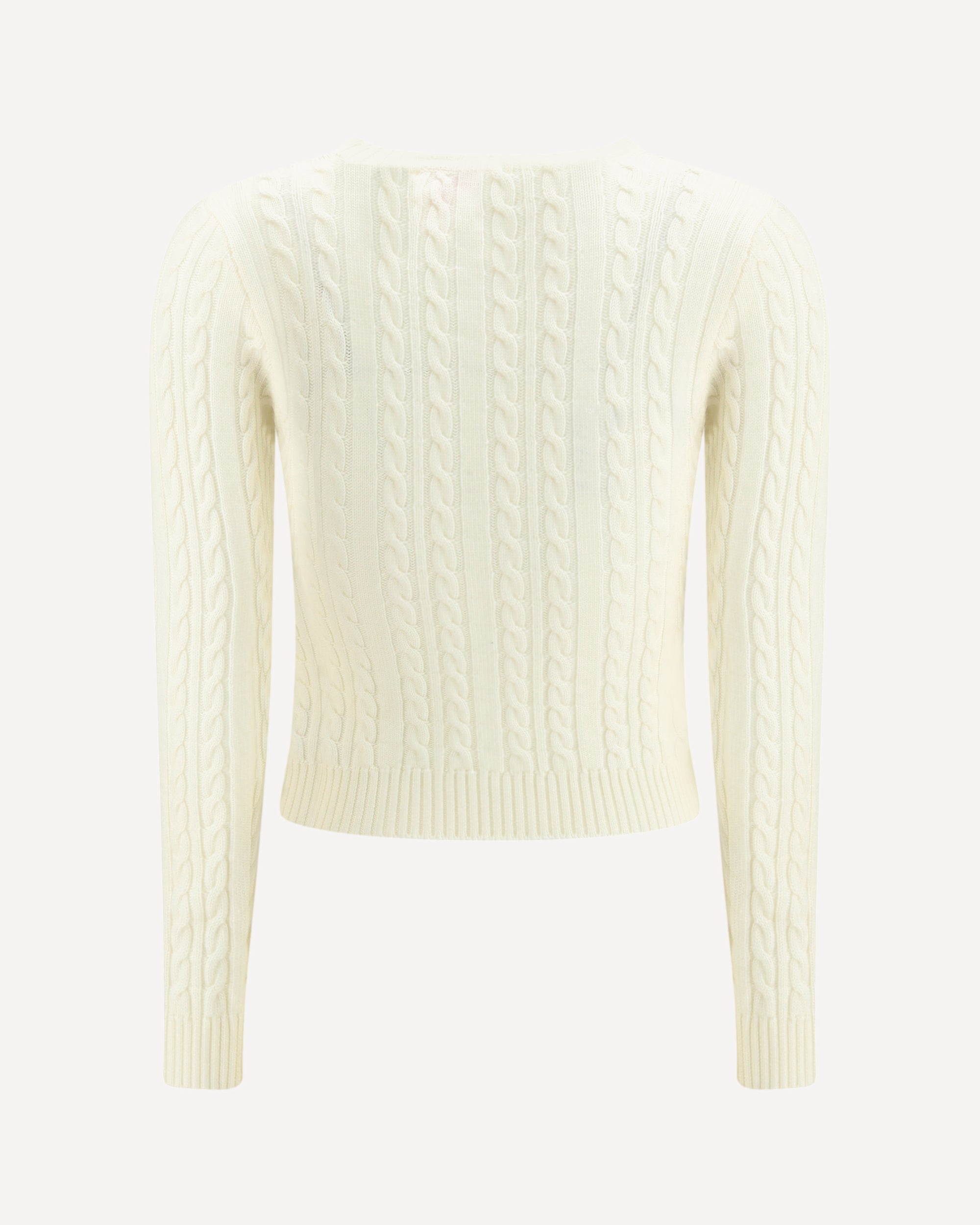 The Cableknit Logo Crop Jumper by Fiorucci is crafted from soft extrafine merino wool and features a classic cable knit texture. The cropped design flatters the silhouette, while long sleeves, a crew neck, and ribbed hems ensure comfort and structure. The jumper is embellished with the red Fiorucci logo embroidery on the front a signature detail of the brand. Made in Italy, it combines artisanal craftsmanship with a modern and playful spirit.