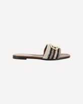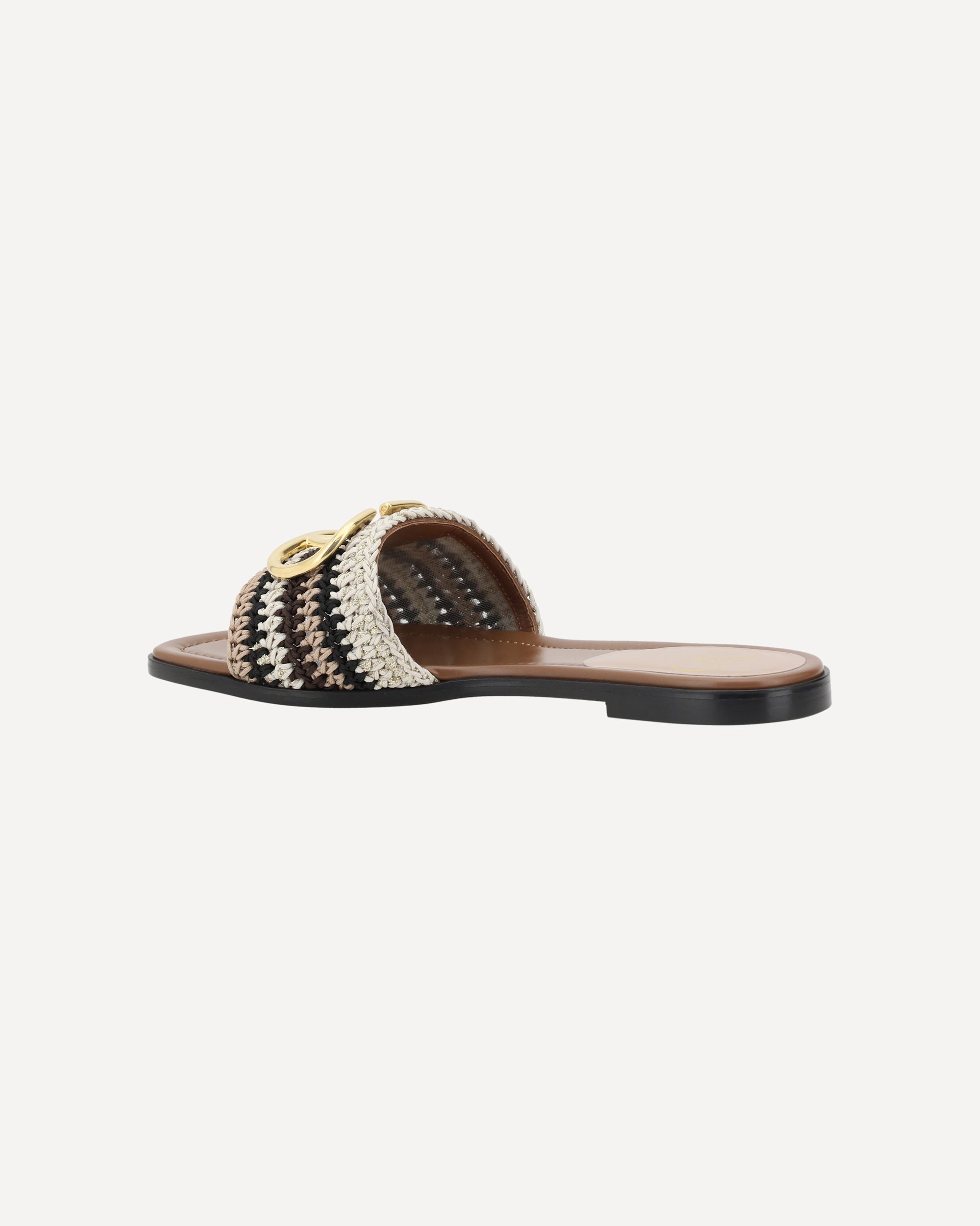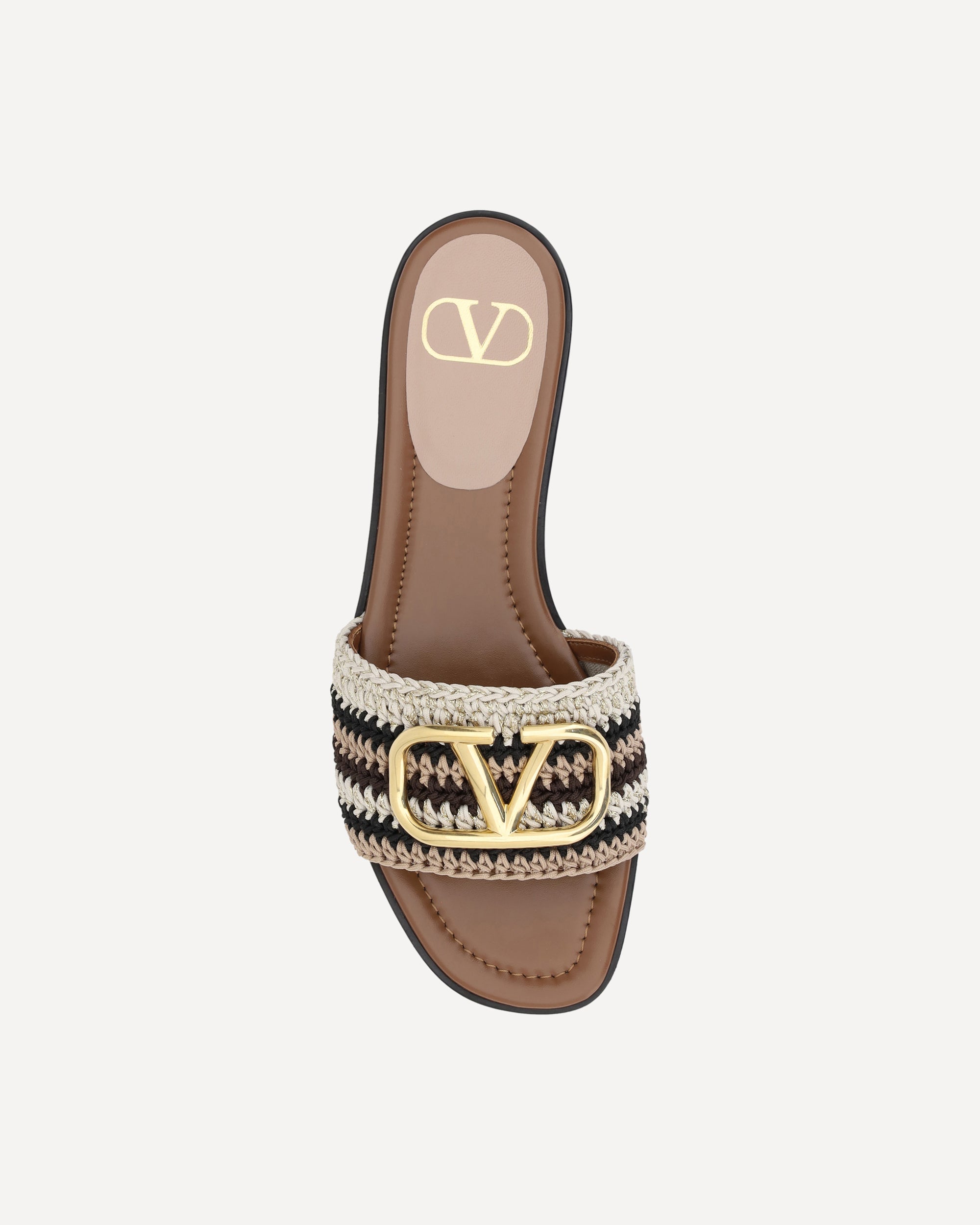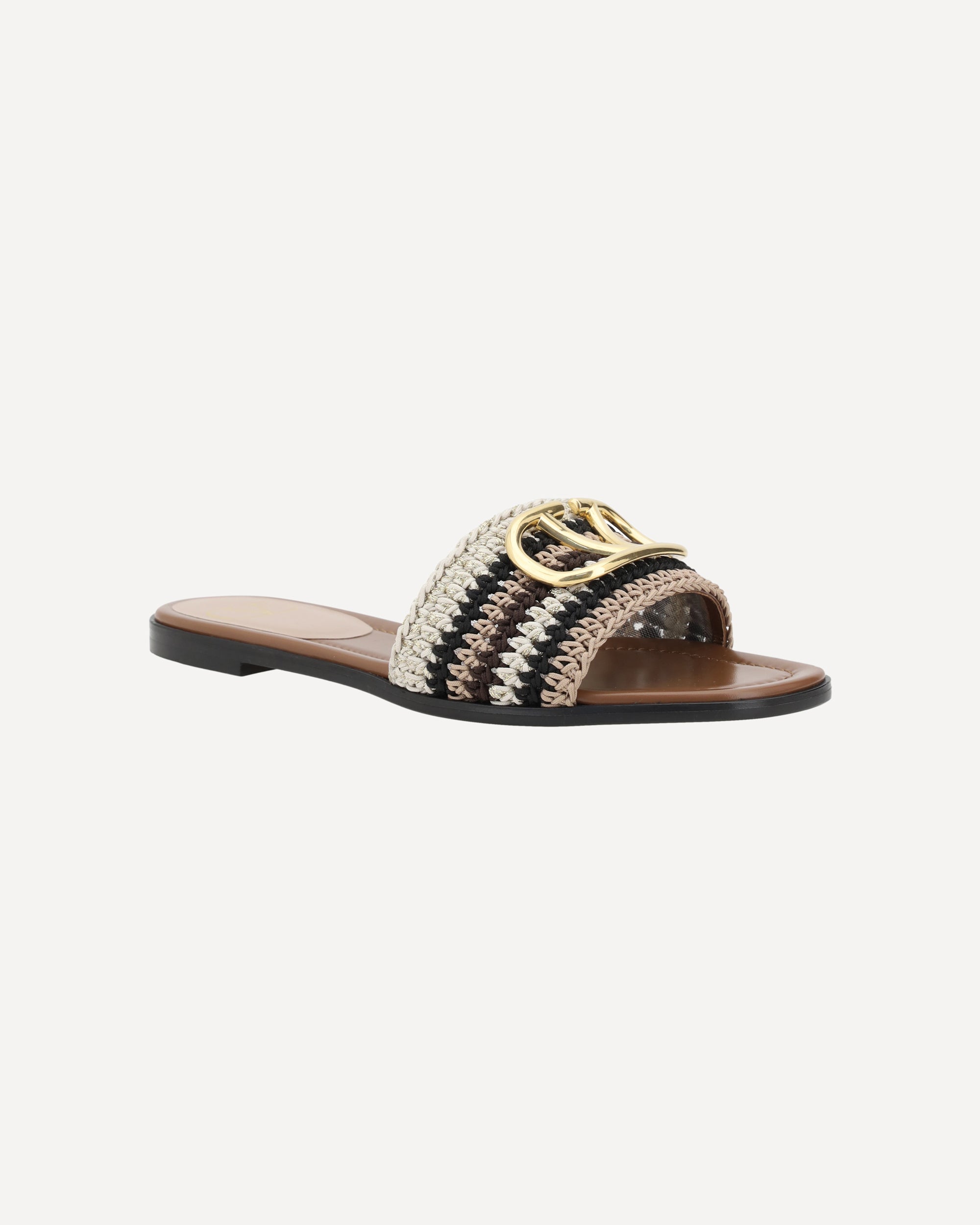 Valentino Garavani's Sandals feature a squared toe that gives them a bold, modern design. The iconic VLogo plaque is applied to the front strap, adding a distinctive touch of the brand. The multicolored crochet-effect design enriches the shoe with a sophisticated and original pattern. The logoed insole emphasizes the brand identity, while the flat sole ensures comfort and practicality. An elegant and contemporary model, perfect for a casual yet trendy look.