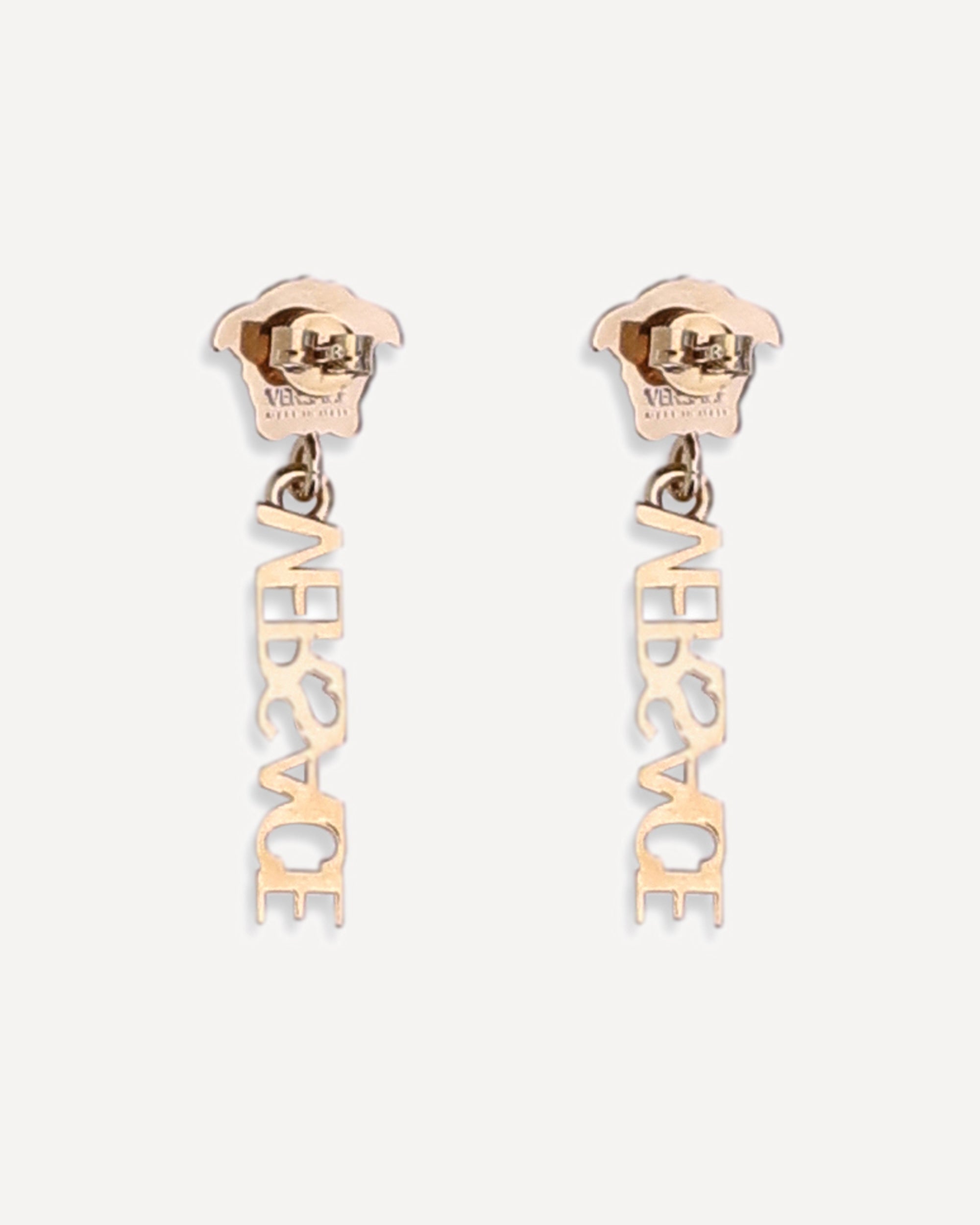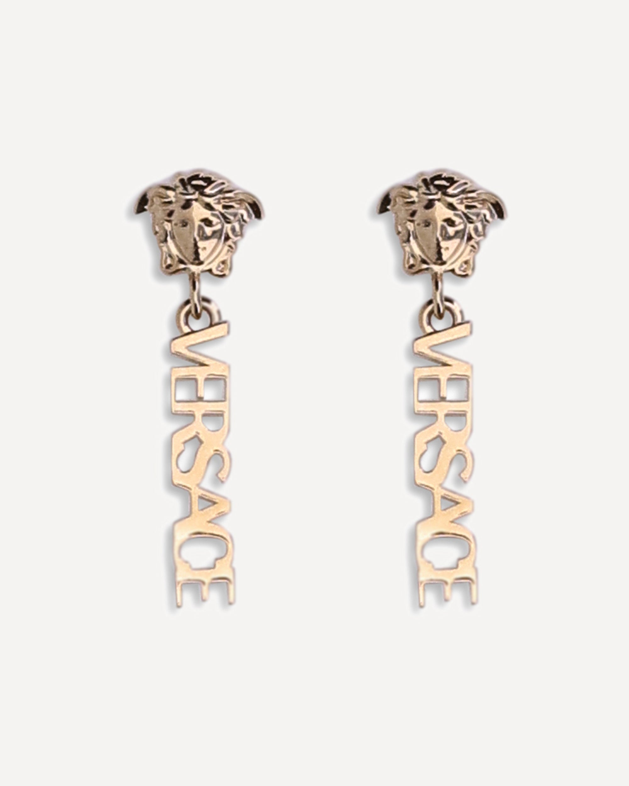 Versace Medusa Earrings are an elegant and visually striking accessory, embellished with small Medusa studs and long pendants with the Versace logo writing. Featuring a pin and butterfly closure, they combine refinement and boldness, perfect for completing the look with an iconic and distinctive touch.