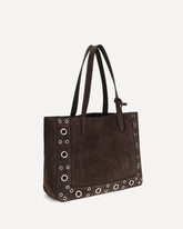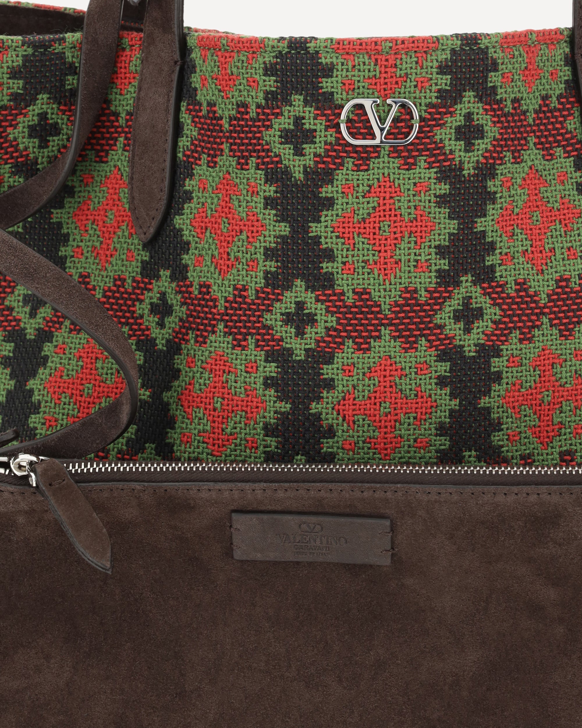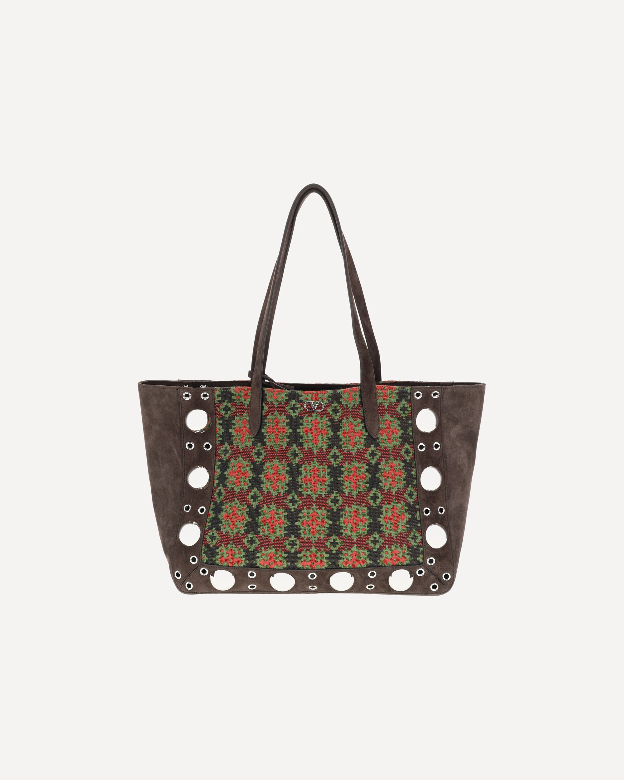 Valentino Garavani's Nellcote Tote Bag is a combination of elegance and practicality, crafted from suede and embellished with geometric cross-stitch embroidery on one side. The sophisticated design is enhanced by an iconic VLogo plaque on the front and ball studs on the front and back, accentuating its bold character. Featuring two top handles, the bag offers a removable pouch and a single compartment inside, ensuring convenient organization. A luxury accessory perfect for any occasion.