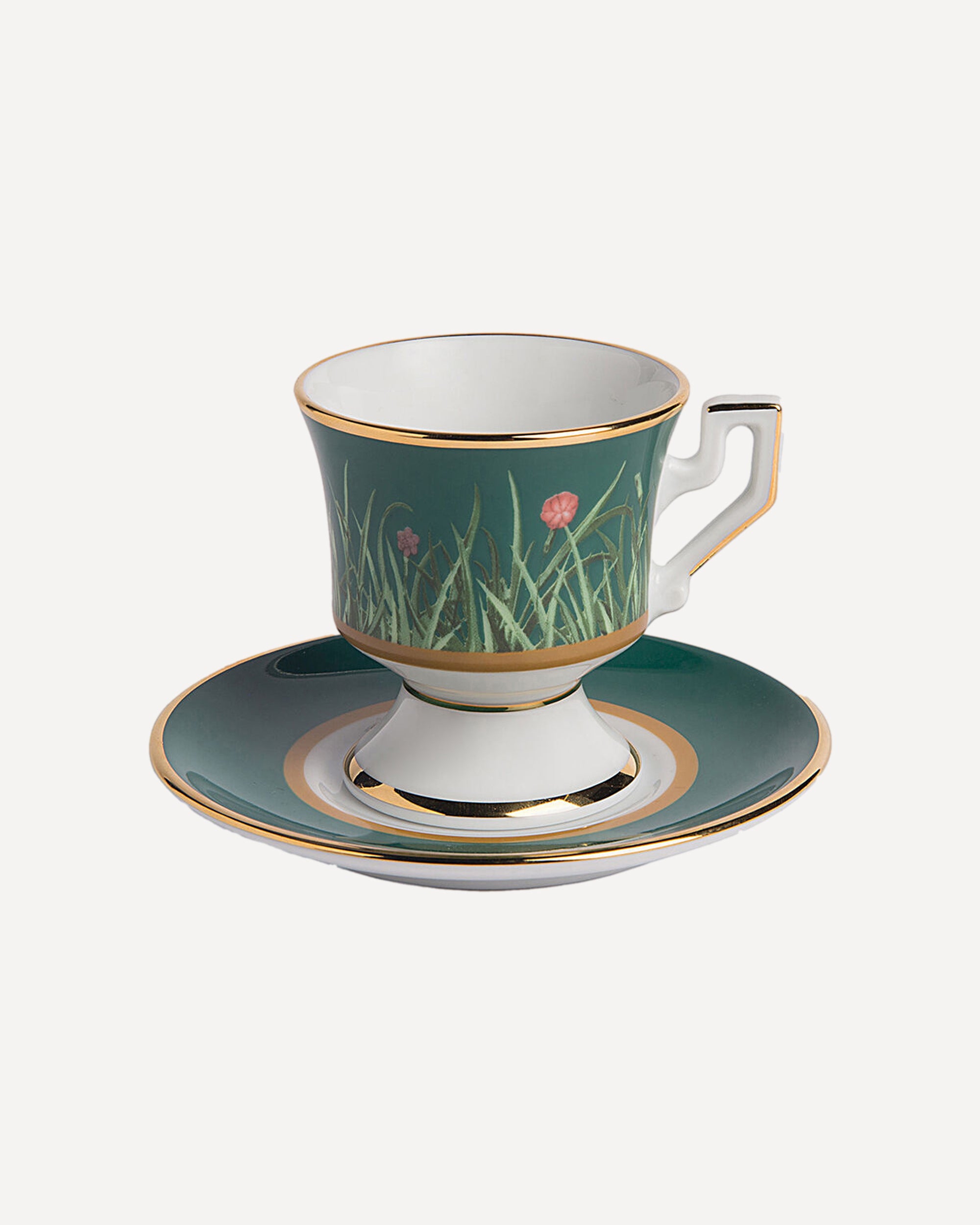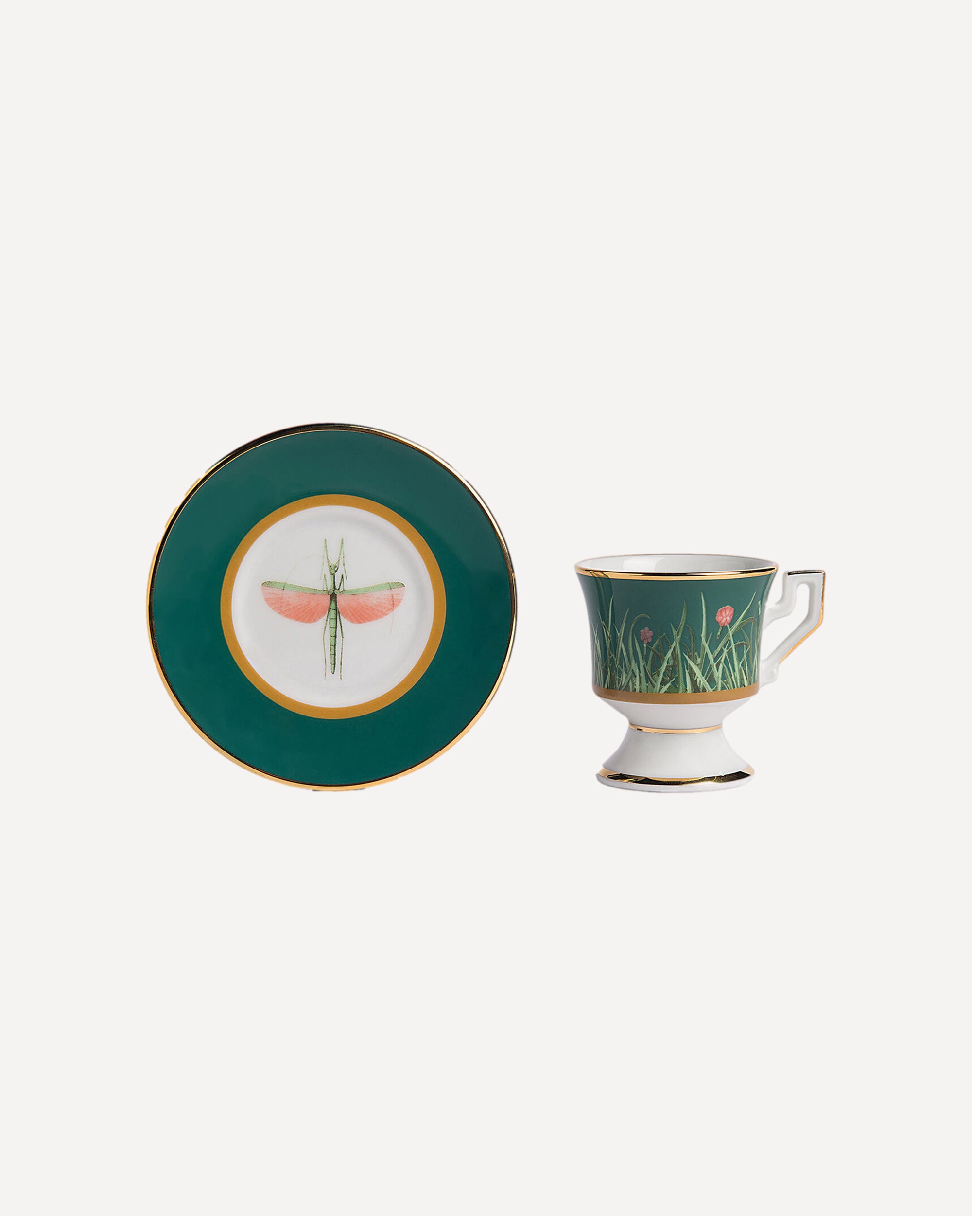 The Set of two Cups by La Double J with saucer is made of the finest quality Italian porcelain and embellished with a hand-painted 18-karat gold decoration. The cups feature a refined border adorned with spring buds, while the saucers are decorated with a delicate ladybug motif. An elegant set full of poetic details, perfect for making every coffee moment special.