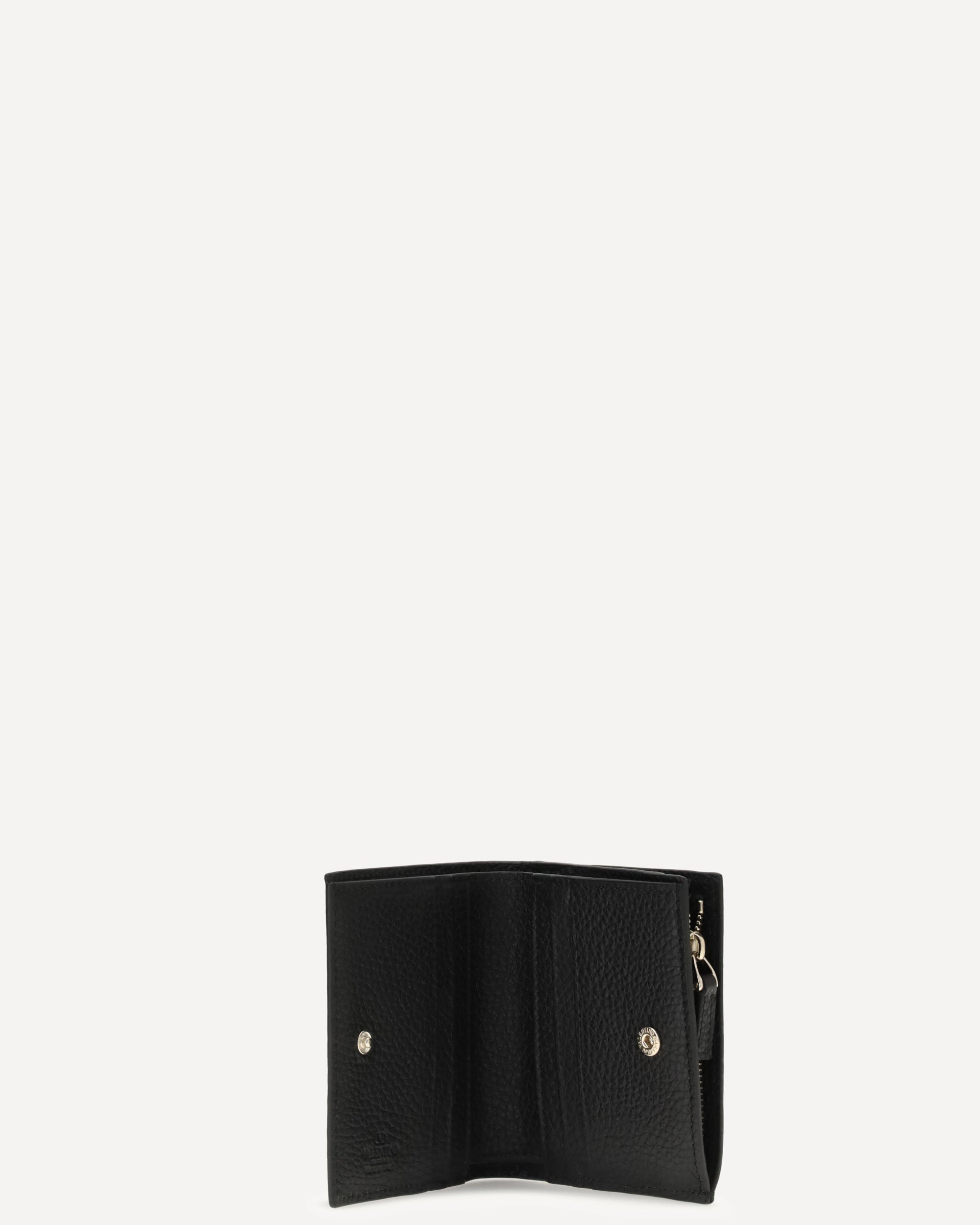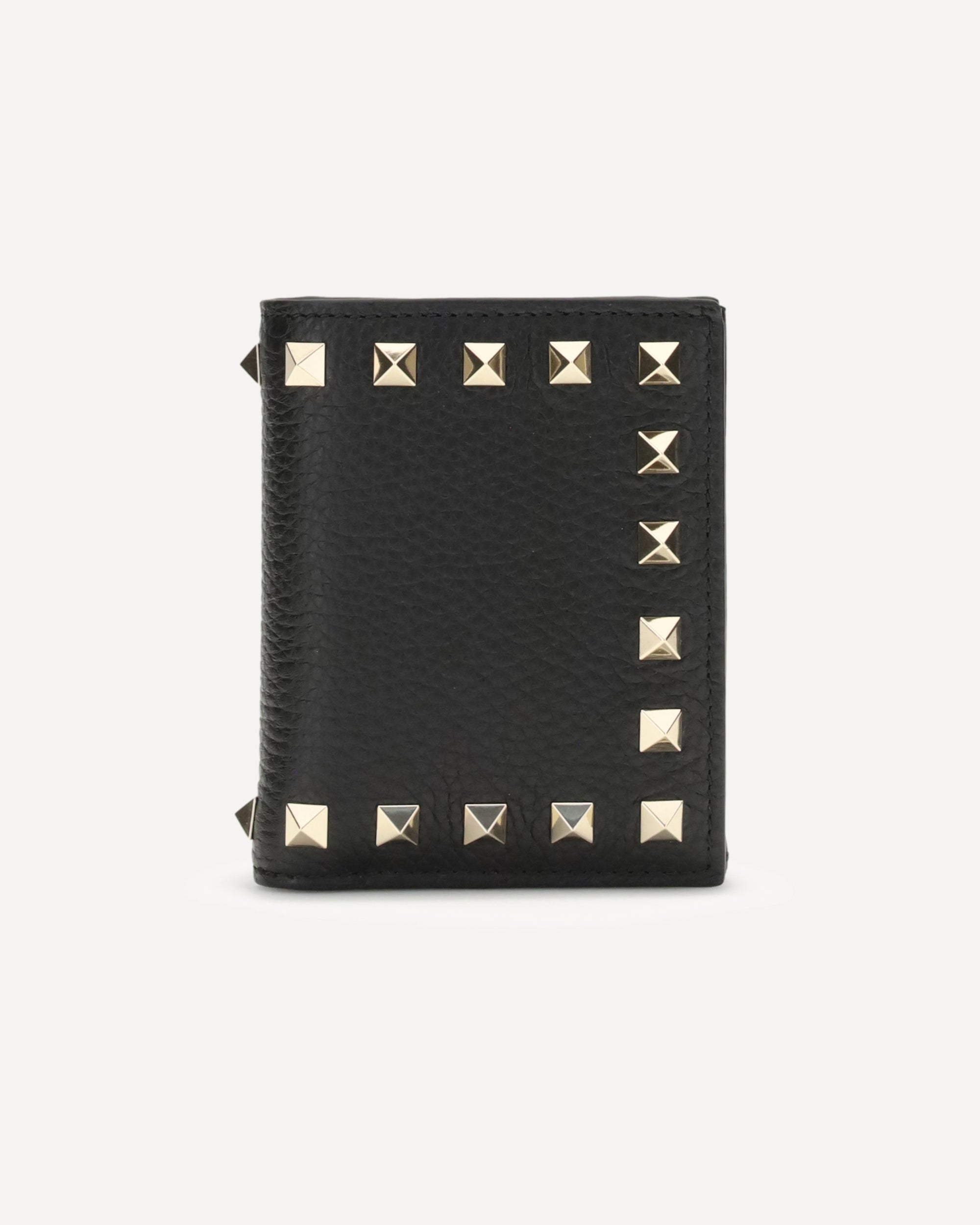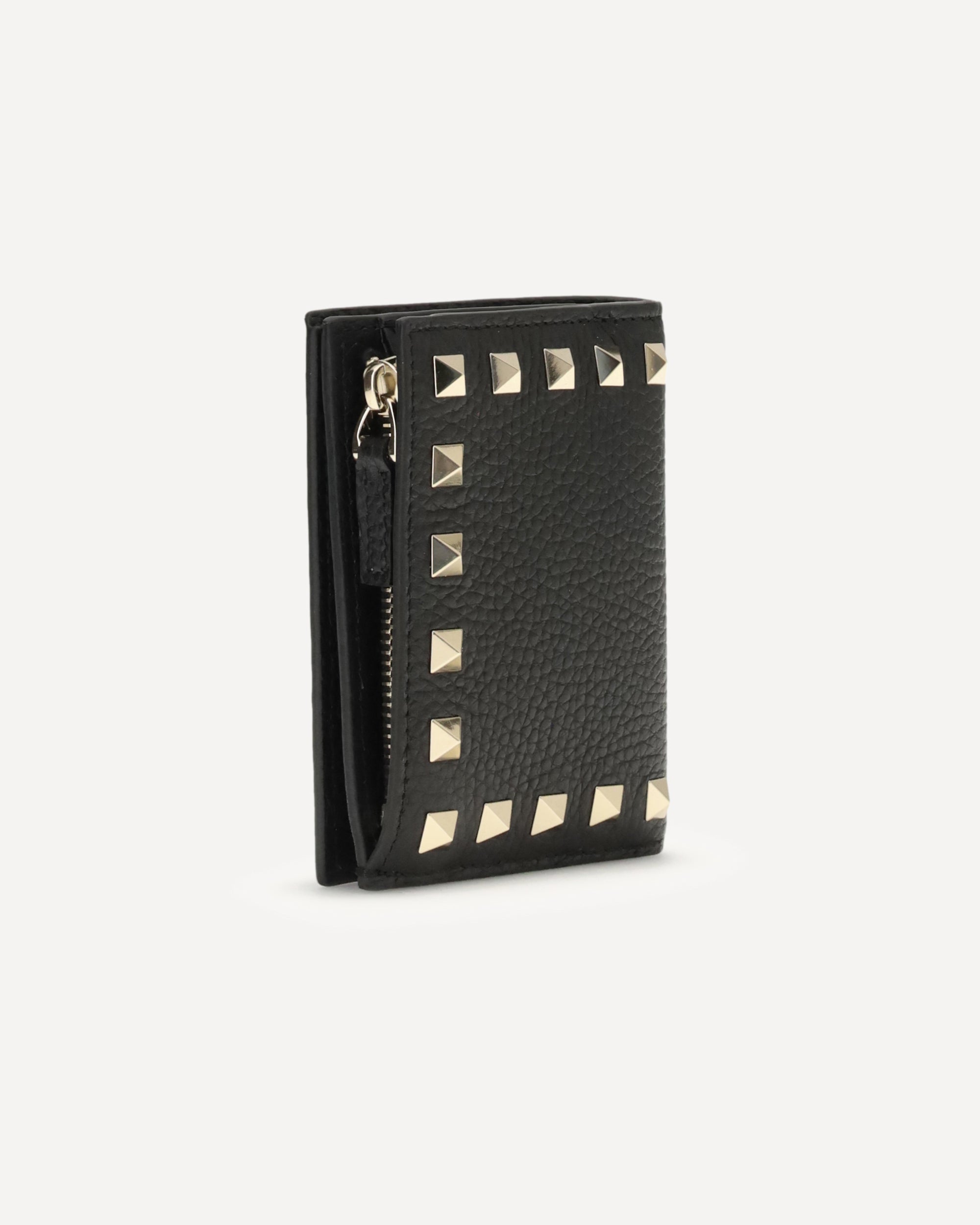 The Rockstud Wallet by Valentino Garavani is crafted from grained calfskin and embellished with the iconic platinum-finish studs. Compact yet functional, it features a snap-button closure, six card slots, a zipped coin pocket, and a bill compartment. A practical accessory with a bold touch.
