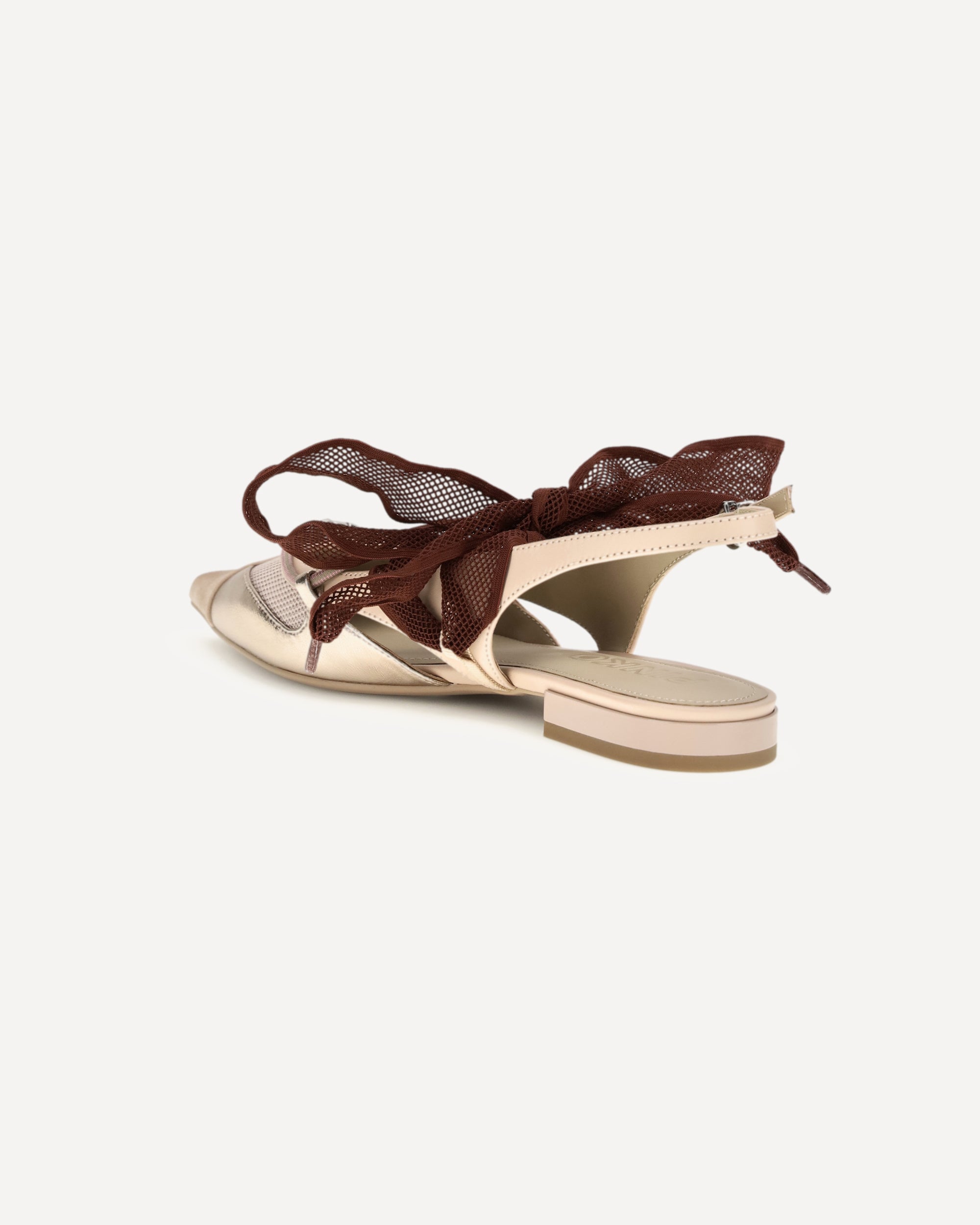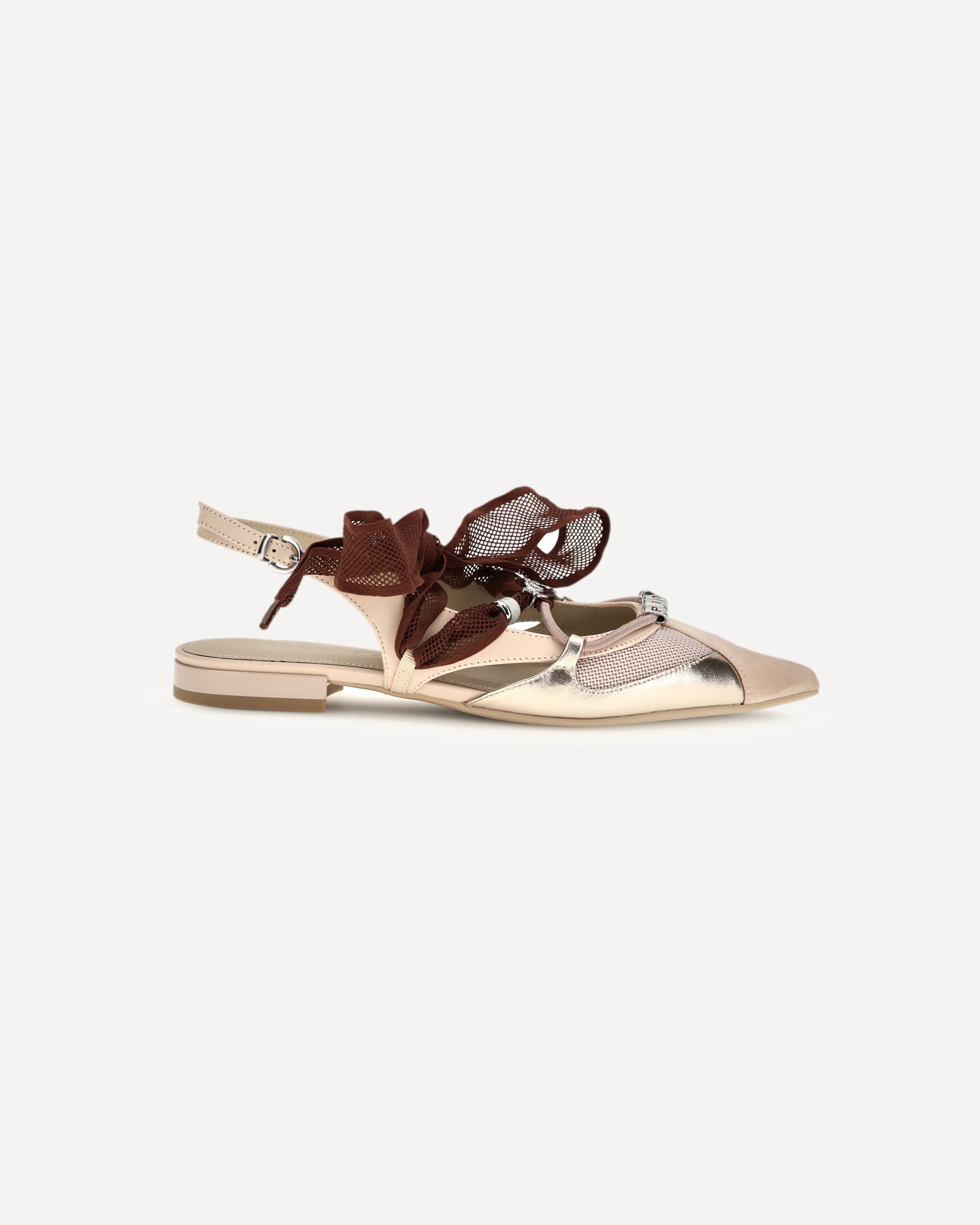 The Gianira leather Ballerinas by Pinko combine elegance and femininity in a refined design. The pointed toe model is completed with an adjustable strap closure, while metal lettering logo detail embellishes the upper. The rubber sole ensures comfort, and the mesh ribbon around the ankle adds a sophisticated and distinctive touch.