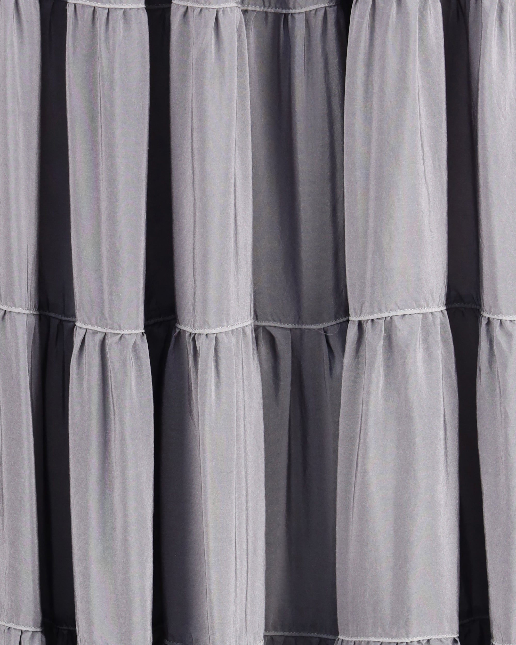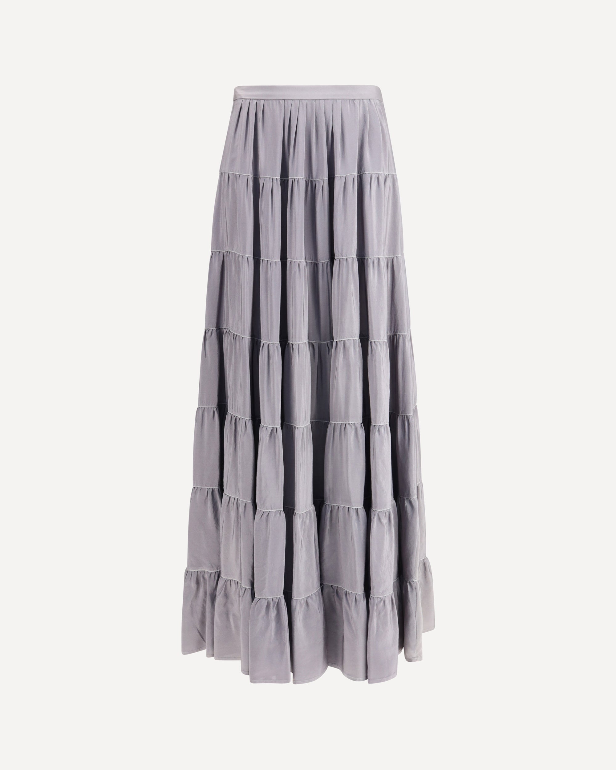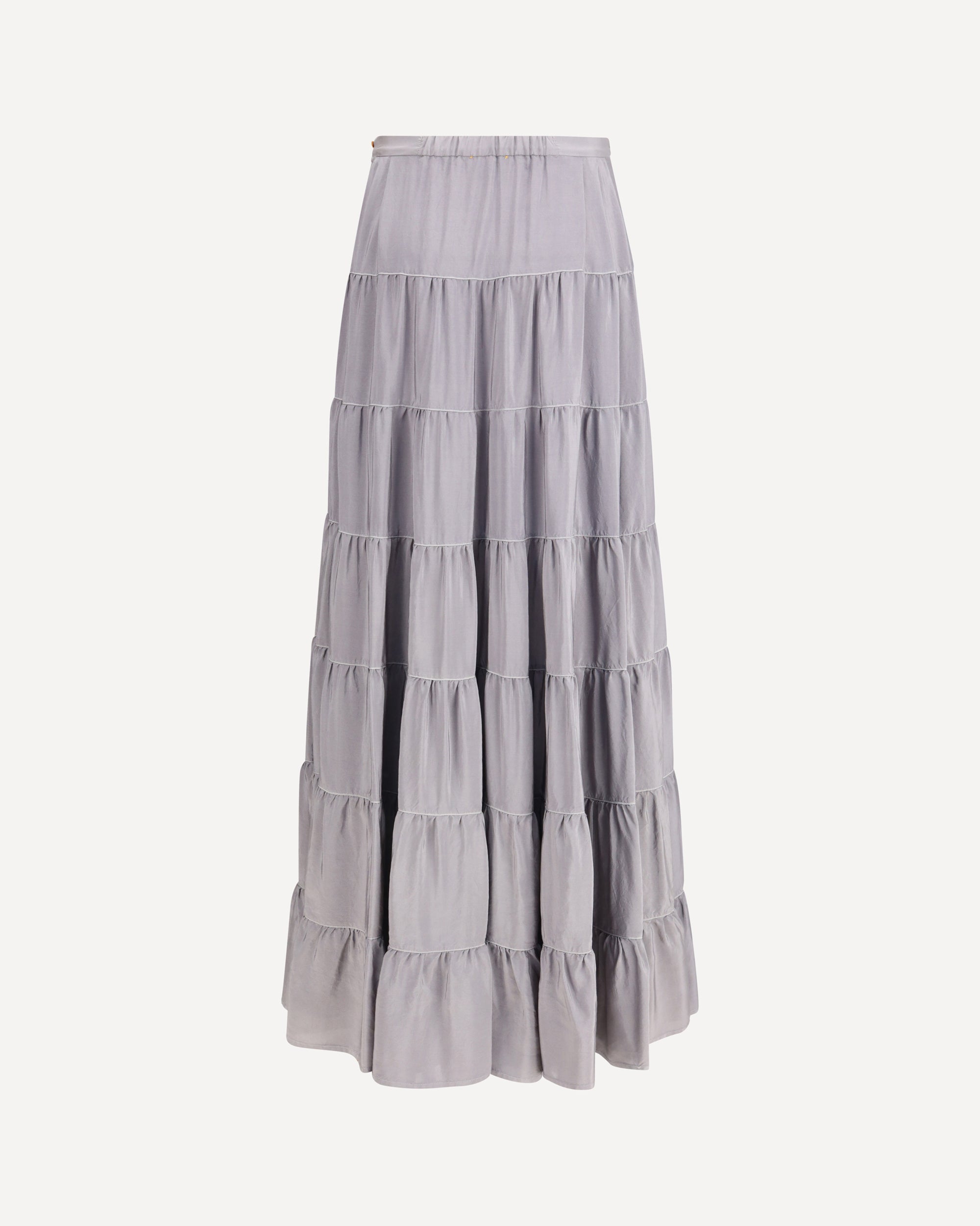 The Habotai silk Skirt by forte_forte embodies fluid elegance and lightness. Crafted from fine habotai silk, it features wide gathered tiers that flow gracefully with each step, creating a refined and airy rhythm. Delicate contrasting threads trace its horizontal structure, while the waistband with a small elastic insert at the back and a side zip closure ensure comfort and a perfect fit. A piece that balances delicacy and volume, capturing a poetic sense of modern femininity.