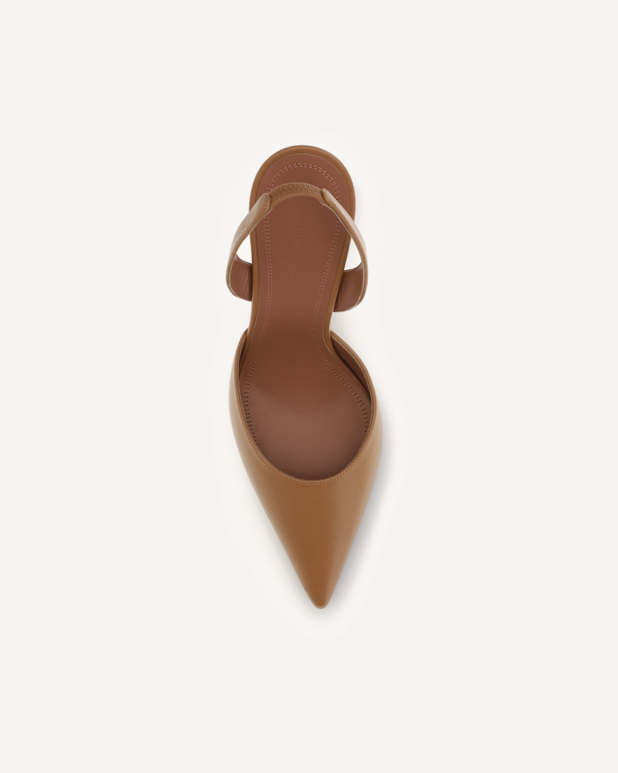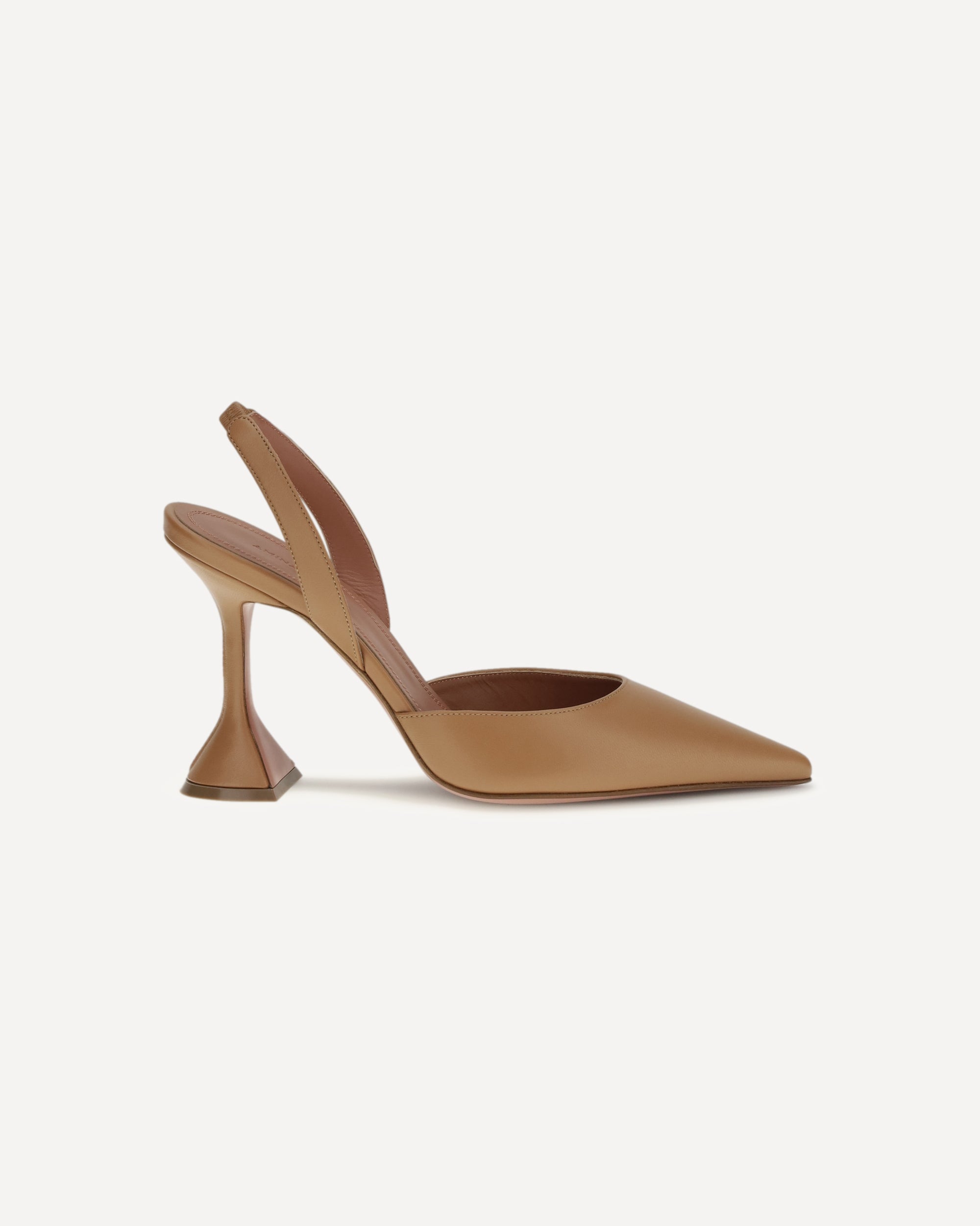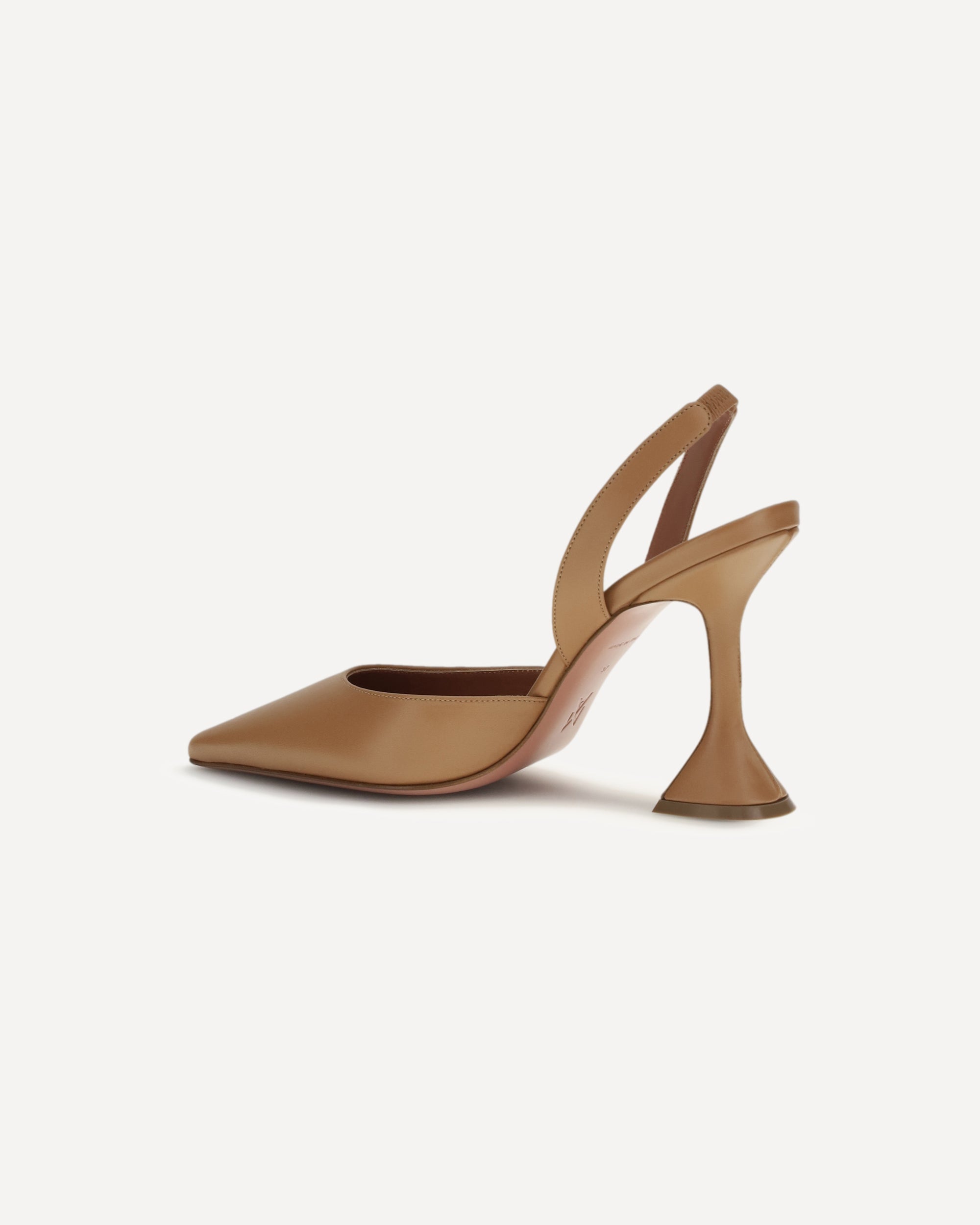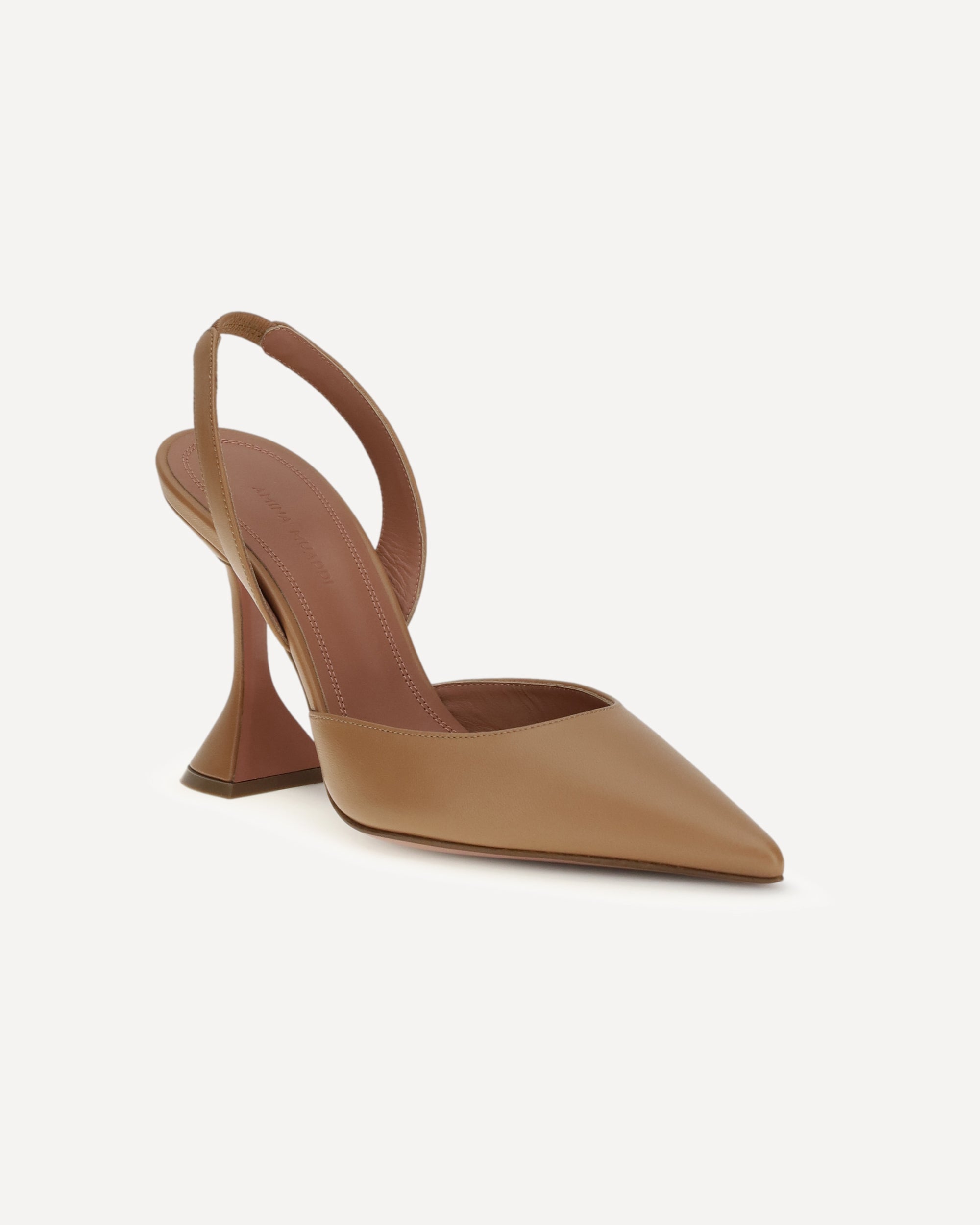 The Holli slingback Pumps by Amina Muaddi are crafted in a refined coffee shade and feature a tapered toe and the brand's iconic sculpted heel. The back strap ensures a feminine and comfortable fit, while the sleek design lends elegance and modernity.