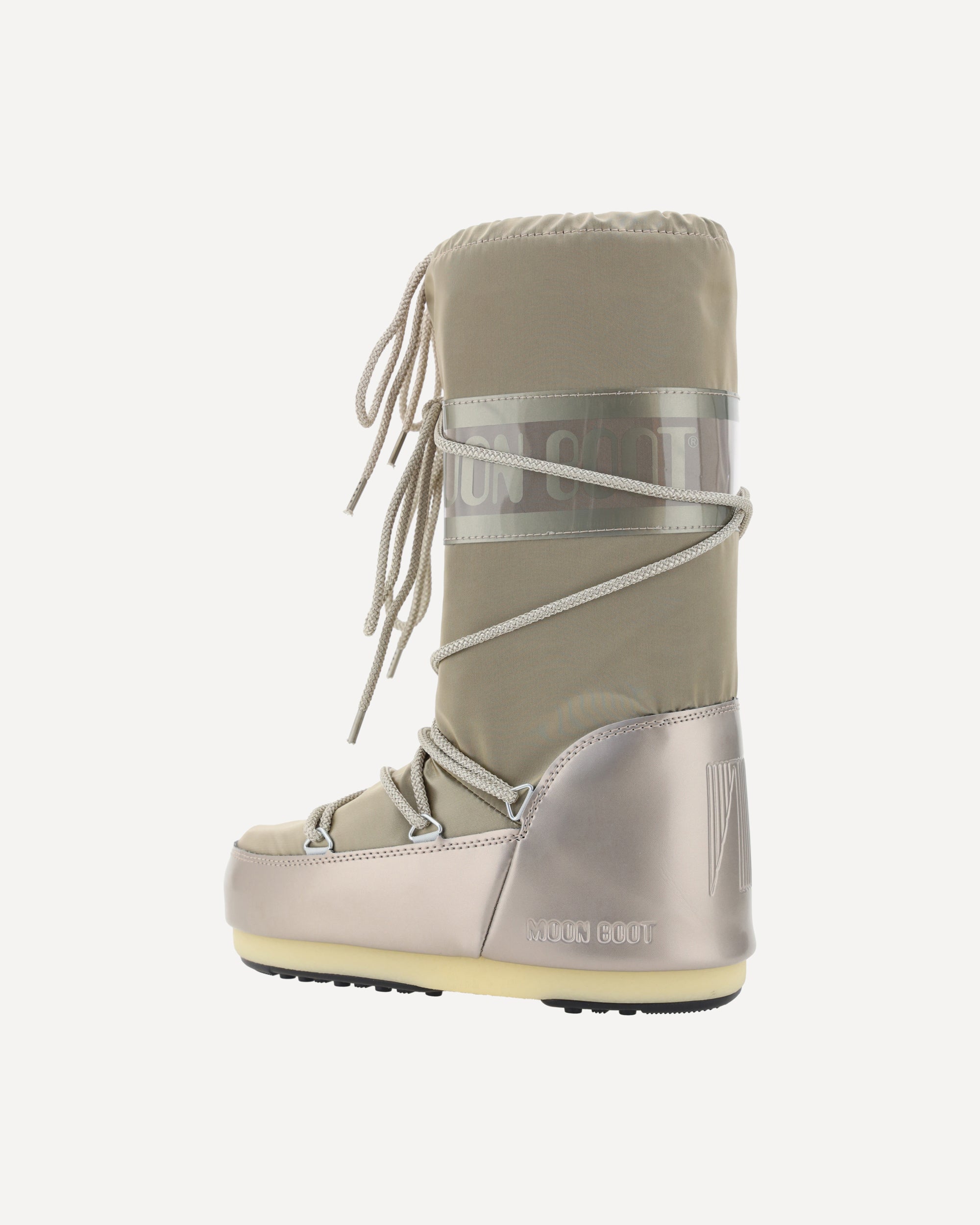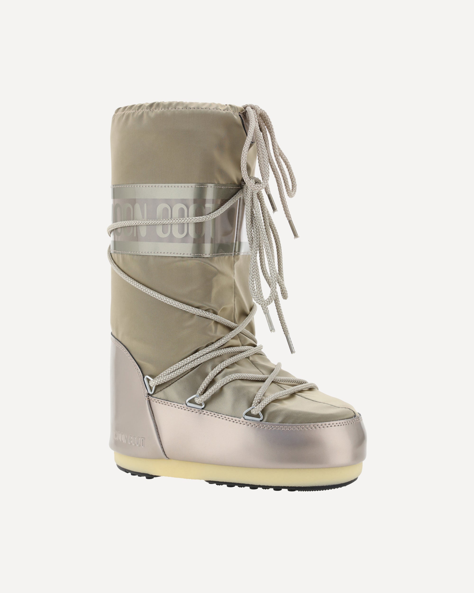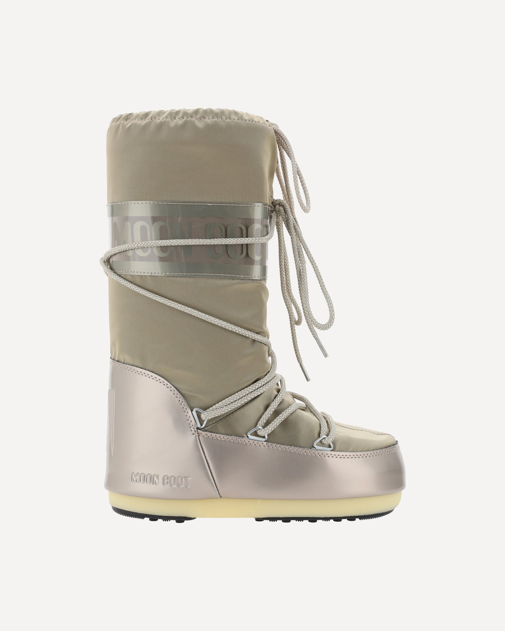Icon Glance Boots by Moon Boot, tall model, classic all-over padded design, iconic brand monogram printed in contrast on the shaft, front laces for closure, platform sole, knee-high model.