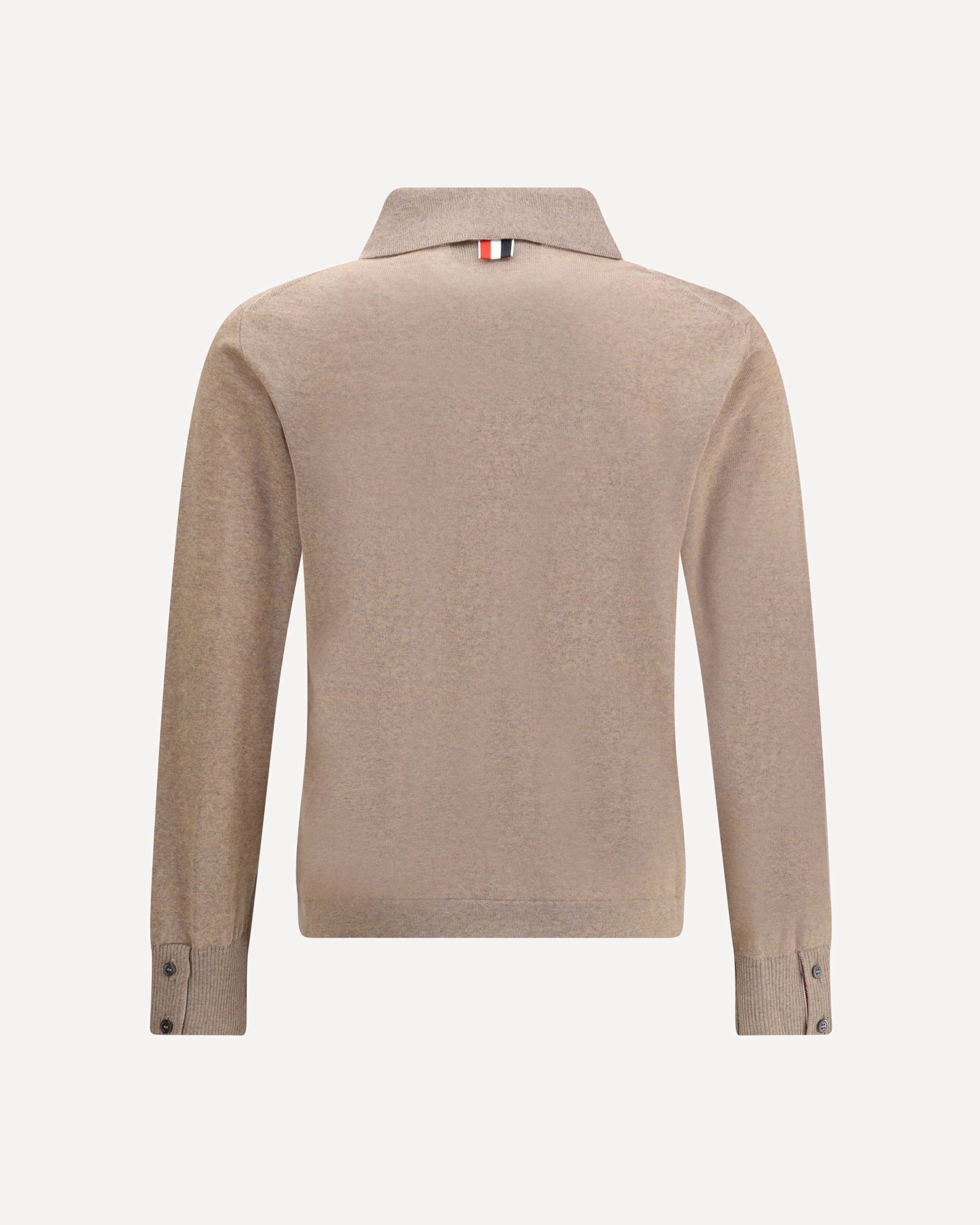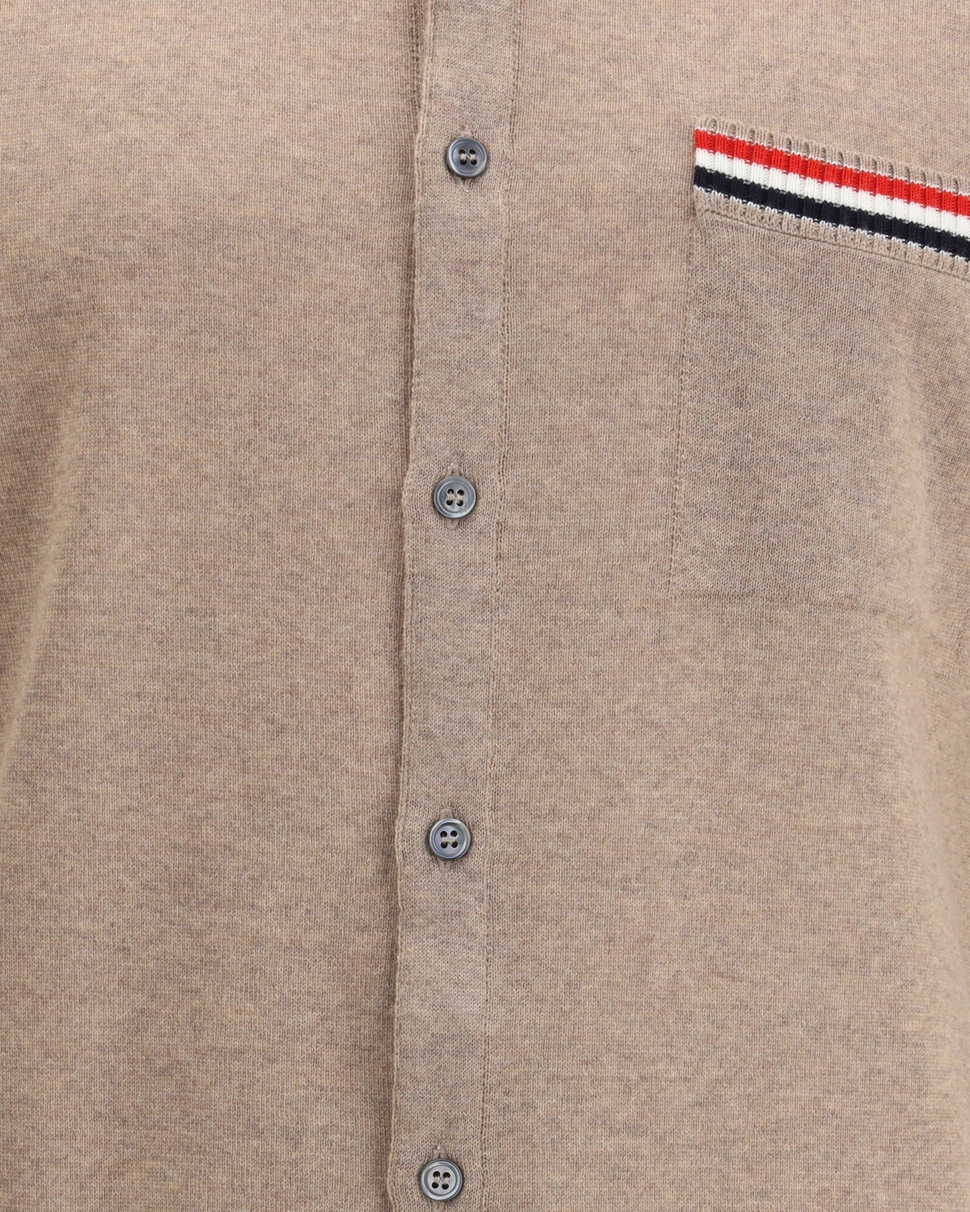 Thom Browne's virgin wool Cardigan features a refined design and unique details. Featuring a button closure and a ribbed button-down collar, it offers understated, contemporary elegance. Ribbed cuffs and an asymmetrical hem add dynamism to the silhouette, while the front patch pocket, embellished with the iconic tricolor detail, signs the garment with an unmistakable touch of style.