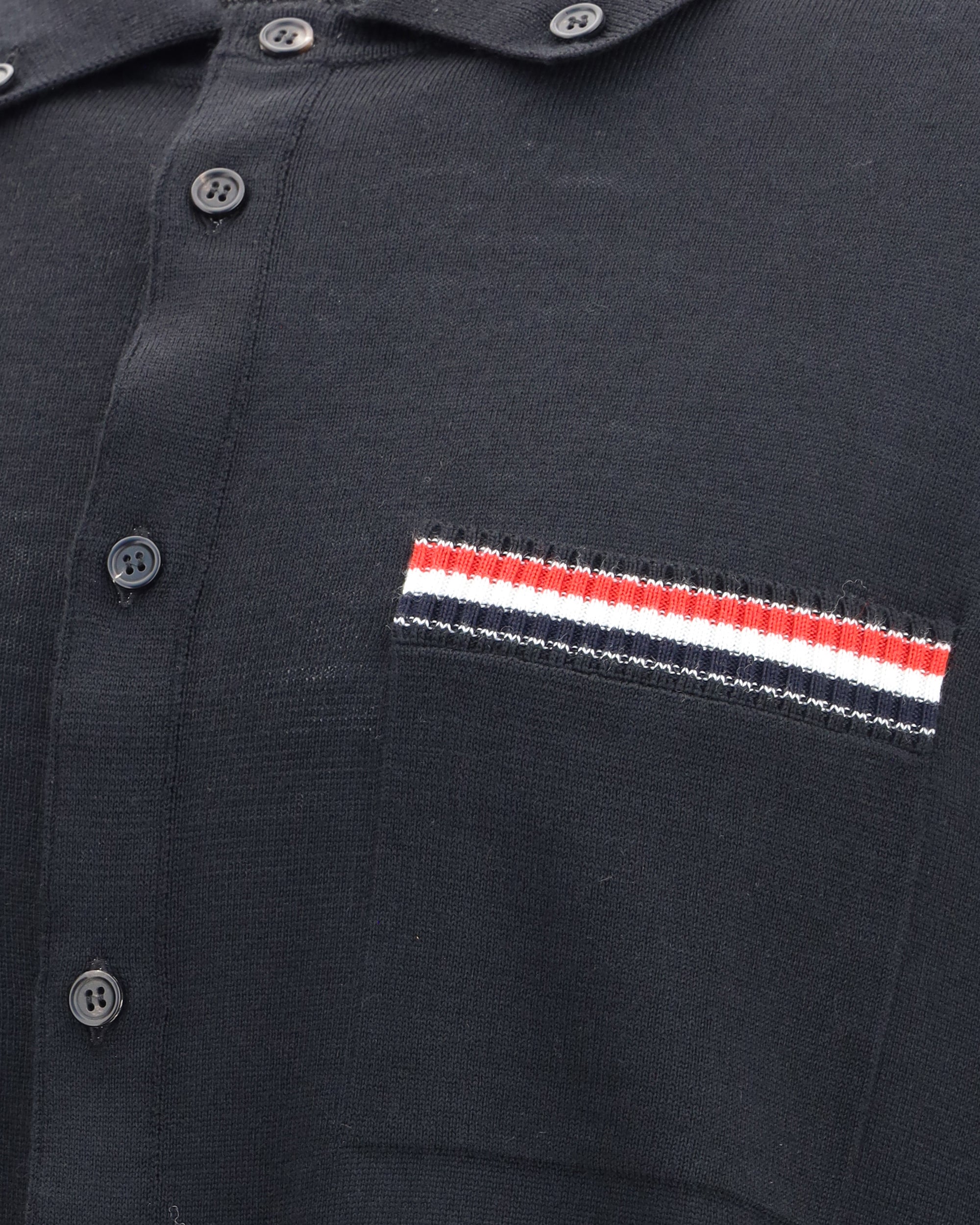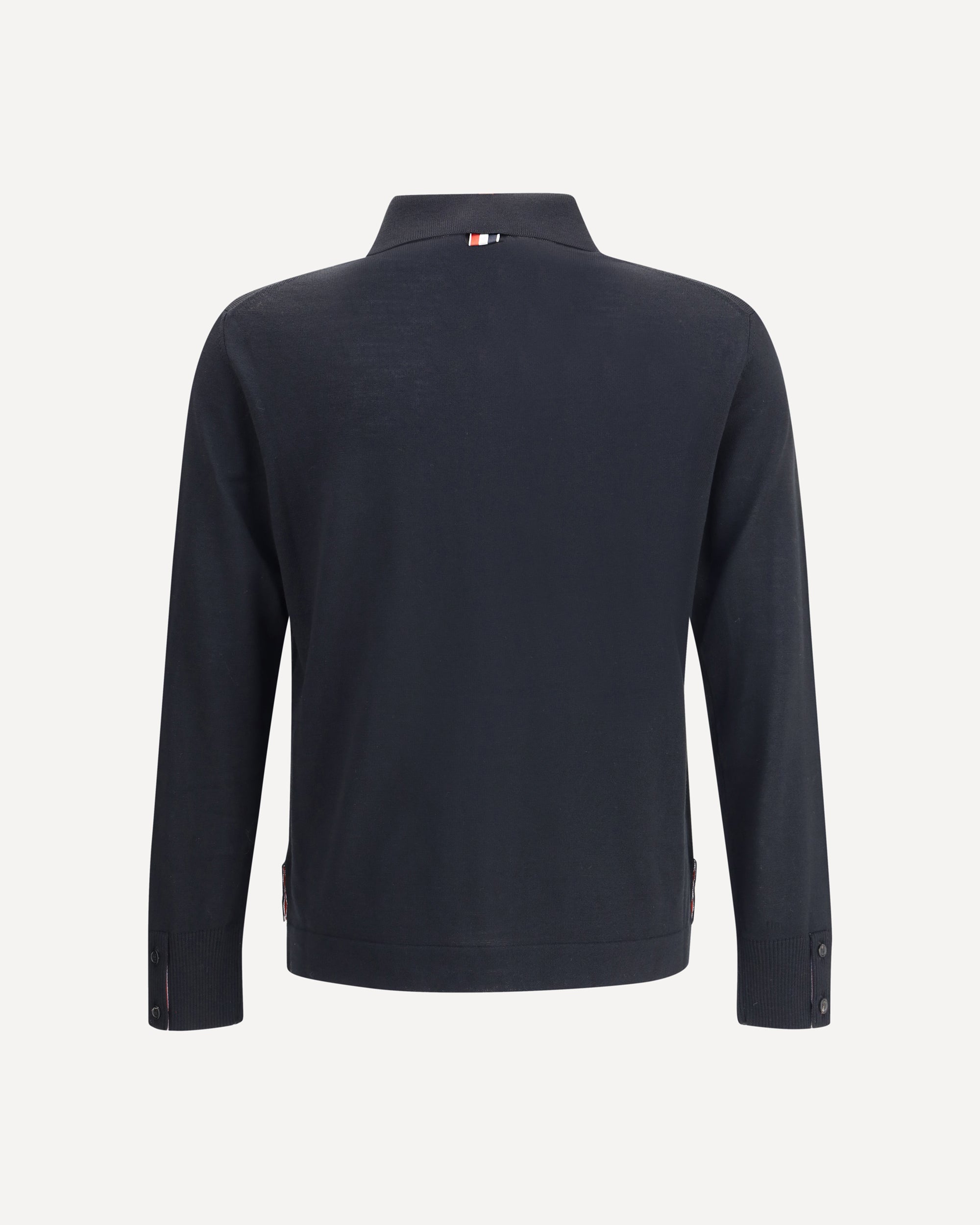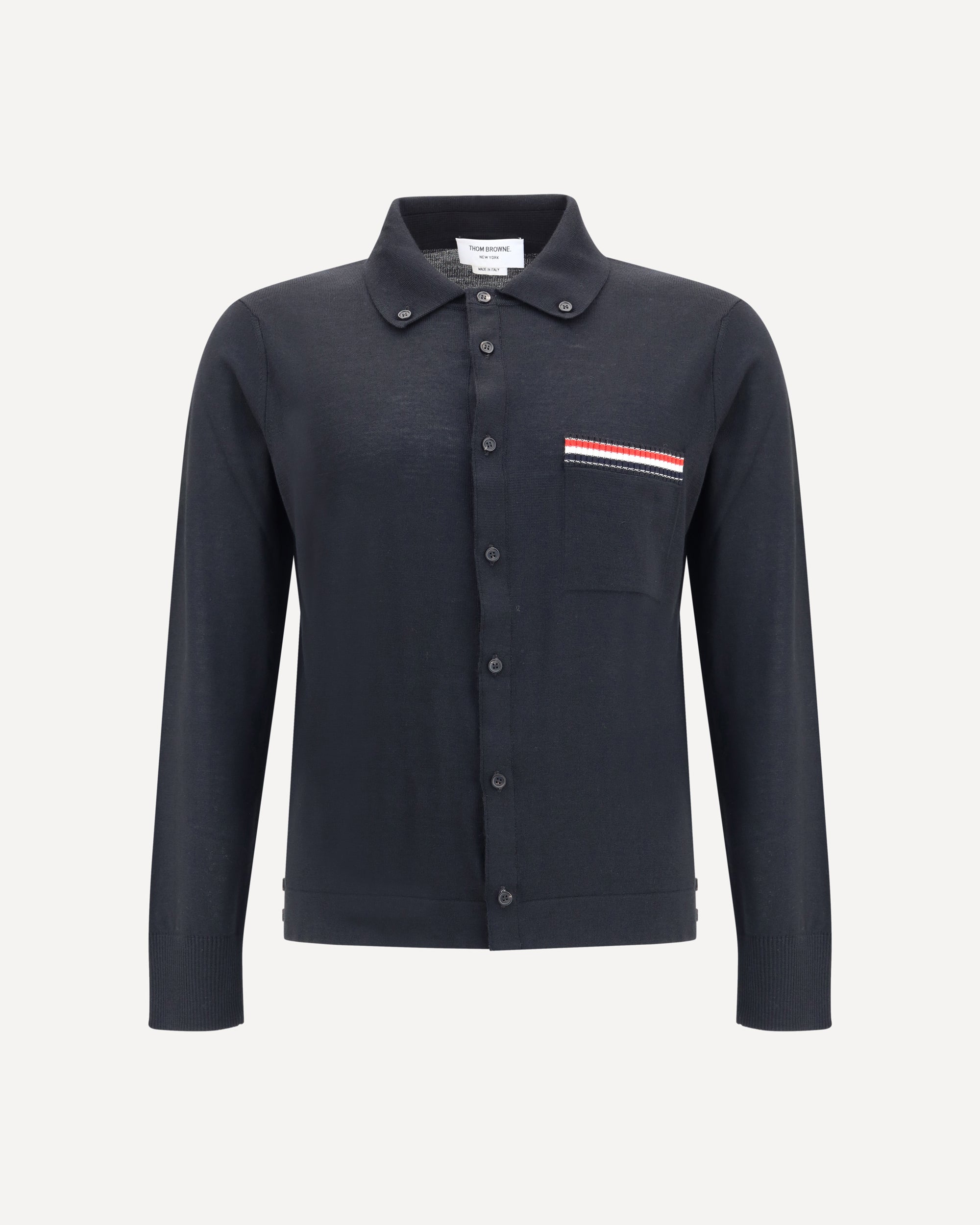 Thom Browne's virgin wool Cardigan features a refined design and unique details. Featuring a button closure and a ribbed button-down collar, it offers understated, contemporary elegance. Ribbed cuffs and an asymmetrical hem add dynamism to the silhouette, while the front patch pocket, embellished with the iconic tricolor detail, signs the garment with an unmistakable touch of style.