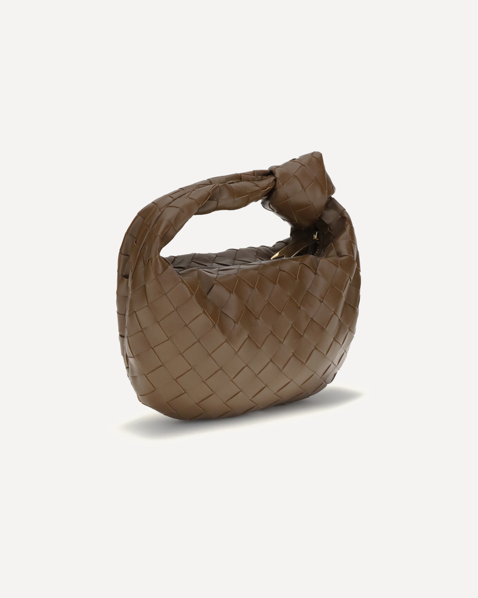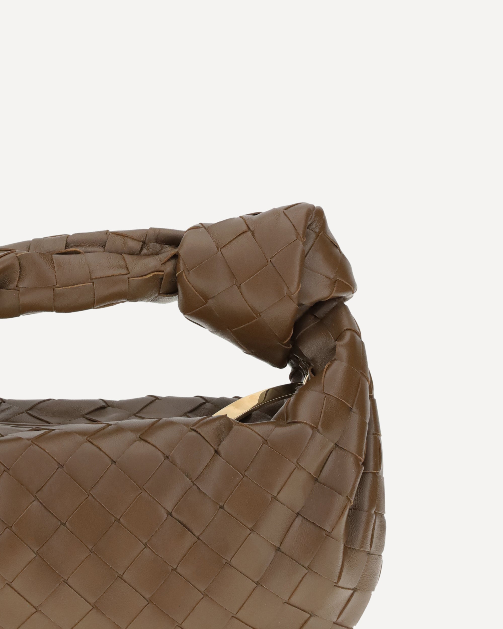 The Mini Jodie Lambskin Handbag by Bottega Veneta is a masterpiece of elegance and craftsmanship. Featuring the brand's iconic intrecciato weave, the design covers the entire surface of the bag, giving it a refined texture and a unique look. The top zip closure ensures practicality and security, while the knotted detail on the handle adds a distinctive and chic touch. Inside, a convenient single compartment allows you to organize your essentials in style. Perfect for those seeking a sophisticated and versatile accessory, the Mini Jodie is the epitome of Bottega Veneta's timeless luxury.