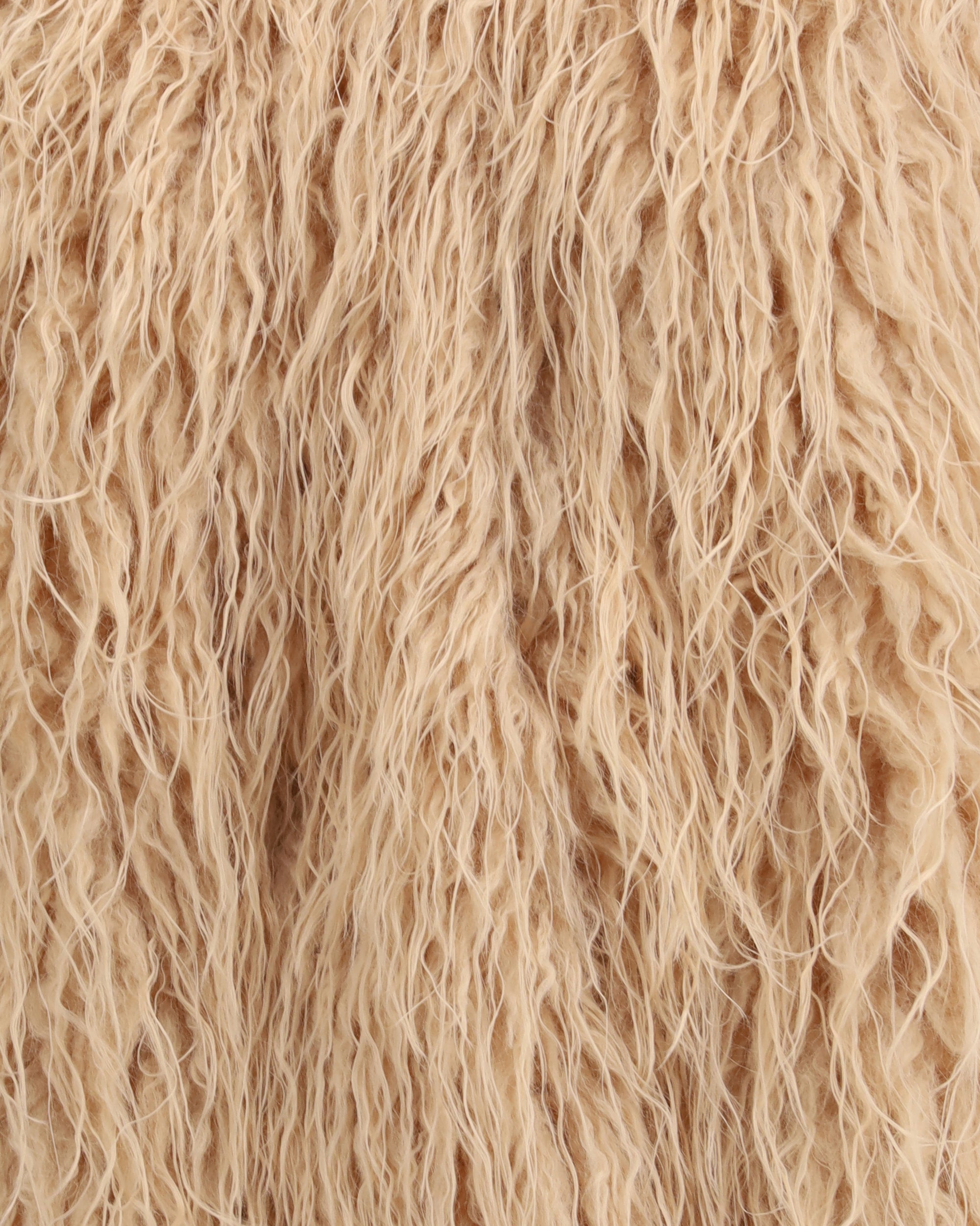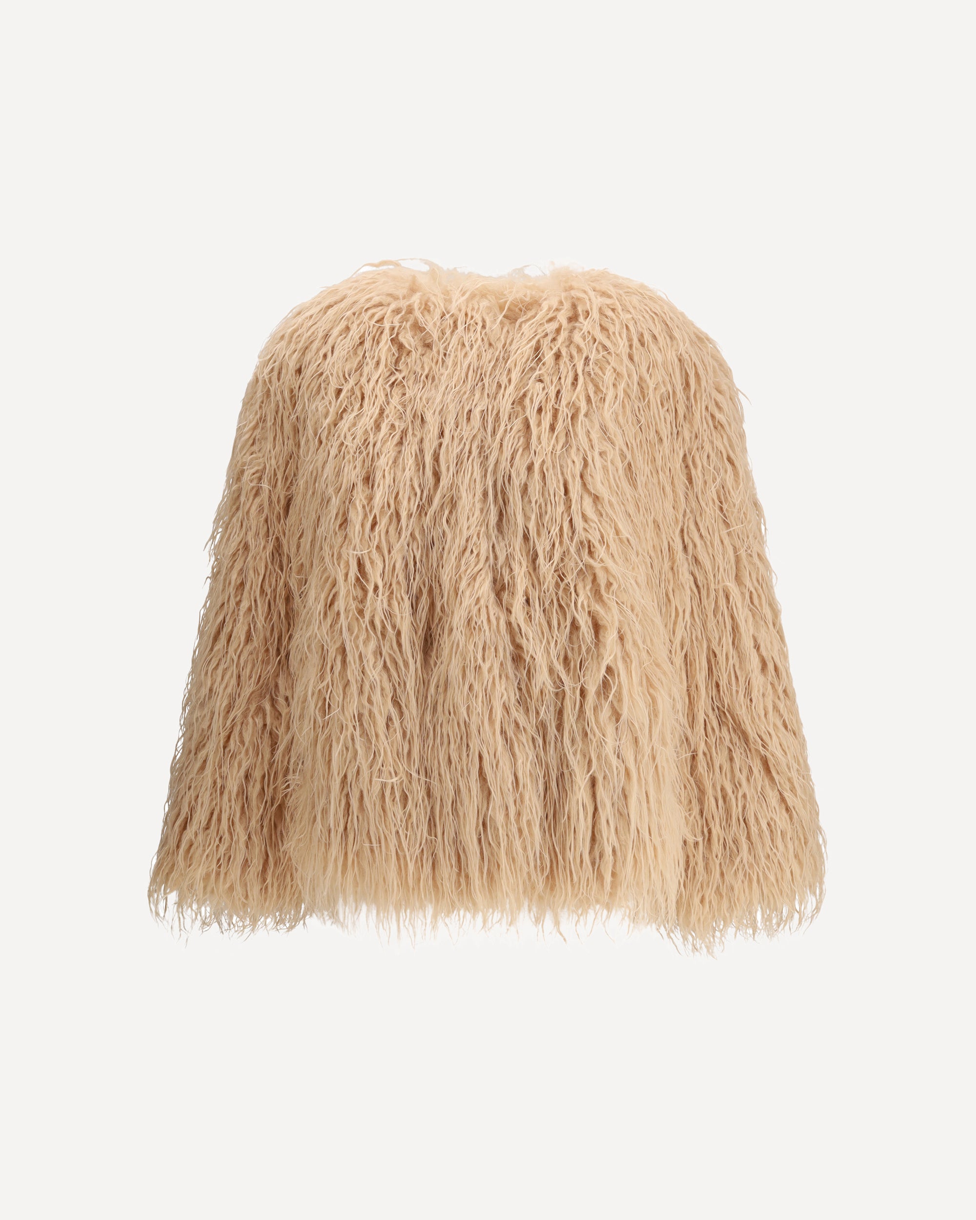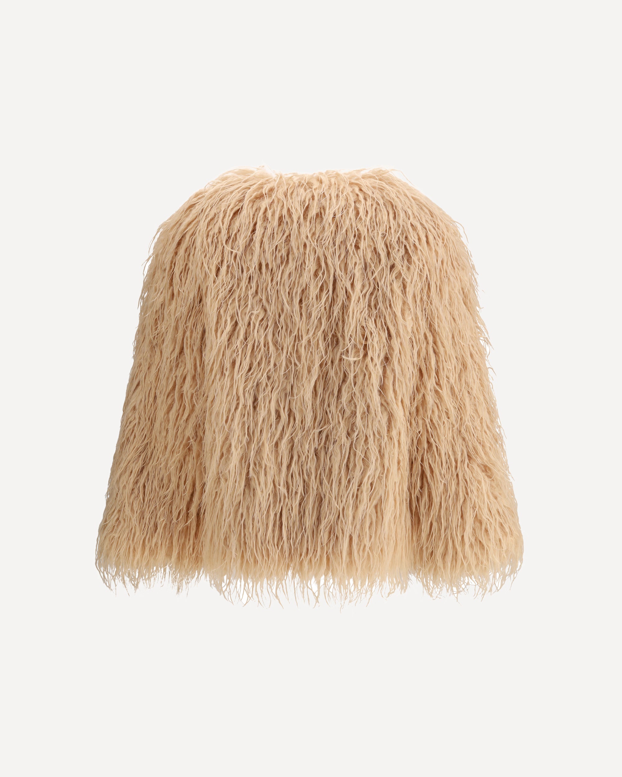 Forte_Forte's eco mongolia fur Jacket is a characterful garment that combines style and sustainability. Featuring a front snap closure and two side welt pockets, it offers warmth and practicality in a stylish, environmentally friendly design.