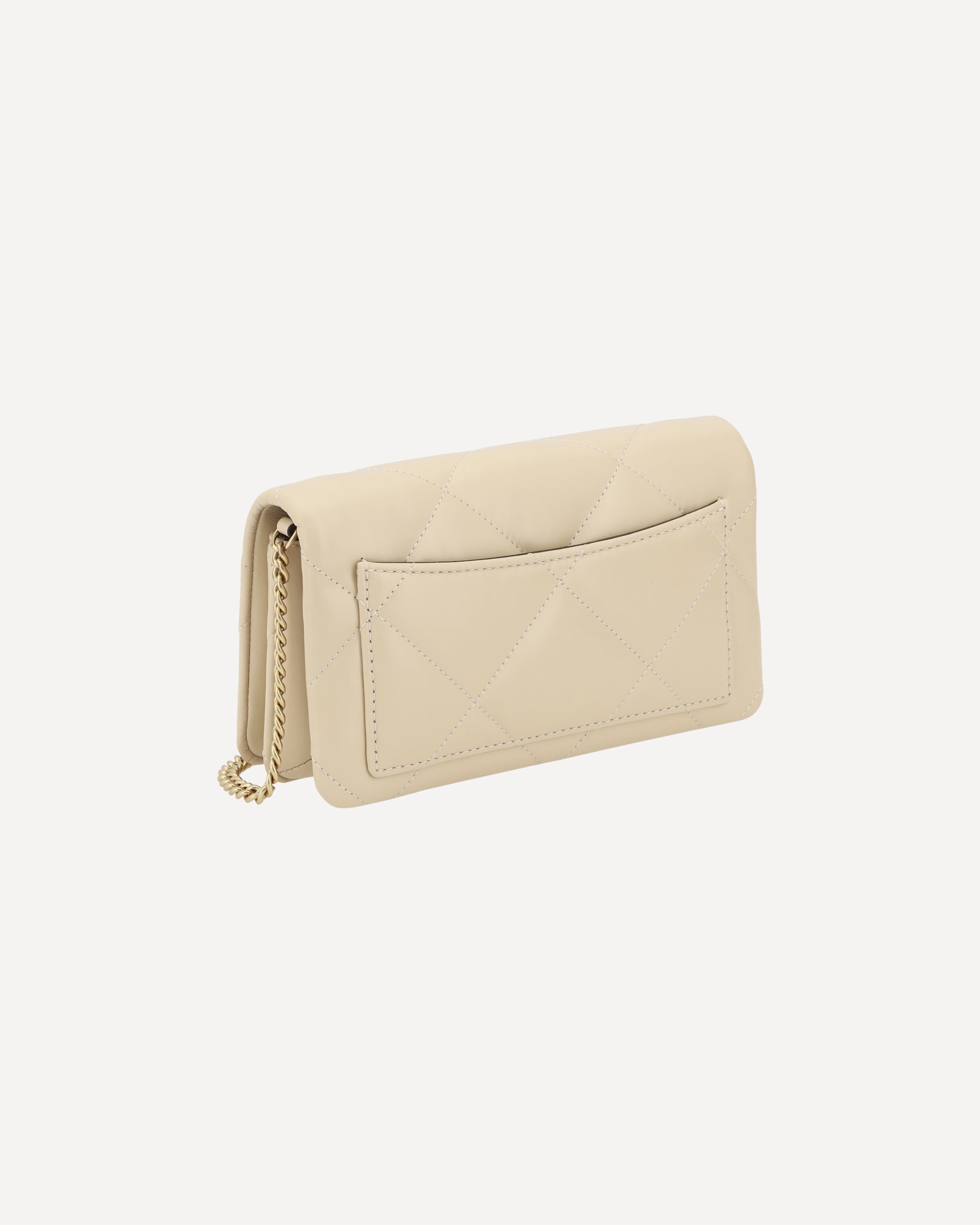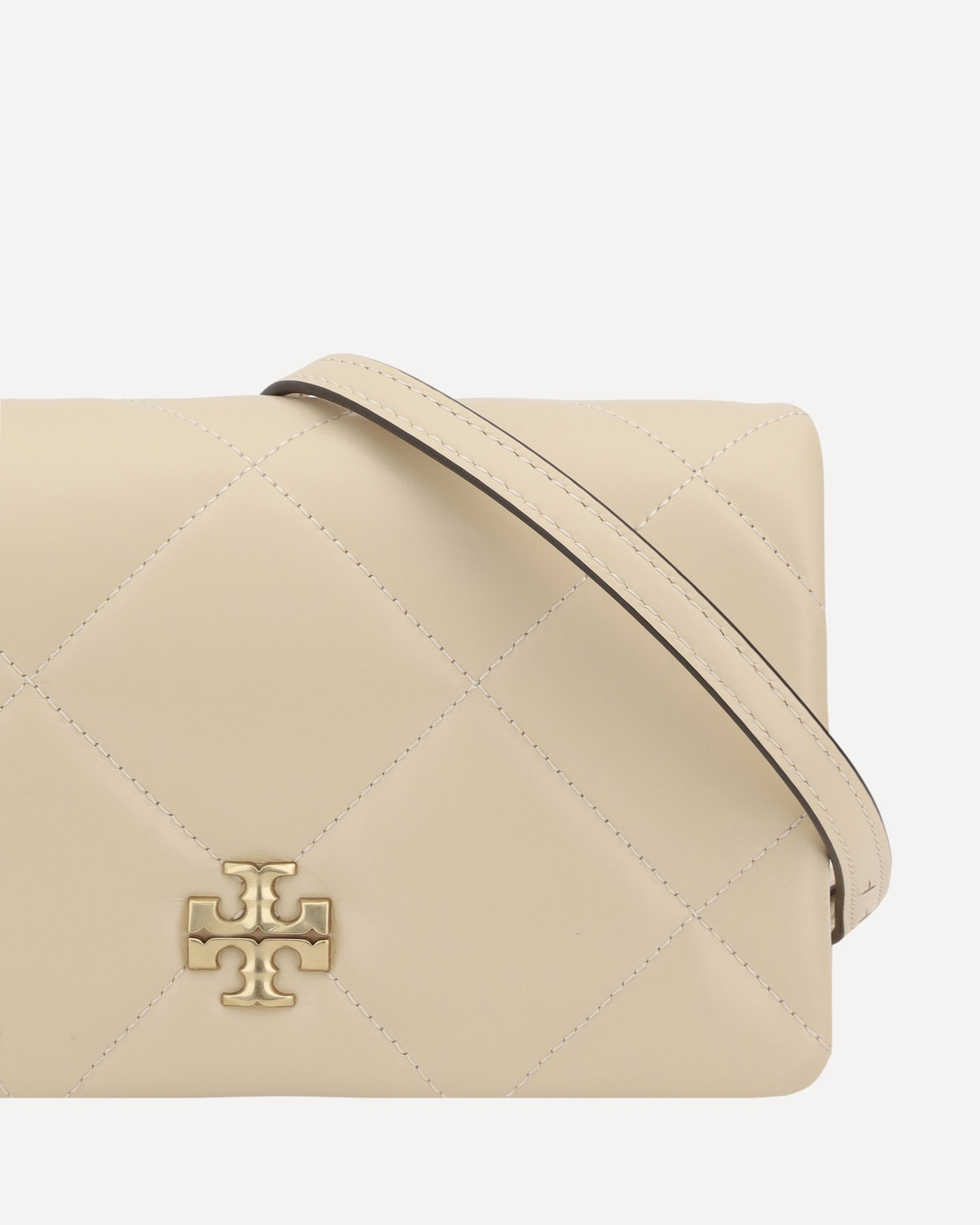 Tory Burch's Kira Diamond leather Shoulder Wallet is an elegant and functional accessory. The removable Kira chain strap with leather inserts adds a touch of luxury and versatility. The front closure with magnetic flap provides practicality, while the three-dimensional plaque with the brand's iconic logo applied to the front lends a distinctive detail. The all-over quilted design gives a sophisticated look. Inside, it features two card slots, an interior zippered slot pocket and a slit pocket on the back, offering ample space to organize essentials.