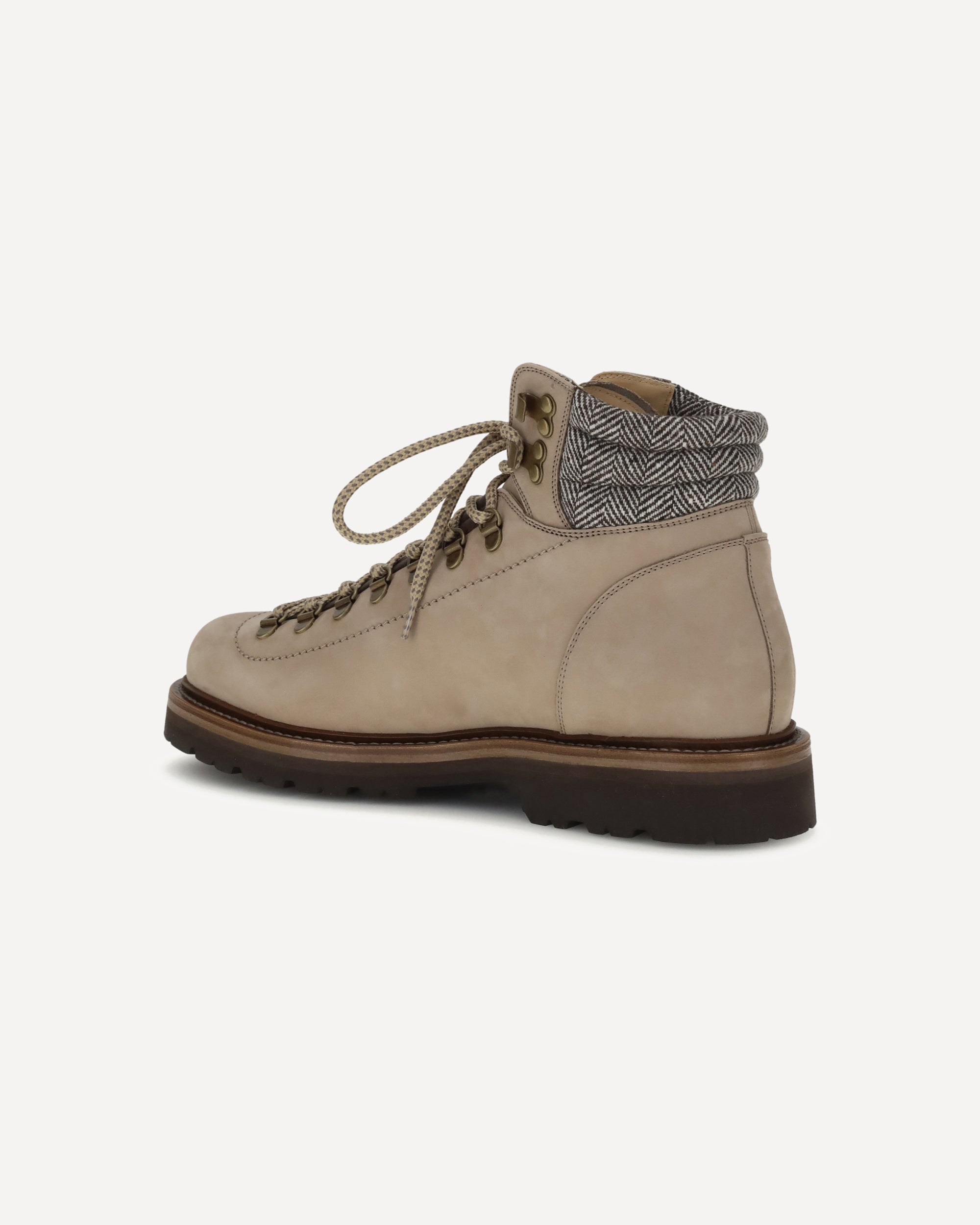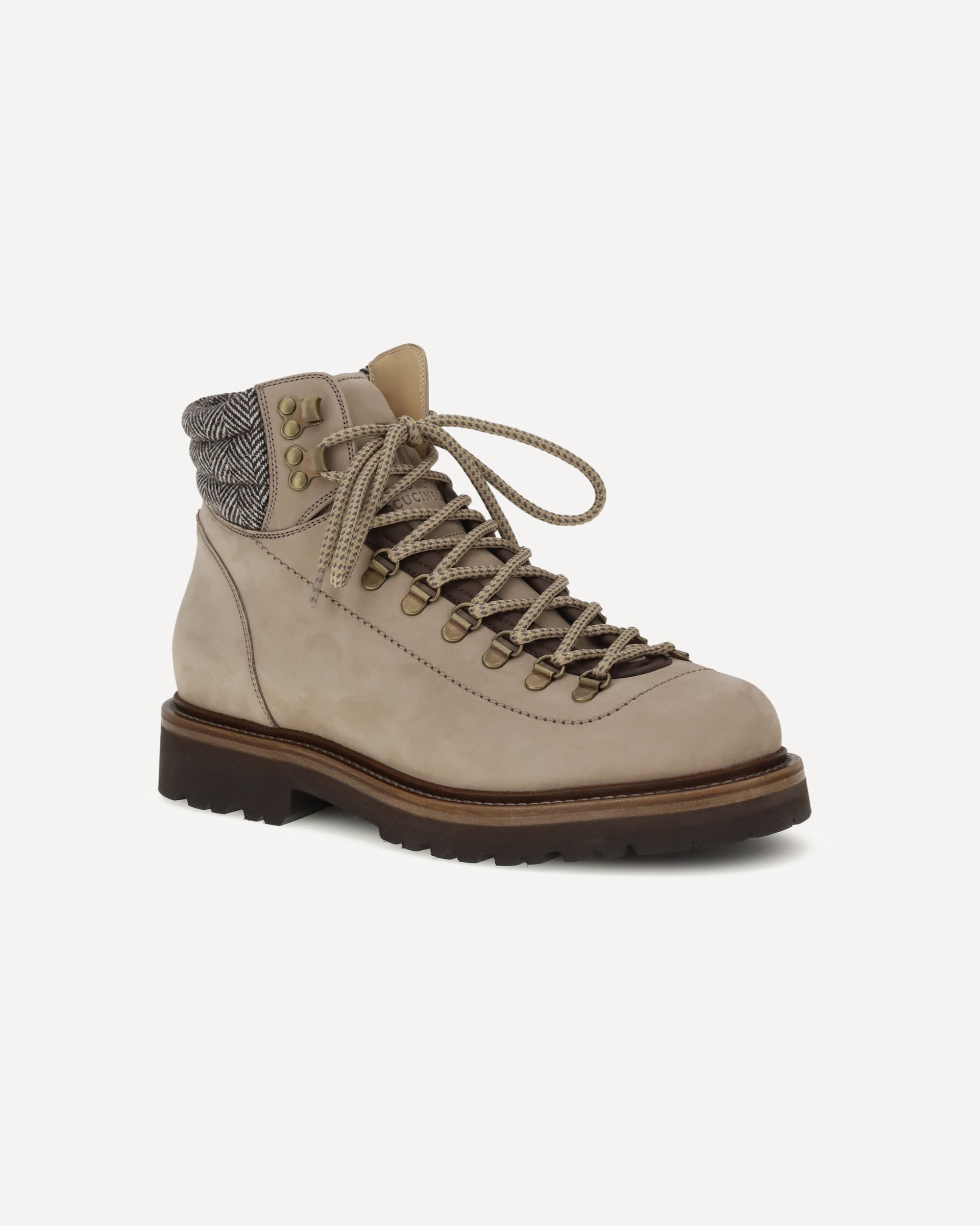 Brunello Cucinelli's Hiking Boots perfectly combine functionality and refined style. The details, inspired by hiking boots - such as metal eyelets and two-tone round laces - emphasize the sporty character of the model. The cotton lace-up closure ensures a secure fit, while the leather lining provides comfort and breathability. The rubber bottom offers durability and grip, enriched by a wool and cashmere insert on the back that adds a touch of warmth and luxury to this ankle boot with an outdoor soul and typical Brunello Cucinelli elegance.