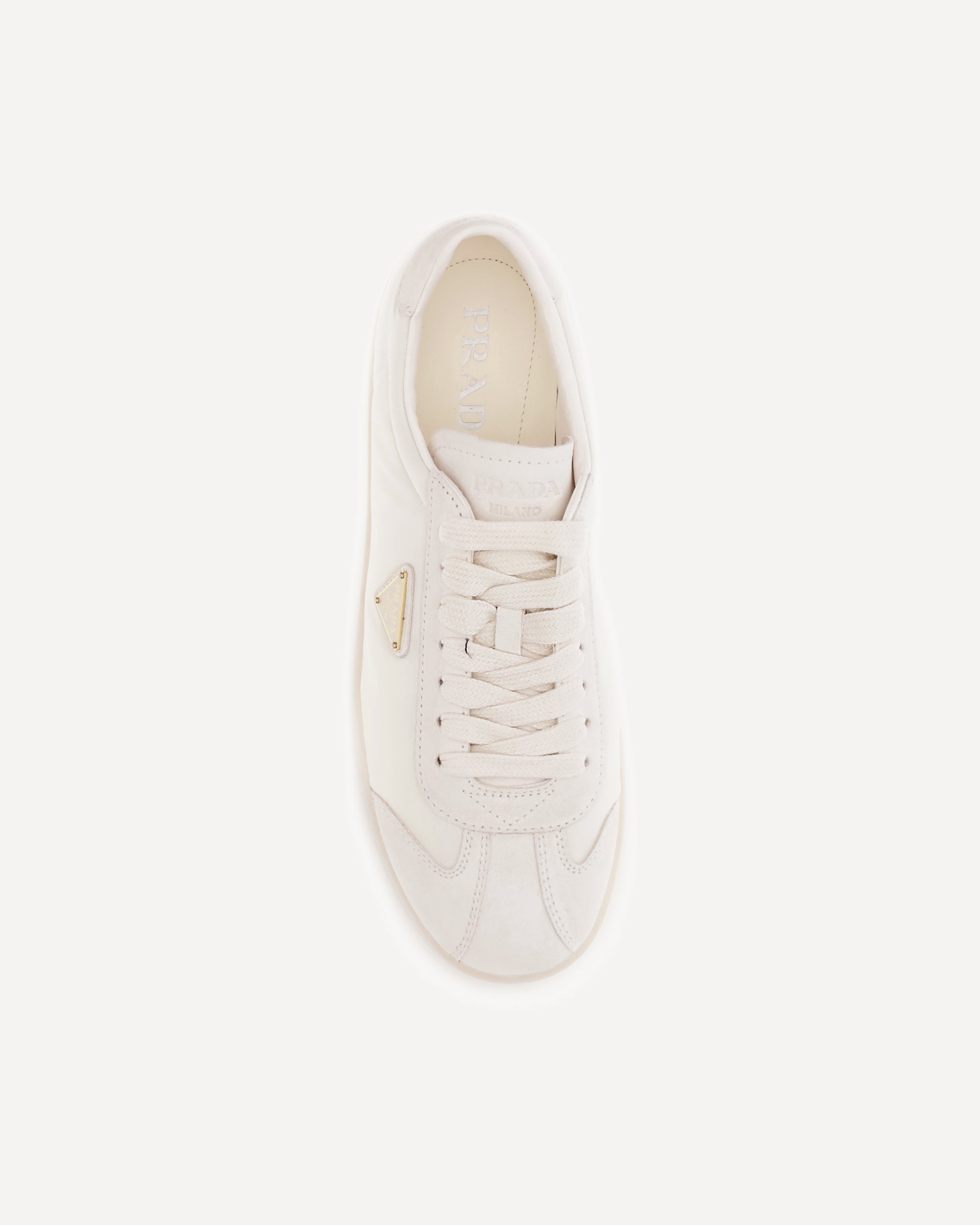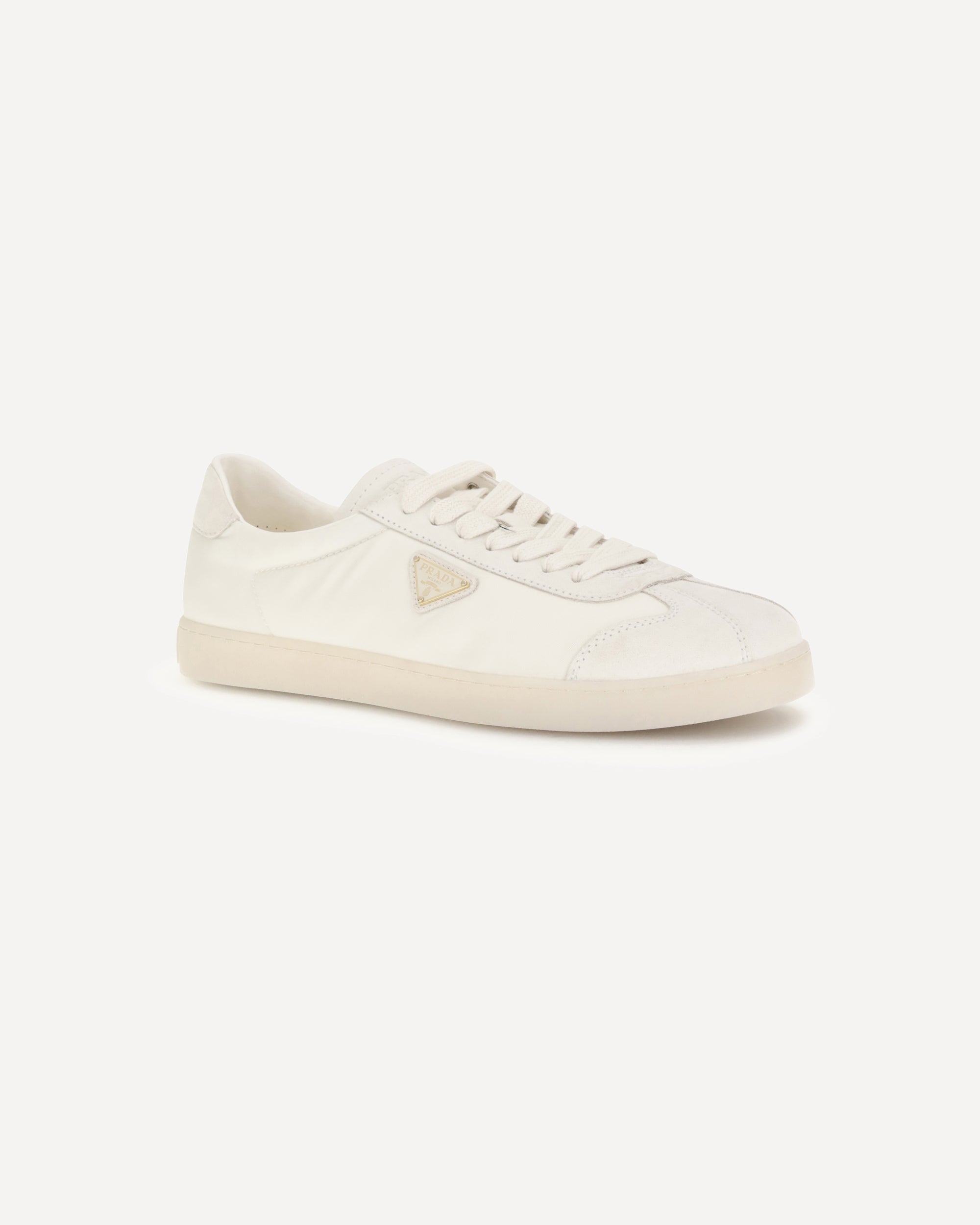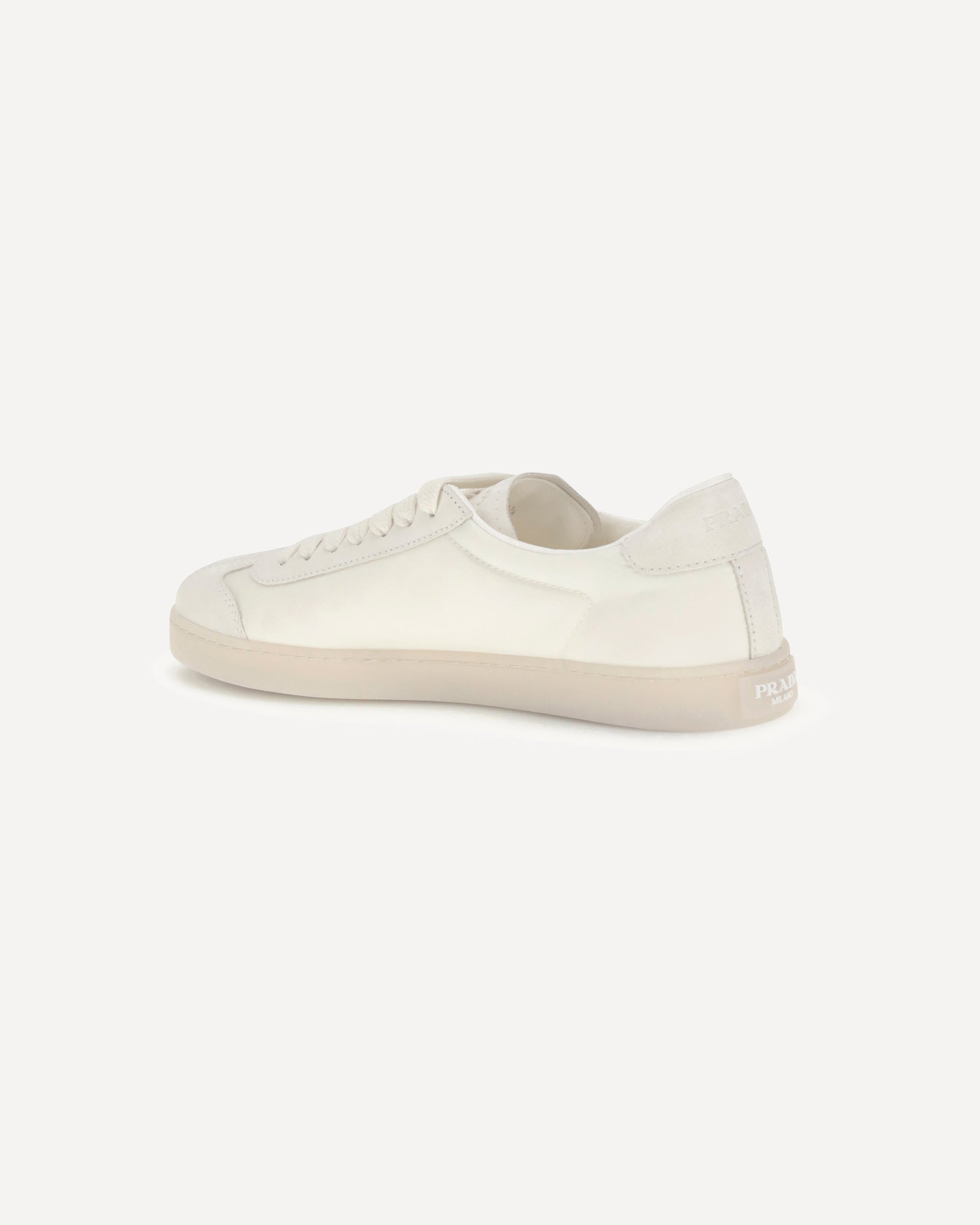 Leather Sneakers by Prada combine contemporary style with everyday comfort. Featuring a flat rubber sole and round toe, they are distinguished by the iconic triangular side-applied plaque and tone-on-tone logo on the back, adding a distinctive and refined touch to the design.