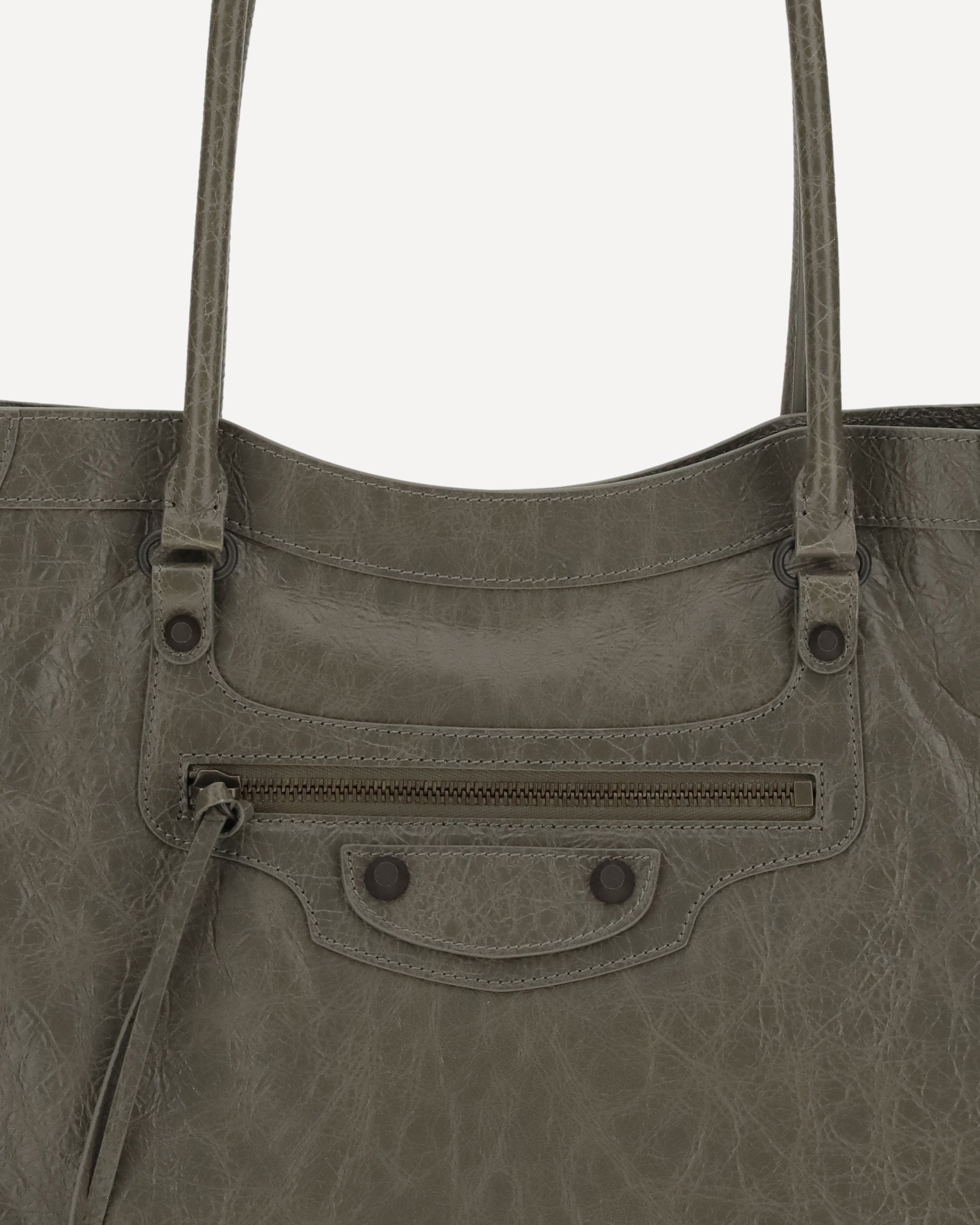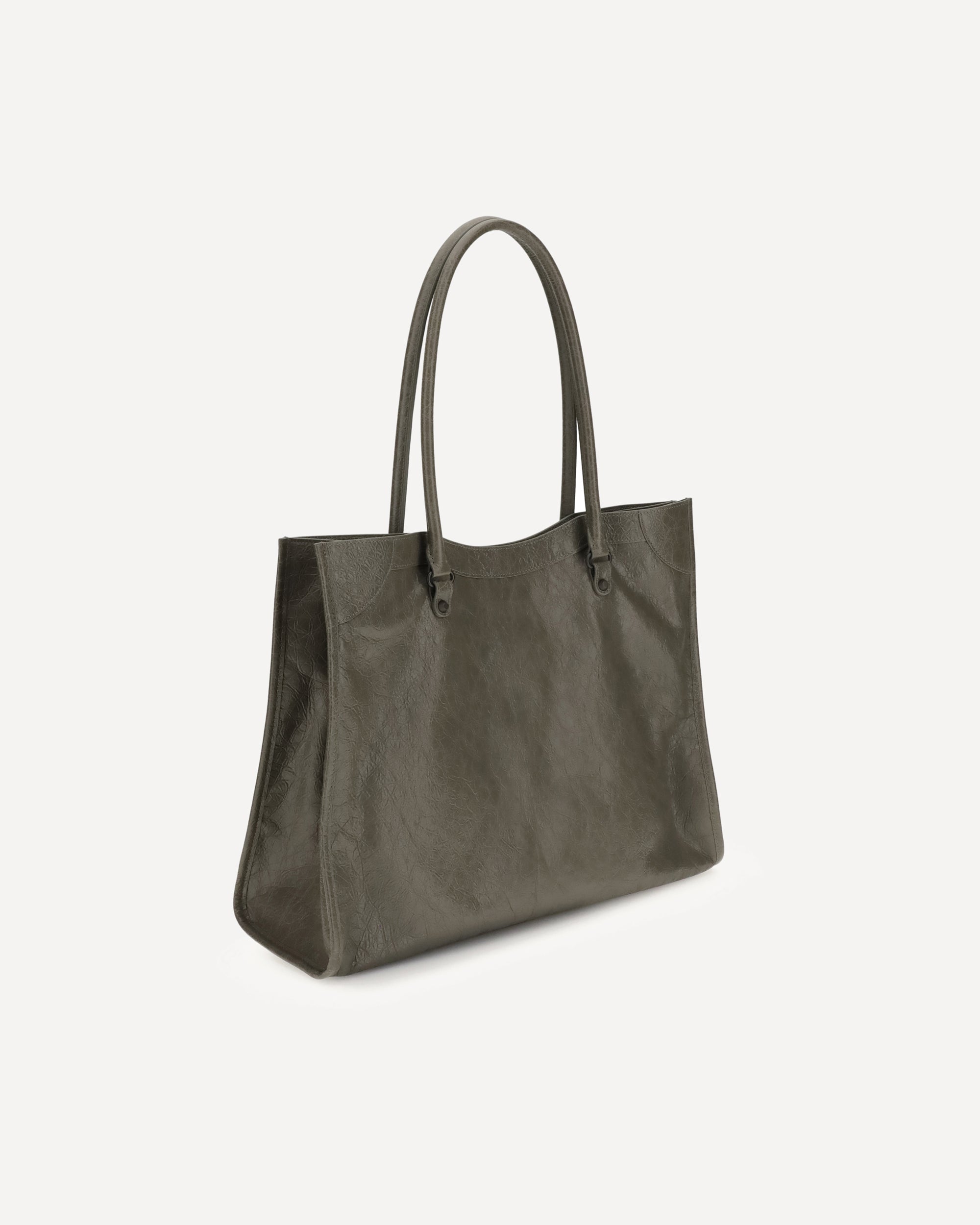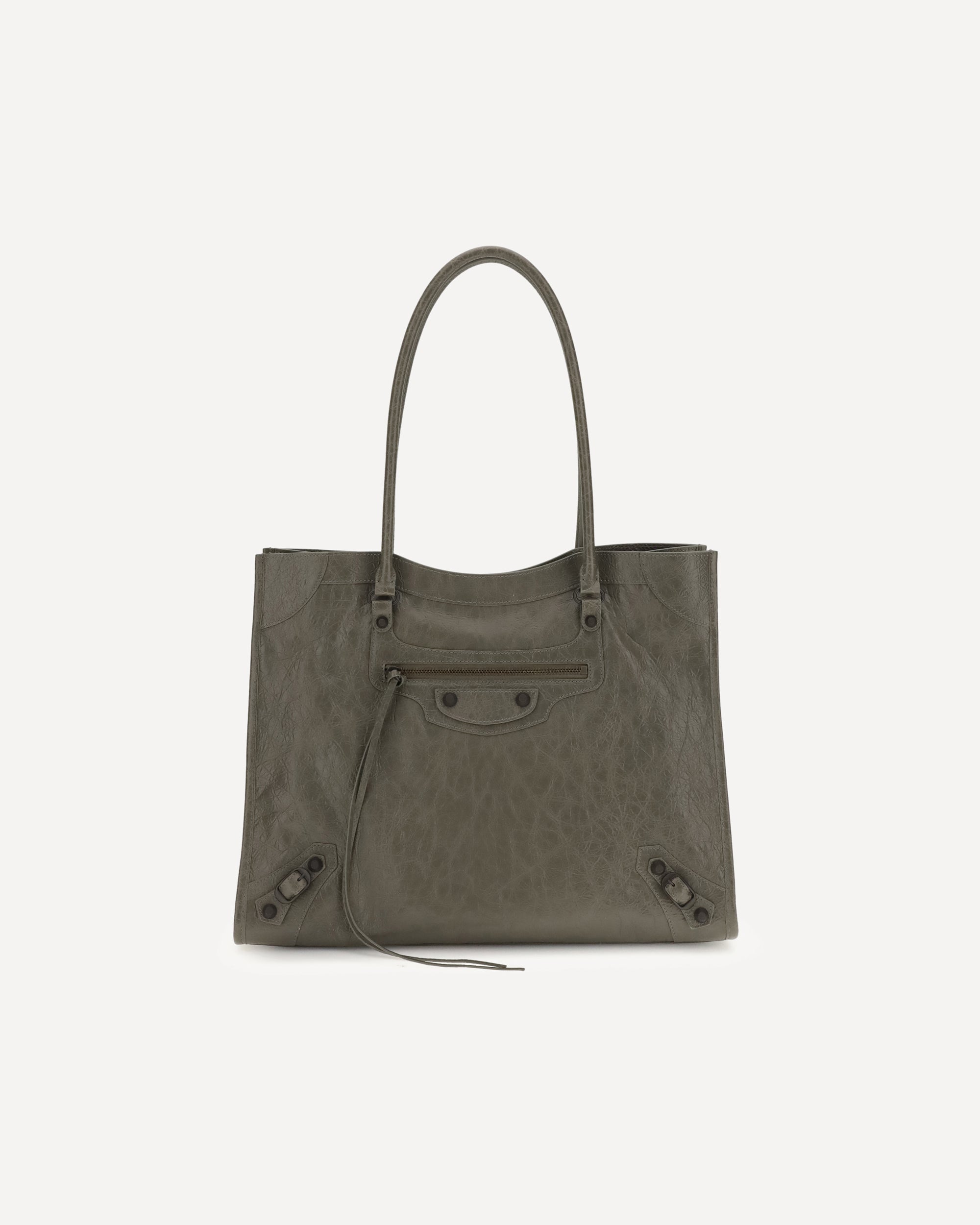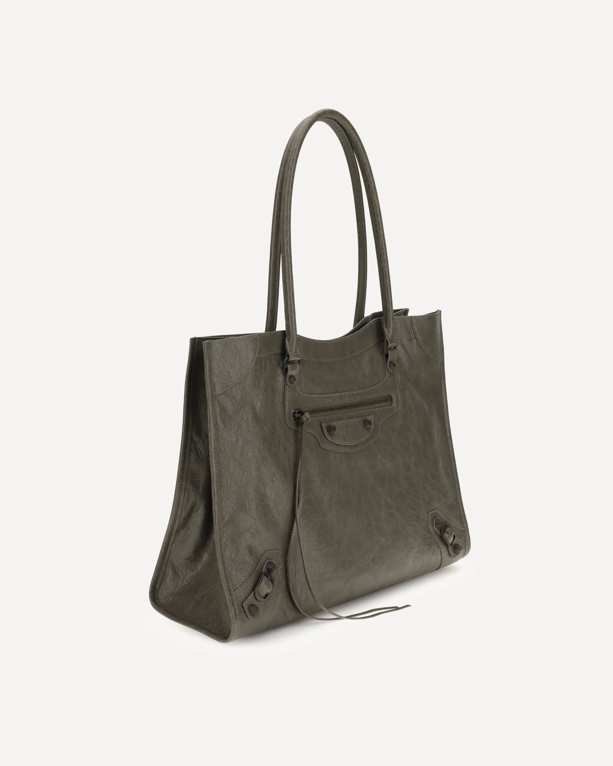The Le City Tote Bag by Balenciaga is crafted from soft Arena lambskin leather with a vintage finish, offering a spacious and structured silhouette. Designed with two top handles (drop: 23.8 cm), it’s ideal for shoulder carry.Iconic details include a front zip pocket with knotted leather pull, a magnetic snap closure, and a cotton canvas-lined interior with one main compartment and an internal zip pocket. Brass hardware adds a signature Balenciaga touch.