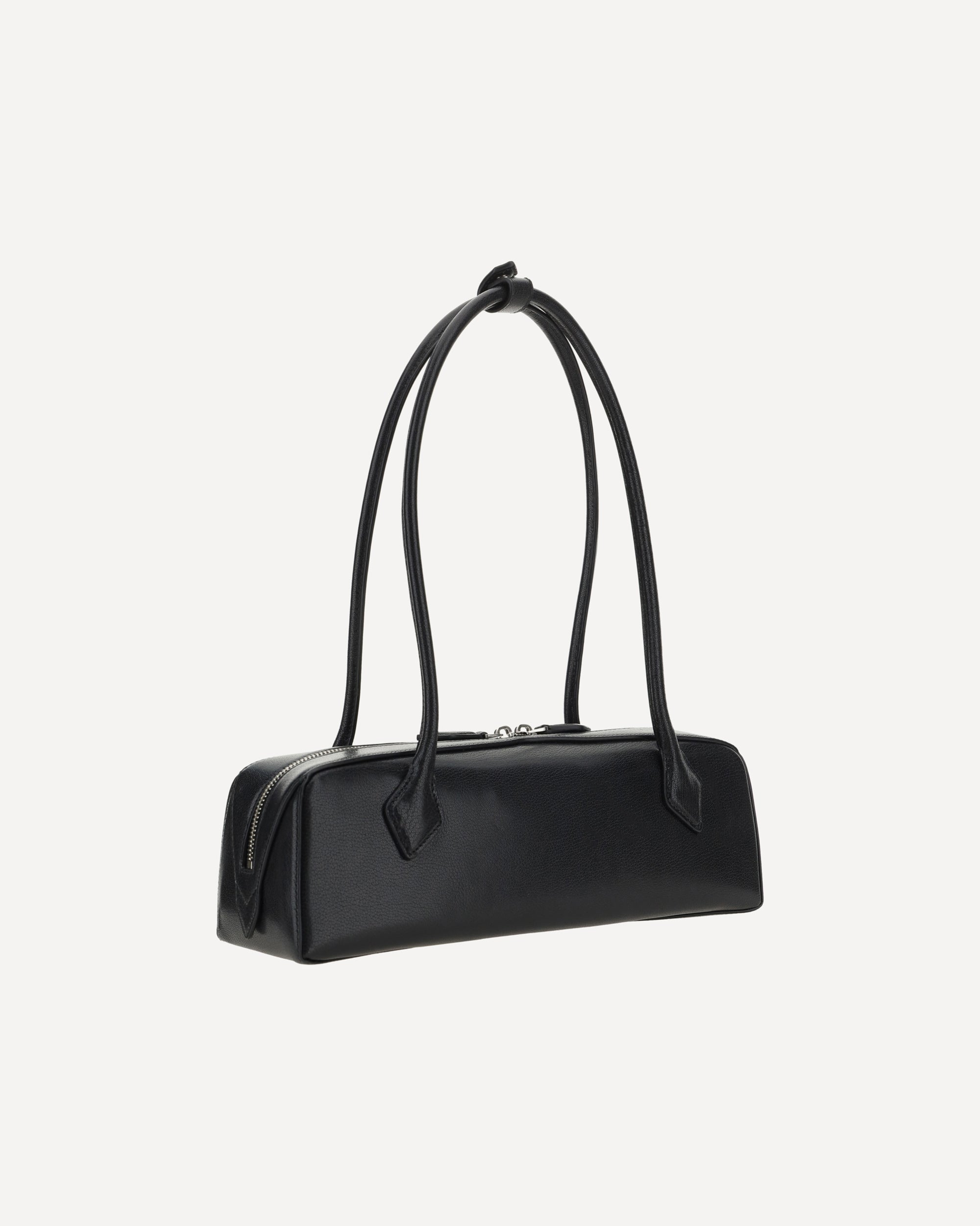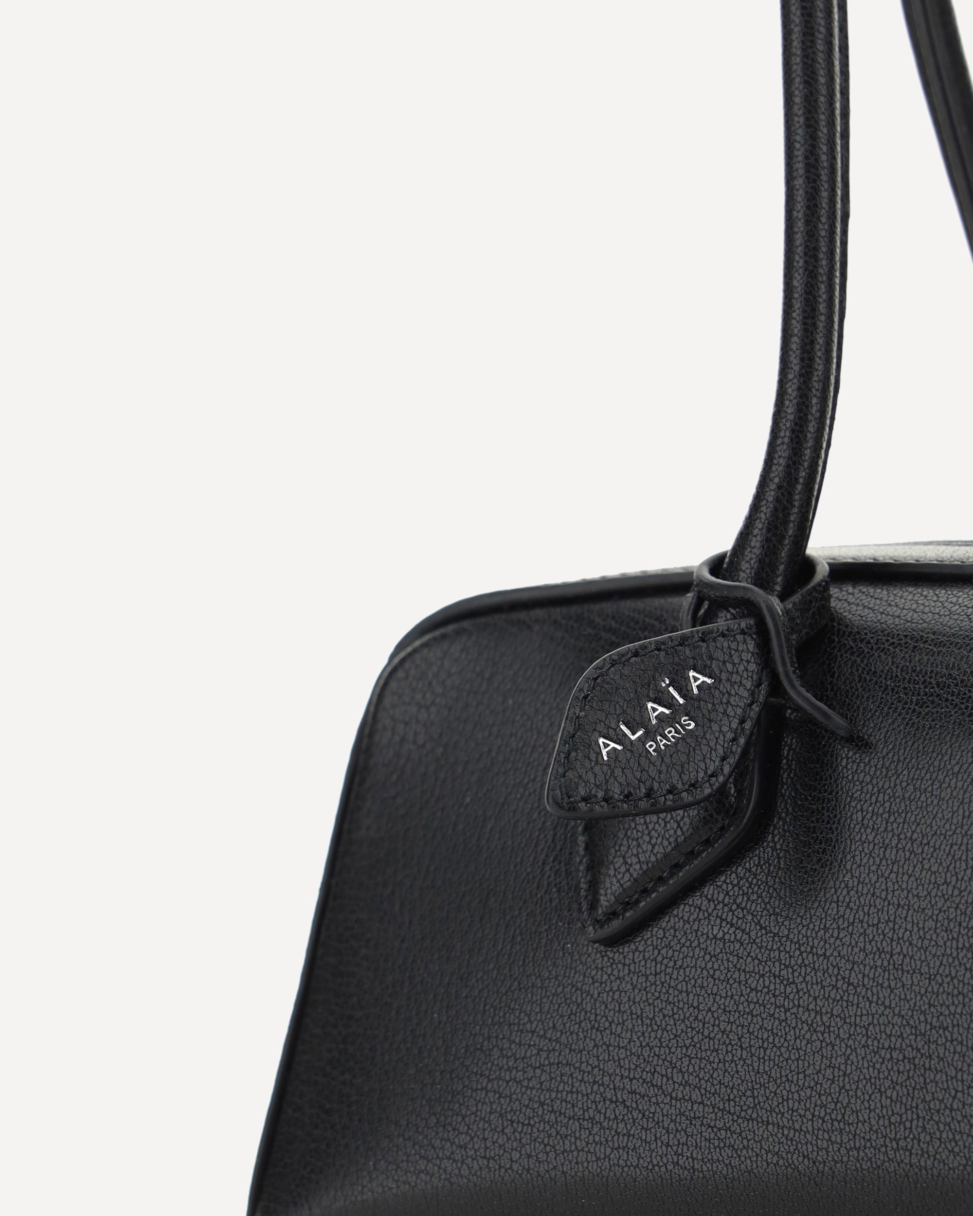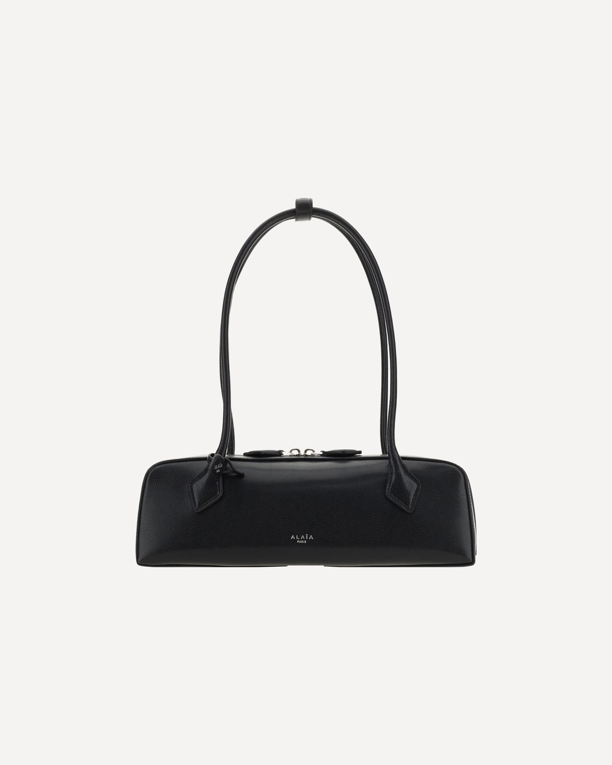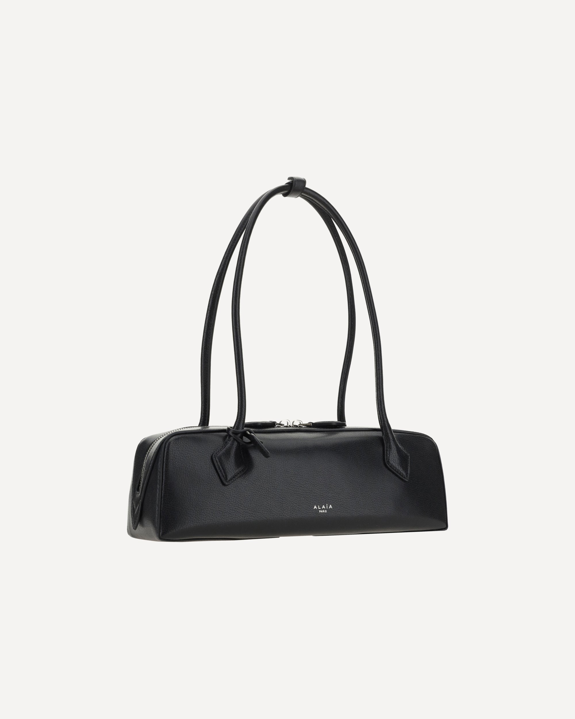 The Le Teckel goatskin Shoulder Bag by Alaïa is a sophisticated and high-class accessory, featuring a geometric design that expresses modernity and refinement. The rigid double semi-circular handles on the top offer optimal comfort and a distinctive touch. The double-slider zip closure on the top ensures practicality and security. The iconic monogram of the brand, applied in contrast on the front panel, gives the bag an elegant and recognizable detail.