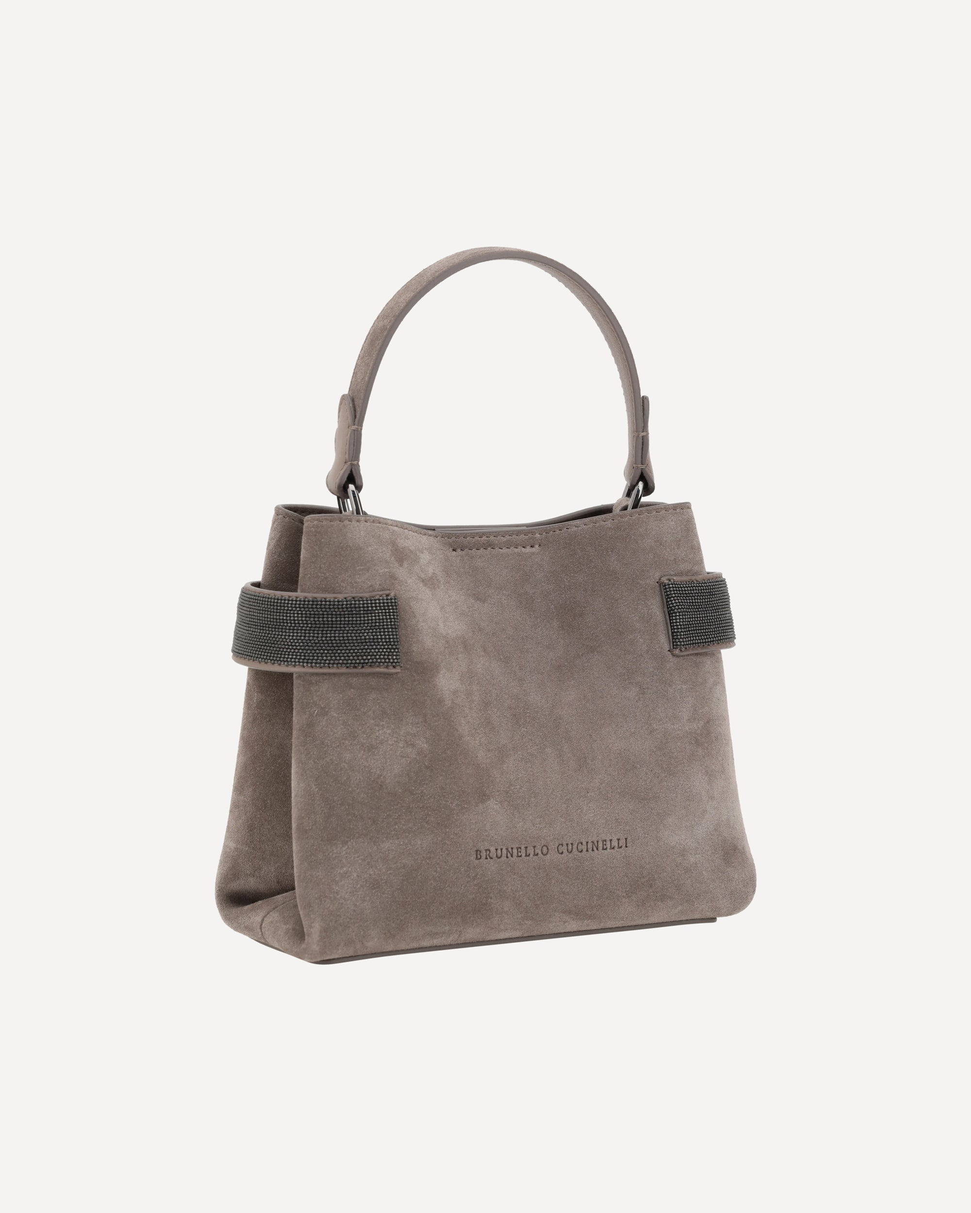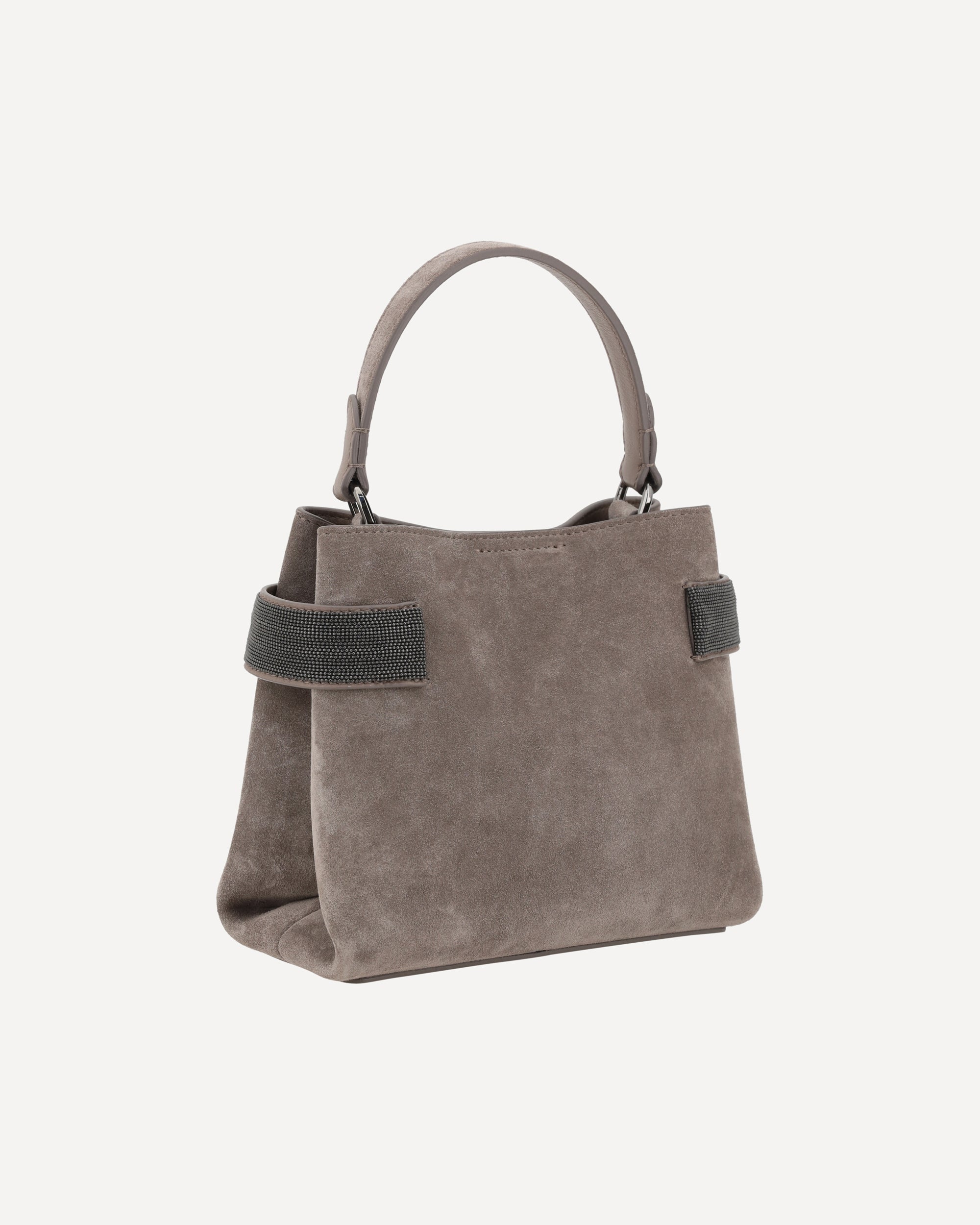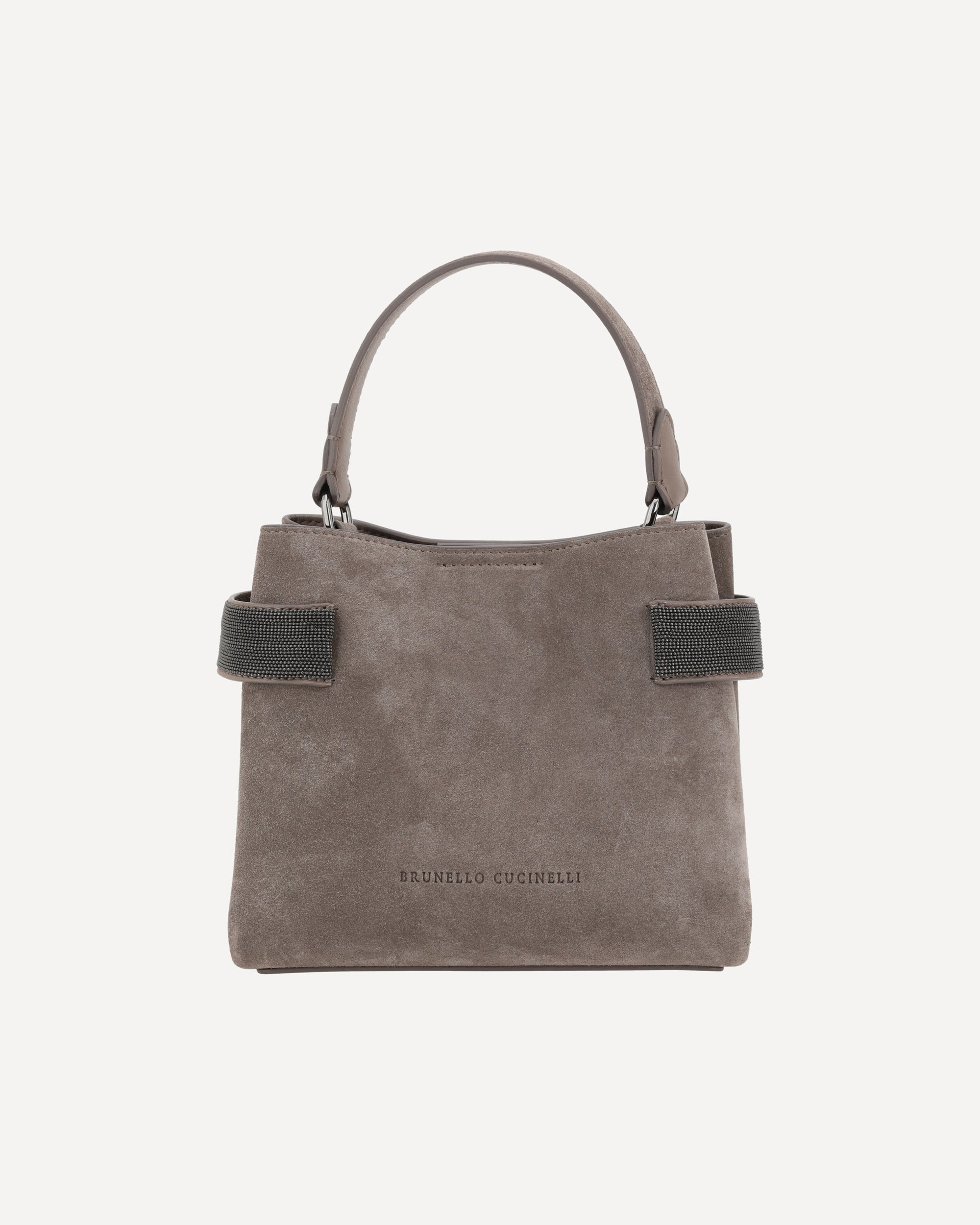 Brunello Cucinelli's Leather Handbag is an elegant and distinctive accessory featuring a modern and sophisticated geometric design. The single flat handle and magnetic button closure at the top emphasize its functionality and minimalist style. The adjustable and removable shoulder strap adds versatility, while the suede design lends a luxurious touch. The brand's iconic contrasting monogram on the front and glittering jewel detail in the side panels complete the look, making this bag a classy item for any occasion.