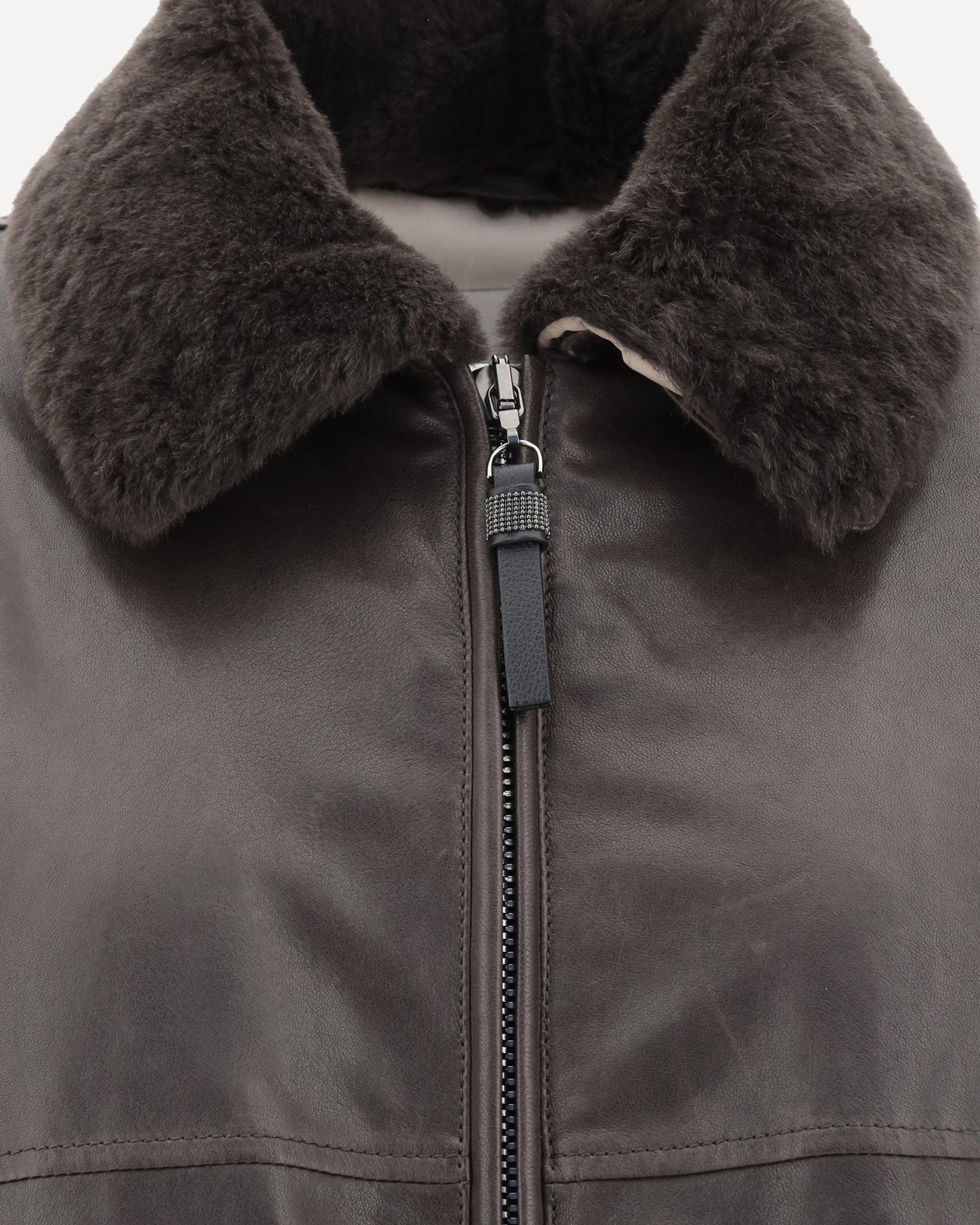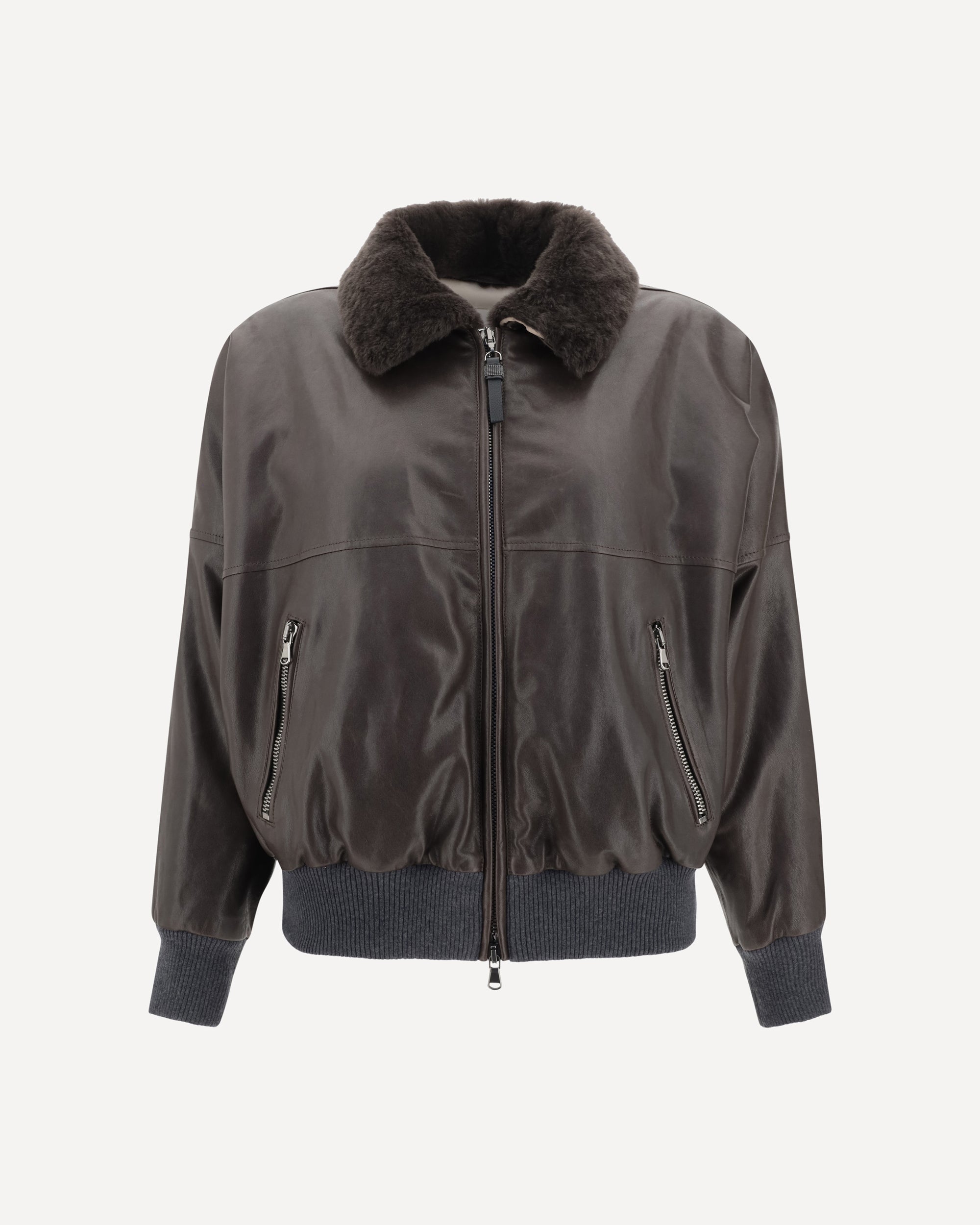 Brunello Cucinelli's Leather Jacket is a sophisticated piece with a strong character, featuring a double-slider front zipper closure that makes it easy to wear. The fur collar adds a touch of luxury and warmth, while the ribbed hem and cuffs ensure a comfortable fit and a more tailored effect. Dropped shoulders give a relaxed, modern look, making this jacket perfect for effortless elegance. A versatile garment that combines style and comfort.
