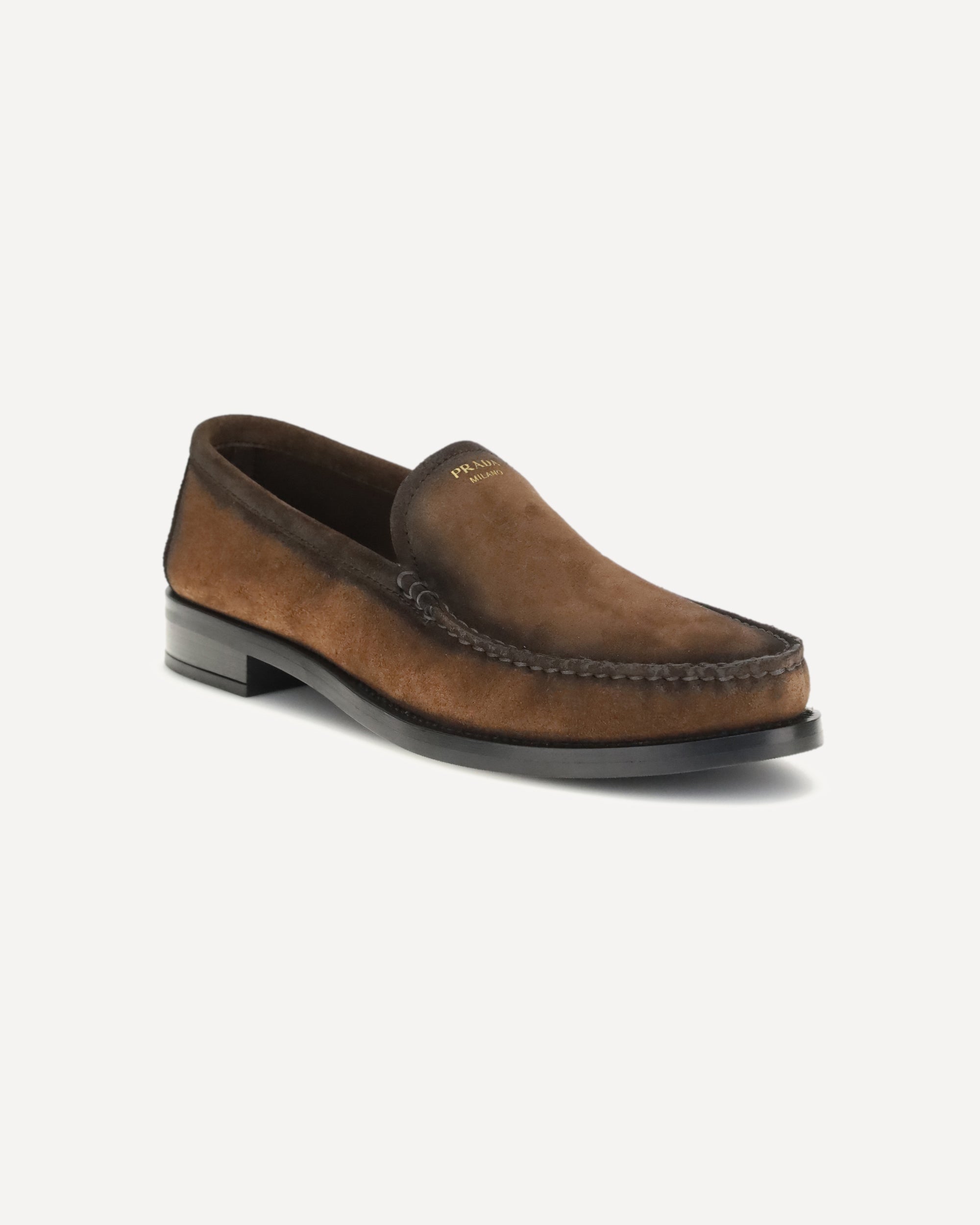 The Loafers by Prada crafted from vintage-effect suede leather, featuring a laminated logo printed on the vamp. Designed with a rounded toe and an internal printed logo, they express a timeless and elegant aesthetic.
