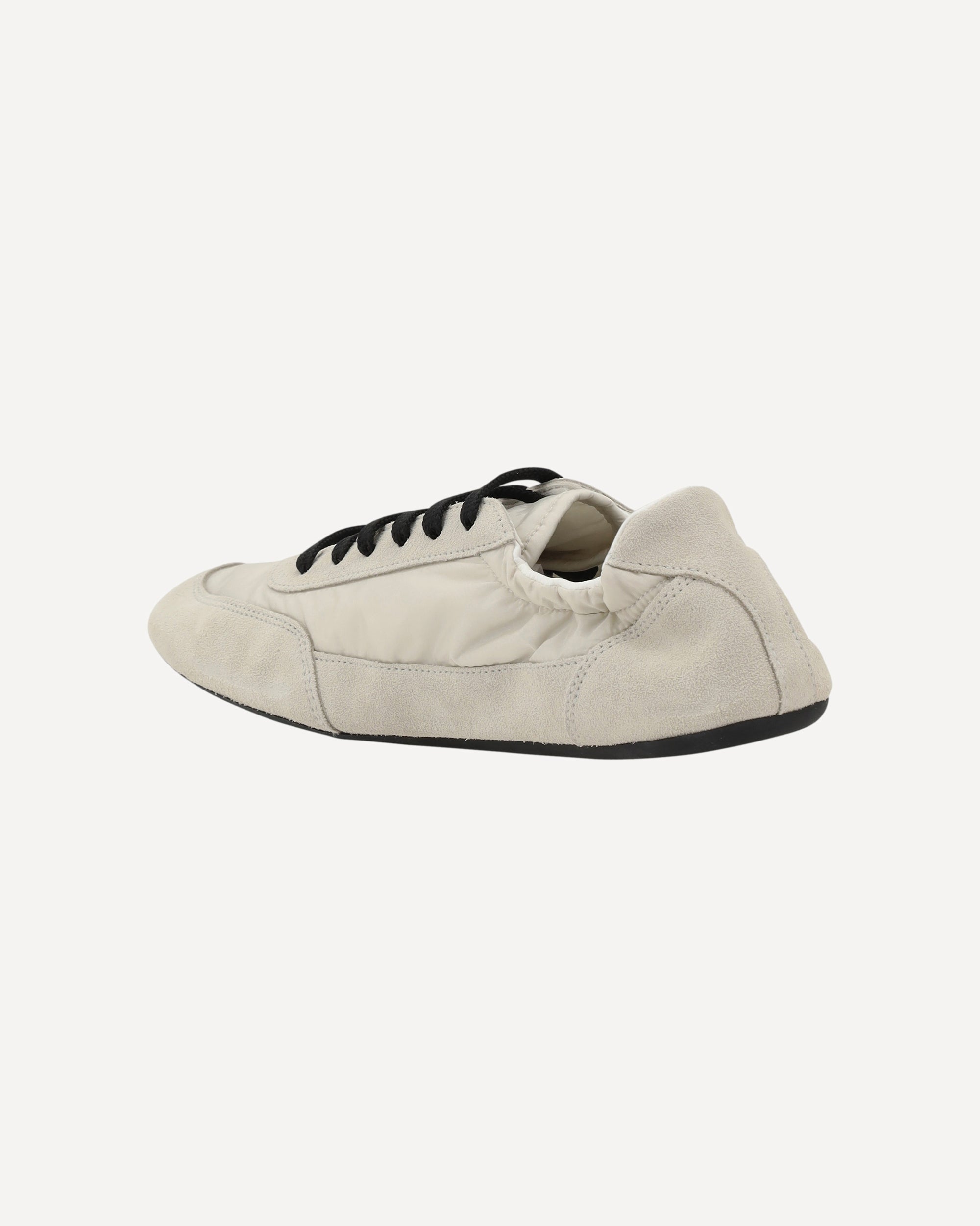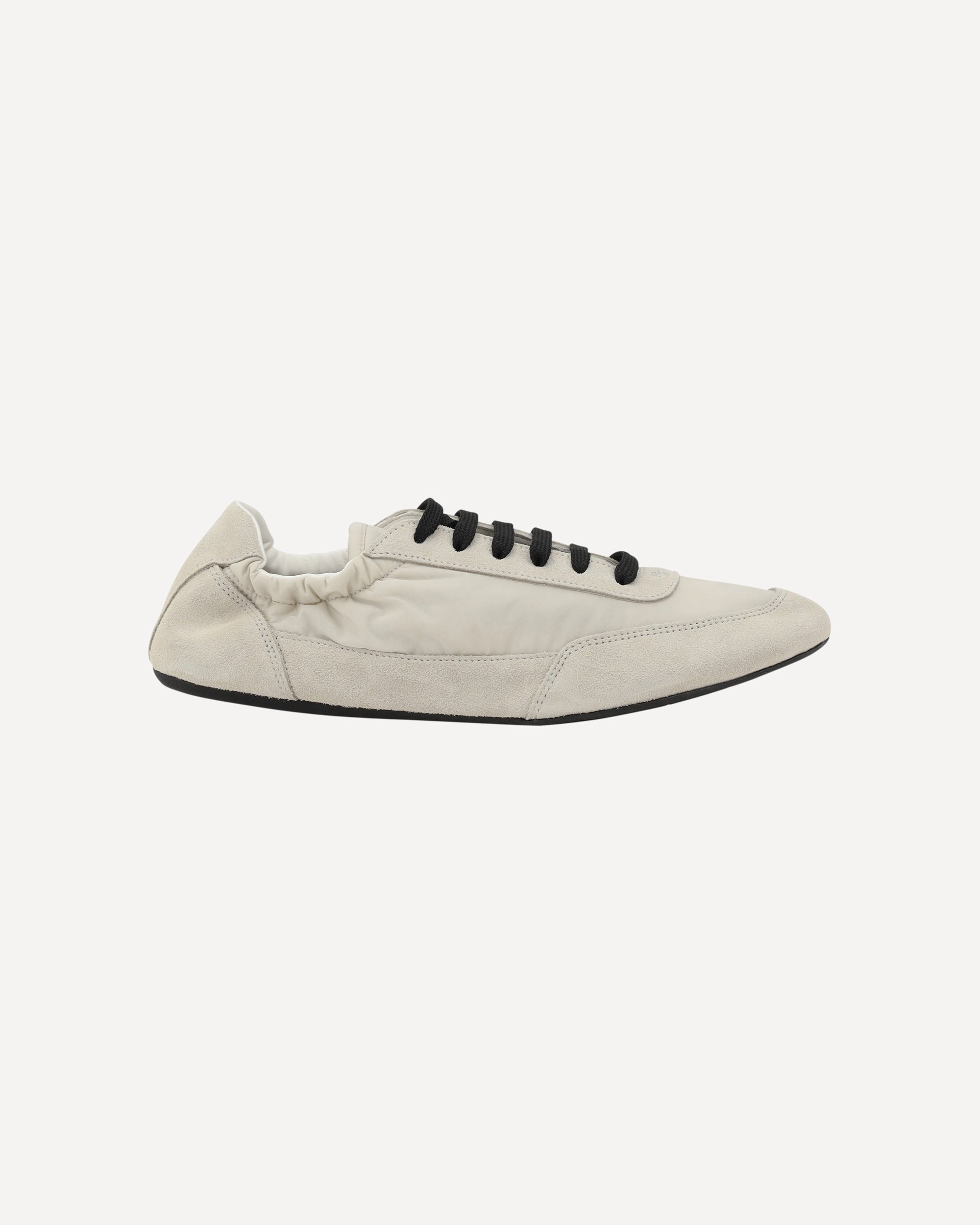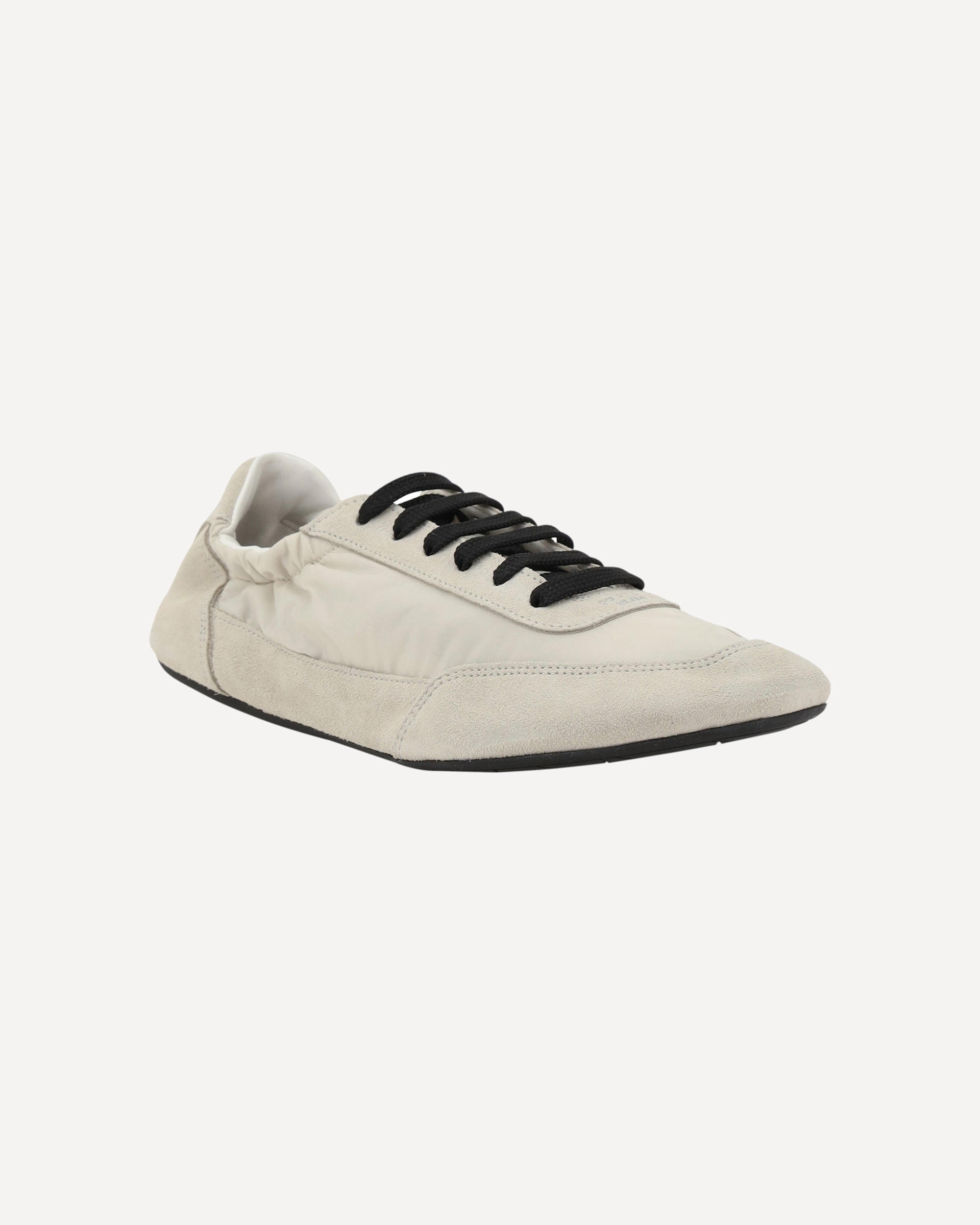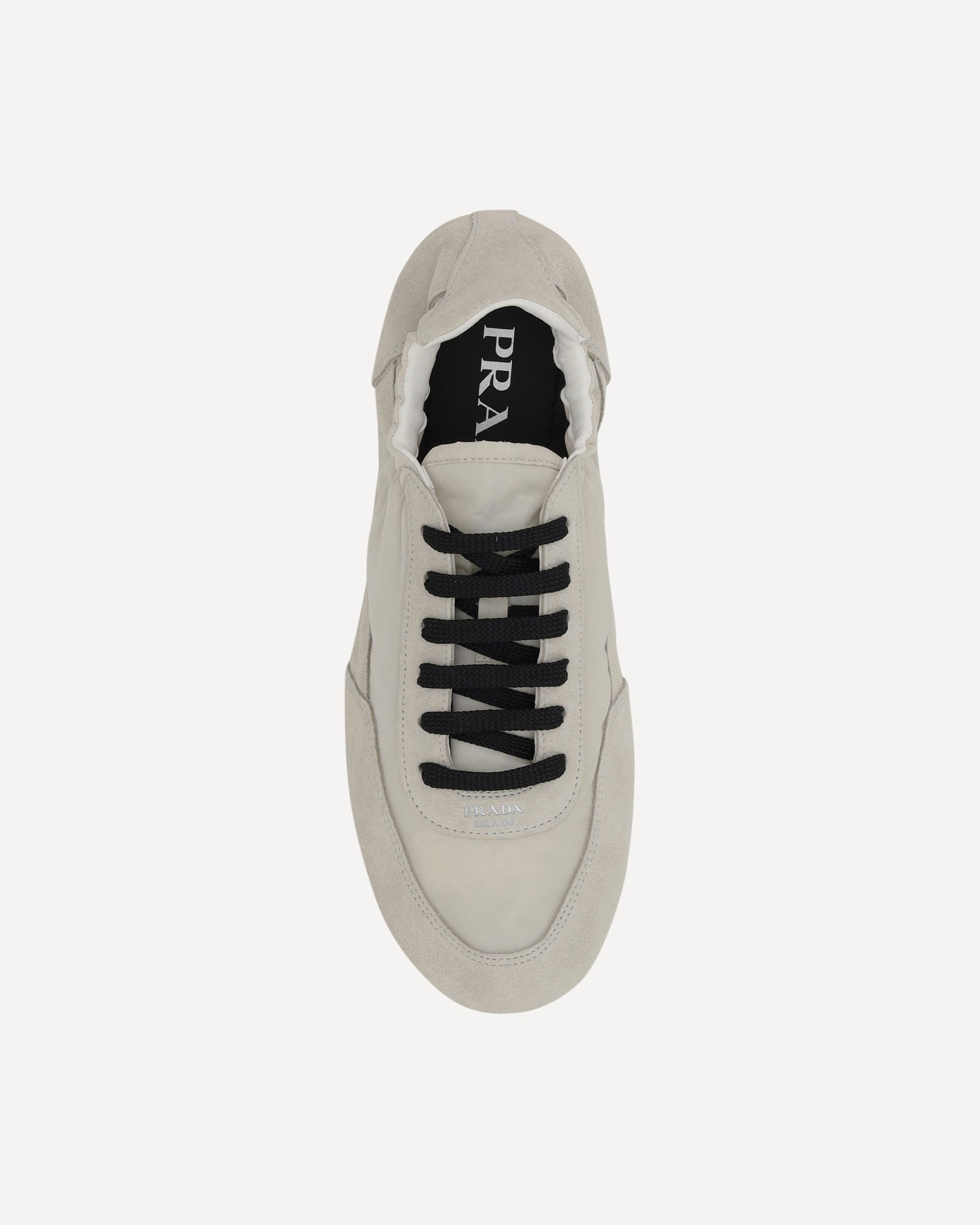 Prada's Sneakers feature a round toe and suede details, with front lace-up closure for a comfortable fit. The brand's iconic monogram can be seen in contrast on the front, while the elasticized ankle lap ensures added comfort. The flat rubber sole provides stability and durability, completing the look with a distinctive style touch.