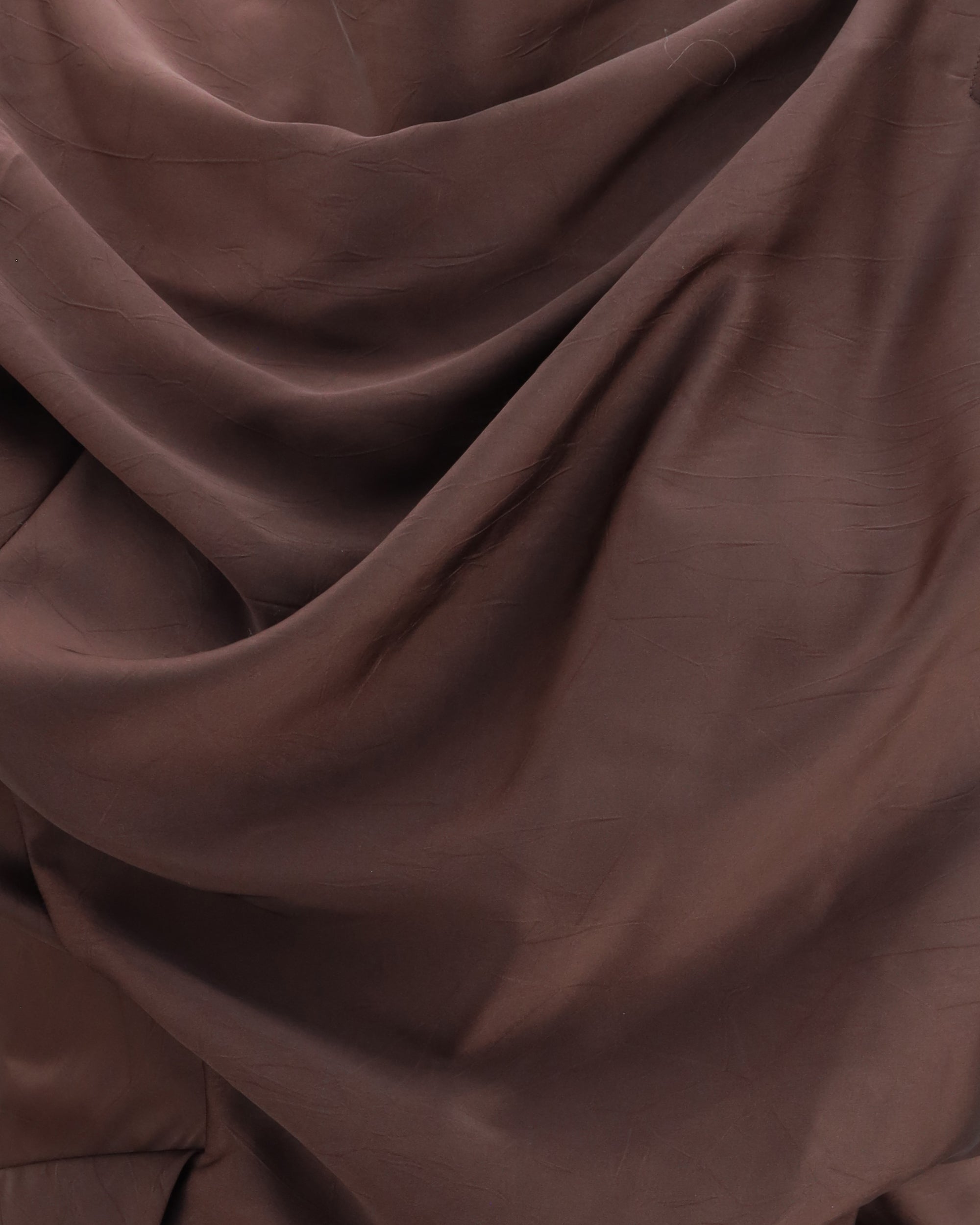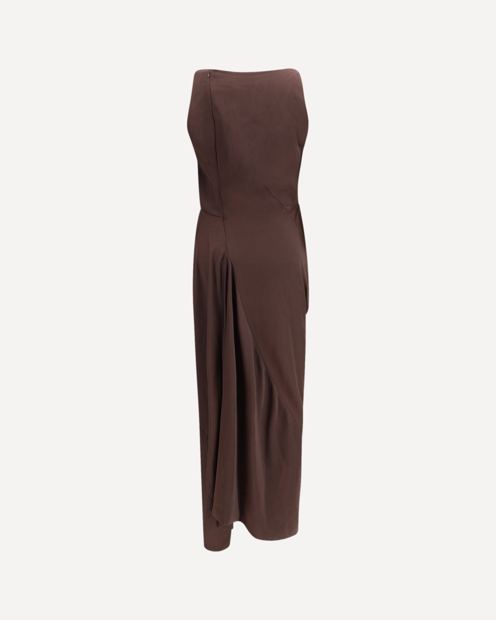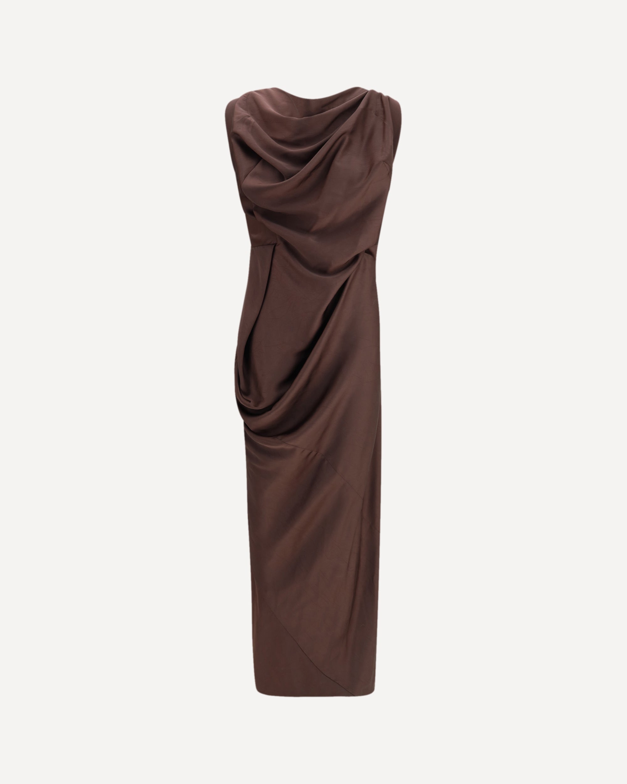 The Long Fond Dress by Vivienne Westwood embodies the brand’s signature sculptural elegance and effortless fluidity. Crafted from lustrous satin, it wraps the bust and waist in refined draping that shapes a graceful column silhouette. The softly draped neckline and cinched waist highlight the feminine form, while the asymmetric hem and flowing gathers at the back create movement and depth. Finished with a concealed side zip that preserves its clean, minimalist lines, this piece is a timeless expression of Westwood’s artistry—where structure meets sensuality with impeccable finesse.