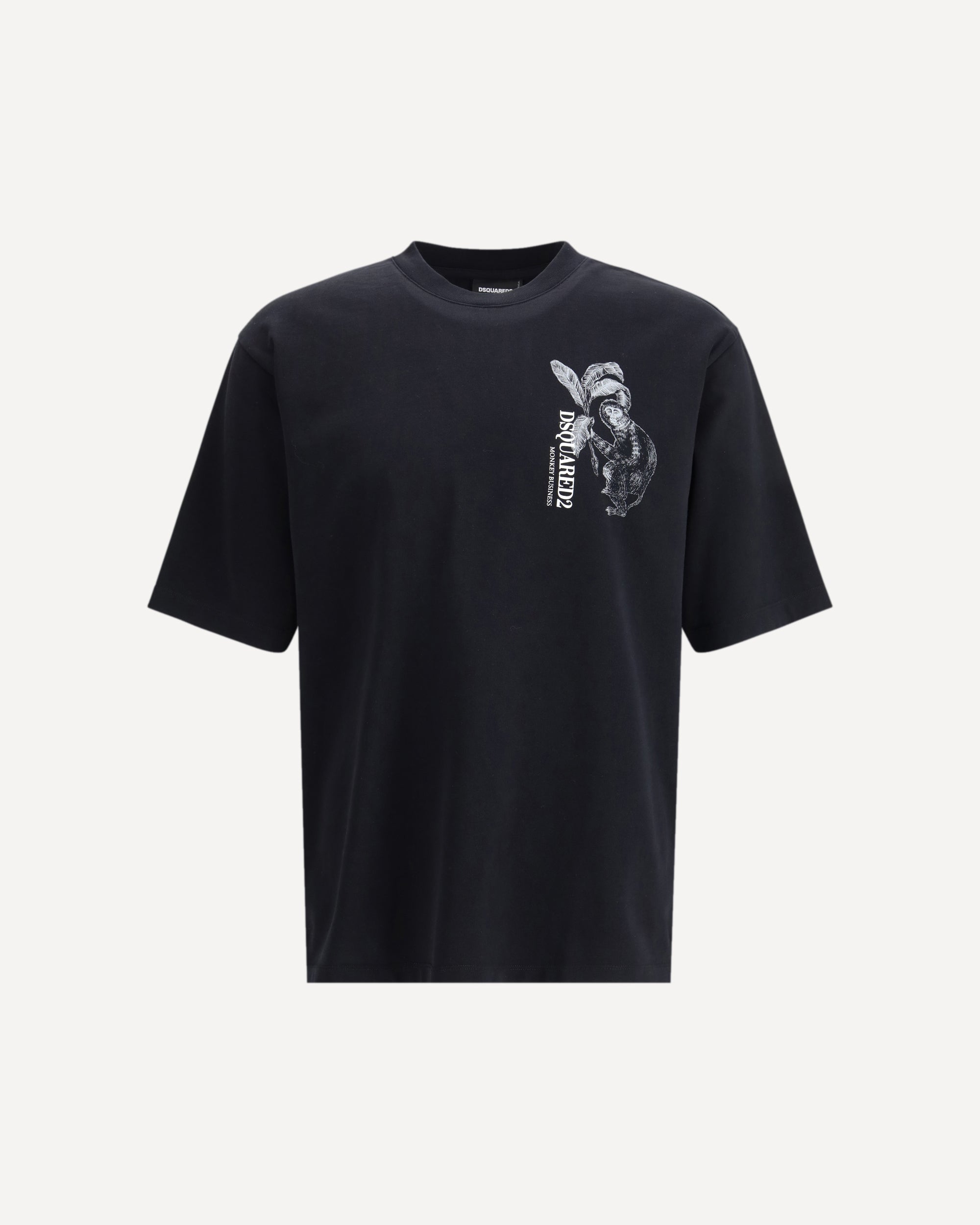 The Monkey business T-shirt by Dsquared2 is crafted from soft cotton jersey and features a loose fit with a relaxed attitude. The clean crewneck frames the graphic print on the front, where a small monkey illustration appears in the upper left area, adding an ironic and distinctive touch to the design.