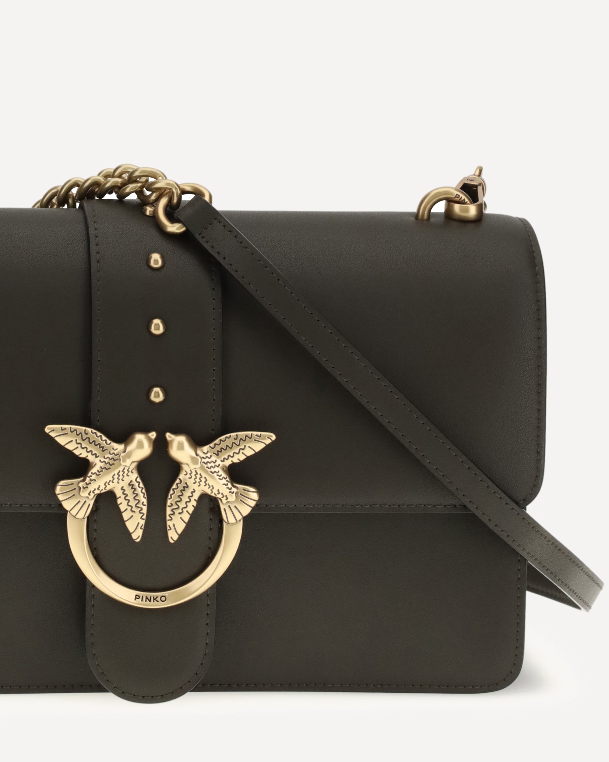 The One Simply Love Bag One Shoulder Bag by Pinko reinterprets the Classic Love Bag Icon in soft silky hand leather. The leather pod and stud closure is embellished with the iconic Love Birds Diamond Cut buckle. The interior, lined in microfiber suede, includes a zippered partition and wall pocket. Completing the design is the removable shoulder strap, which combines round chain and adjustable leather shoulder strap for versatile and comfortable use.