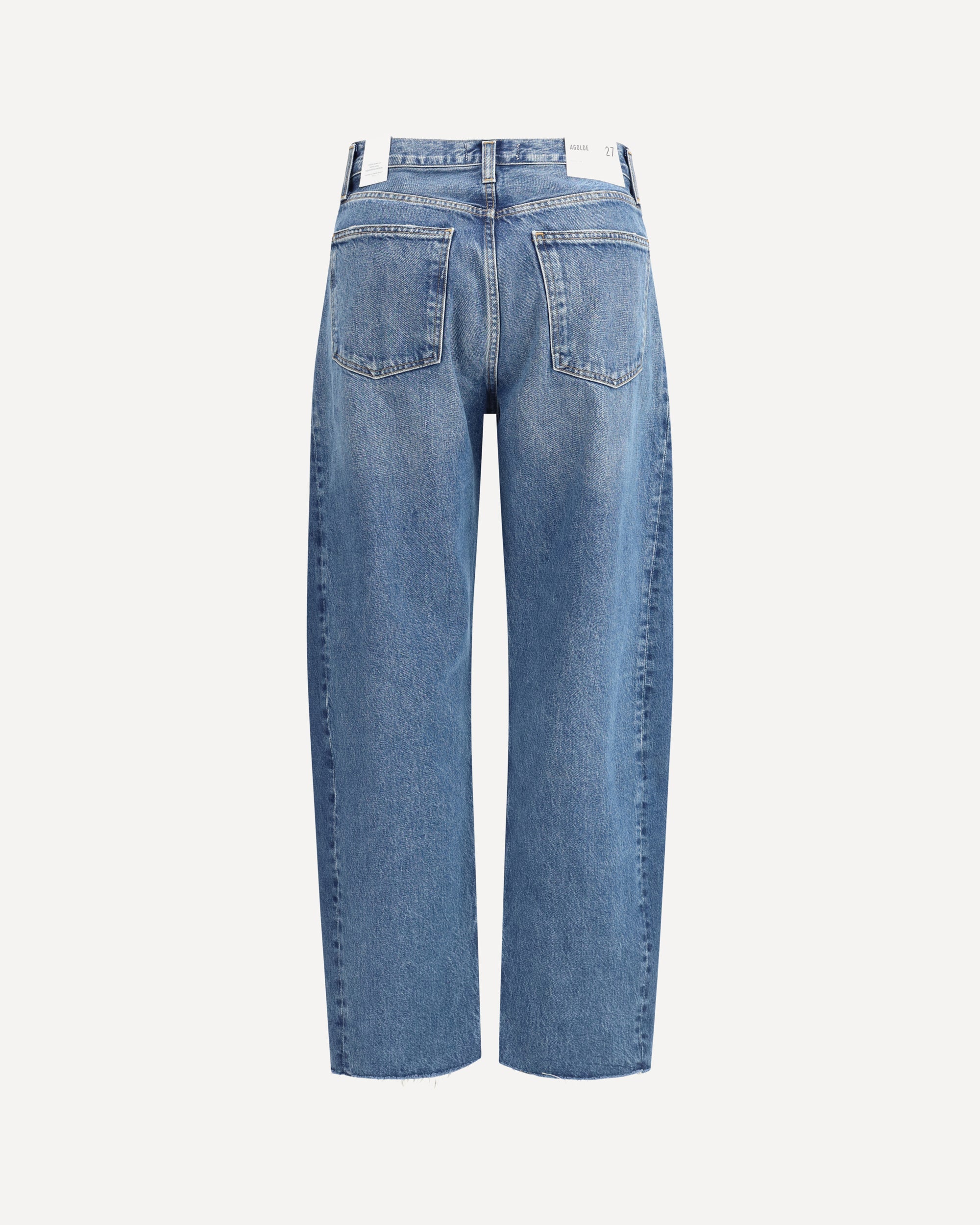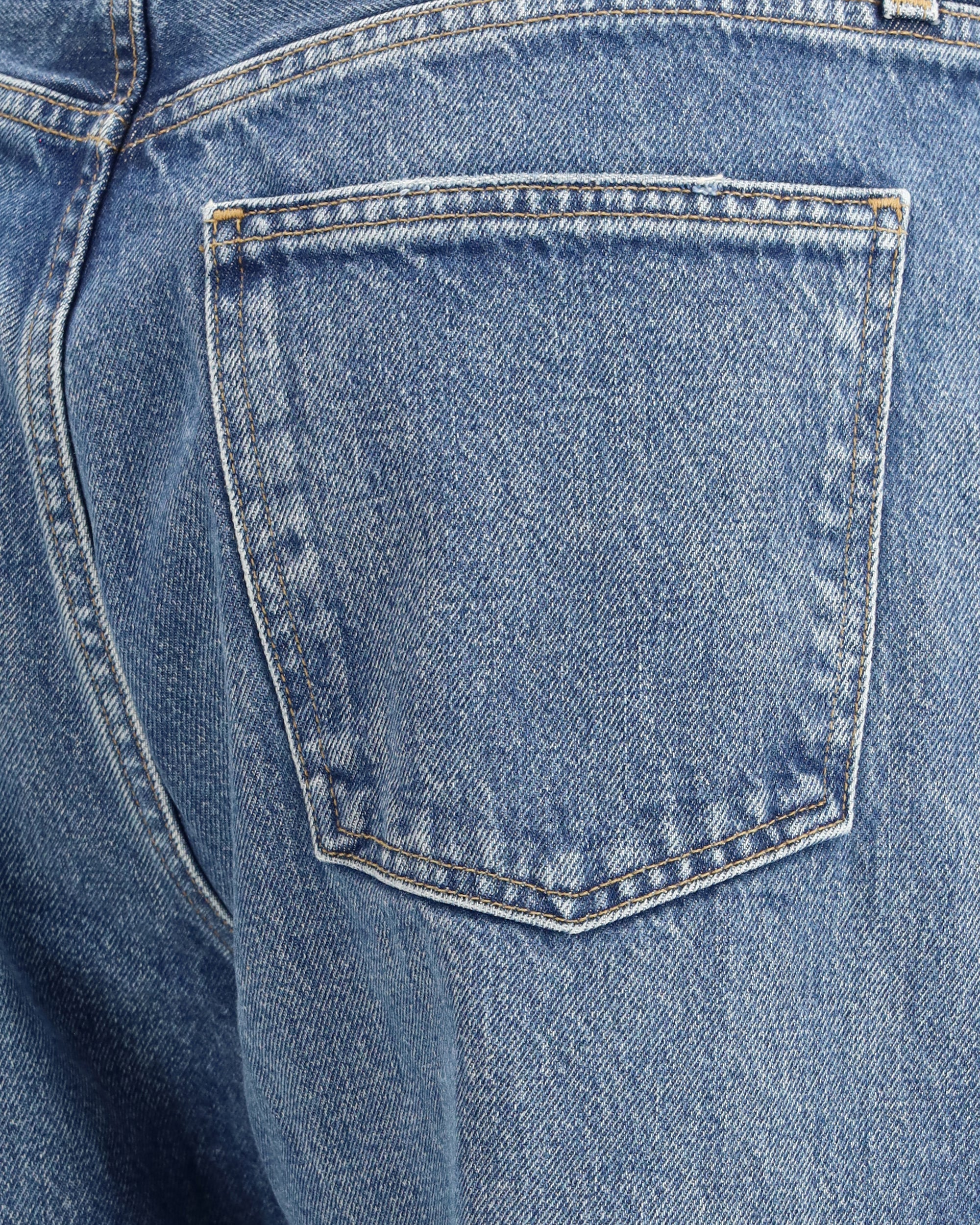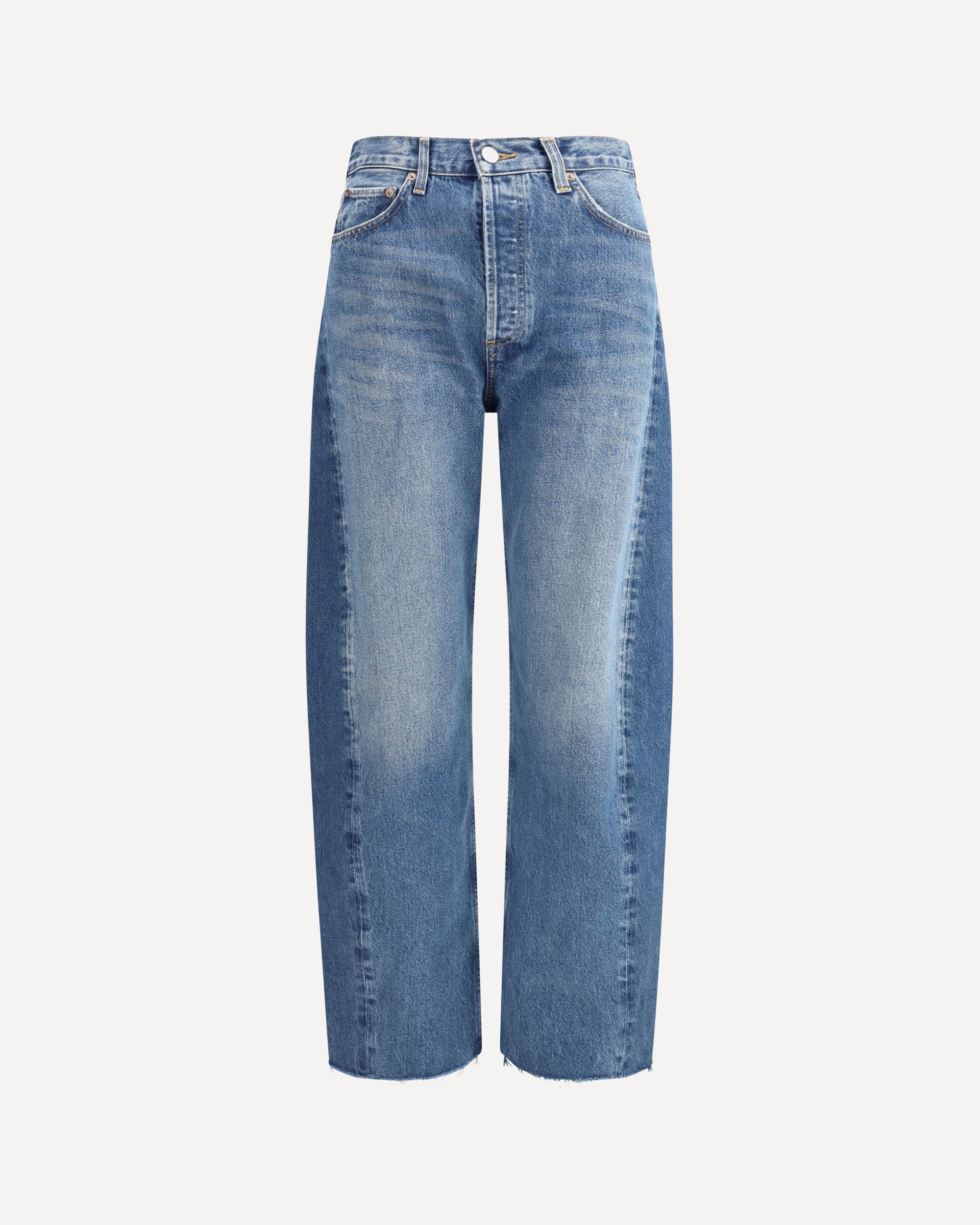 Agolde's Luna Pieced Jeans are a garment with a contemporary and original design. The model is straight, but features a slight balloon shape at the bottom, which adds a modern and dynamic twist to the traditional cut. The five-pocket design is a classic, while the front button and zipper closure offers uncompromising practicality. Belt loops on the waistband allow you to customize the look, while the raw cut detail on the bottom gives the jeans a raw effect, perfect for those looking for a more urban, gritty look.