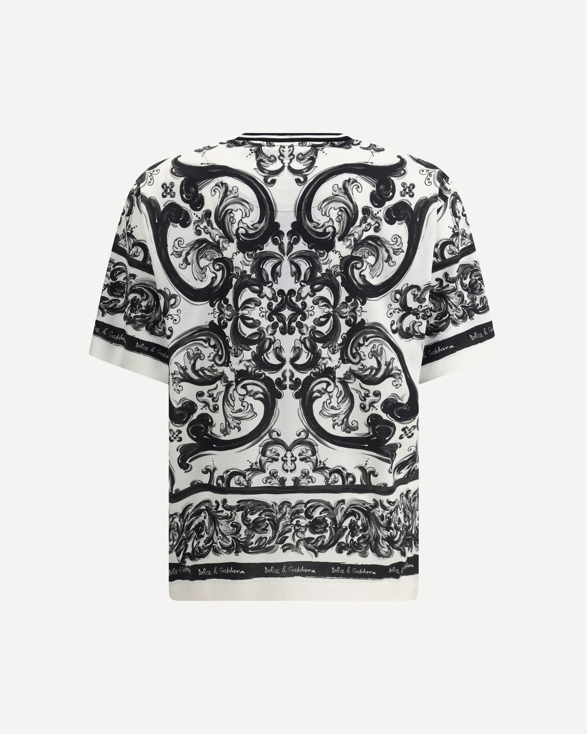 Dolce&Gabbana's Maiolica T-Shirt is a garment that embodies Mediterranean craftsmanship and aesthetics. With its ribbed crew neck and all-over print reproducing the classic majolica motif, it evokes an atmosphere of timeless elegance typical of Sicilian ceramics. Sleeve and hem details, finished with contrasting trim, further enrich the design.