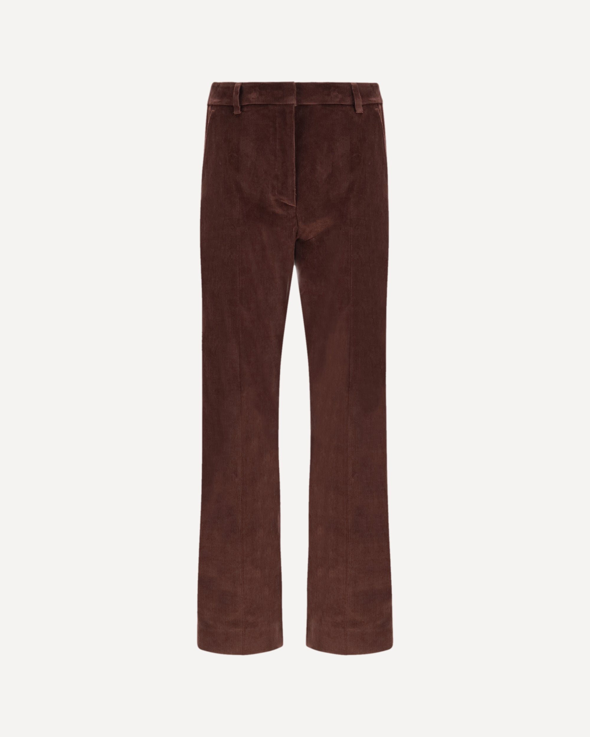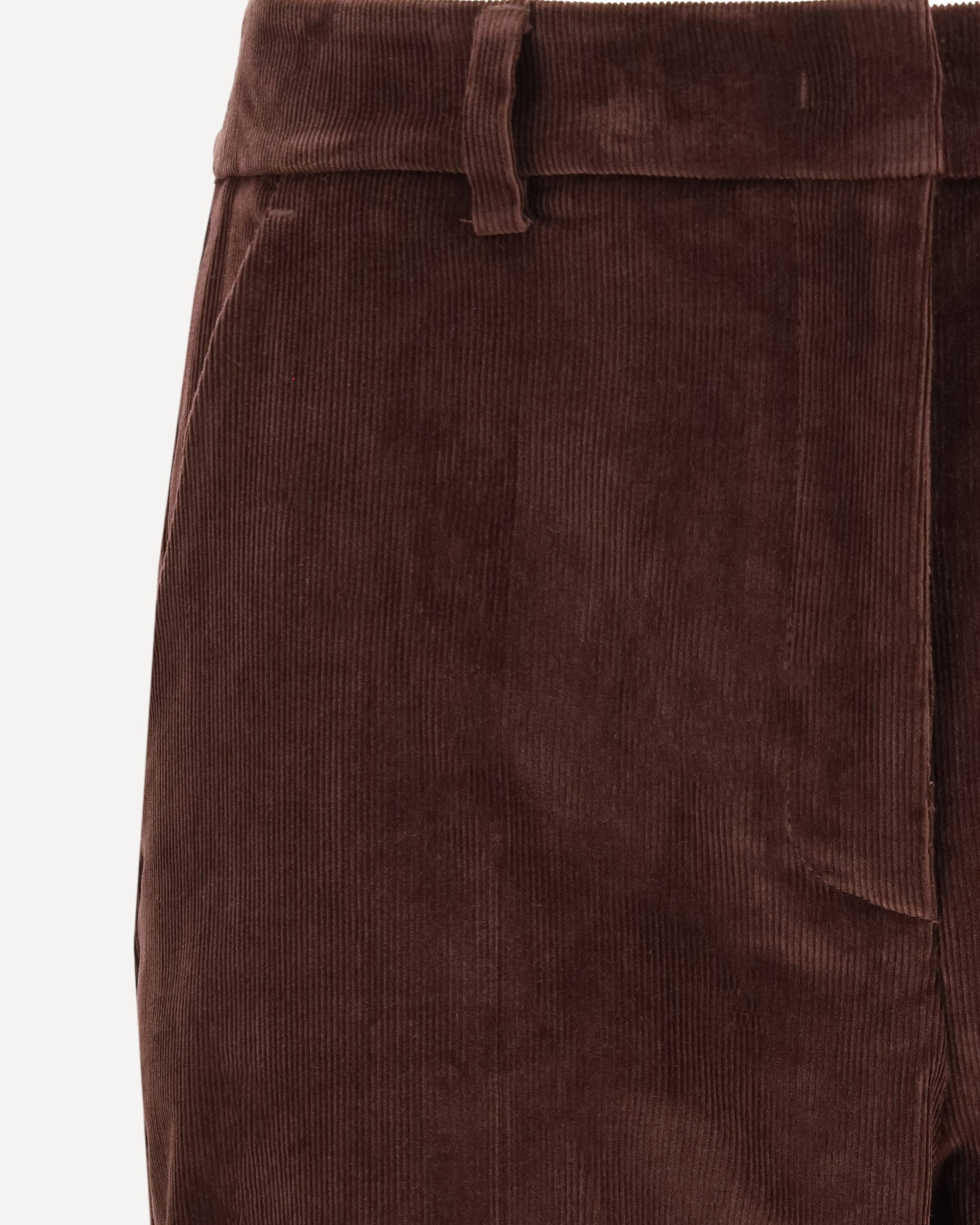 The Marruca Trousers by Weekend Max Mara are crafted from fine cotton corduroy, featuring a slim silhouette with a slightly flared cropped leg. Designed with a high waistband, zip and hook closure, and pressed creases for a polished look. Side slant pockets, double welt back pockets with button, and belt loops complete this refined, versatile piece.