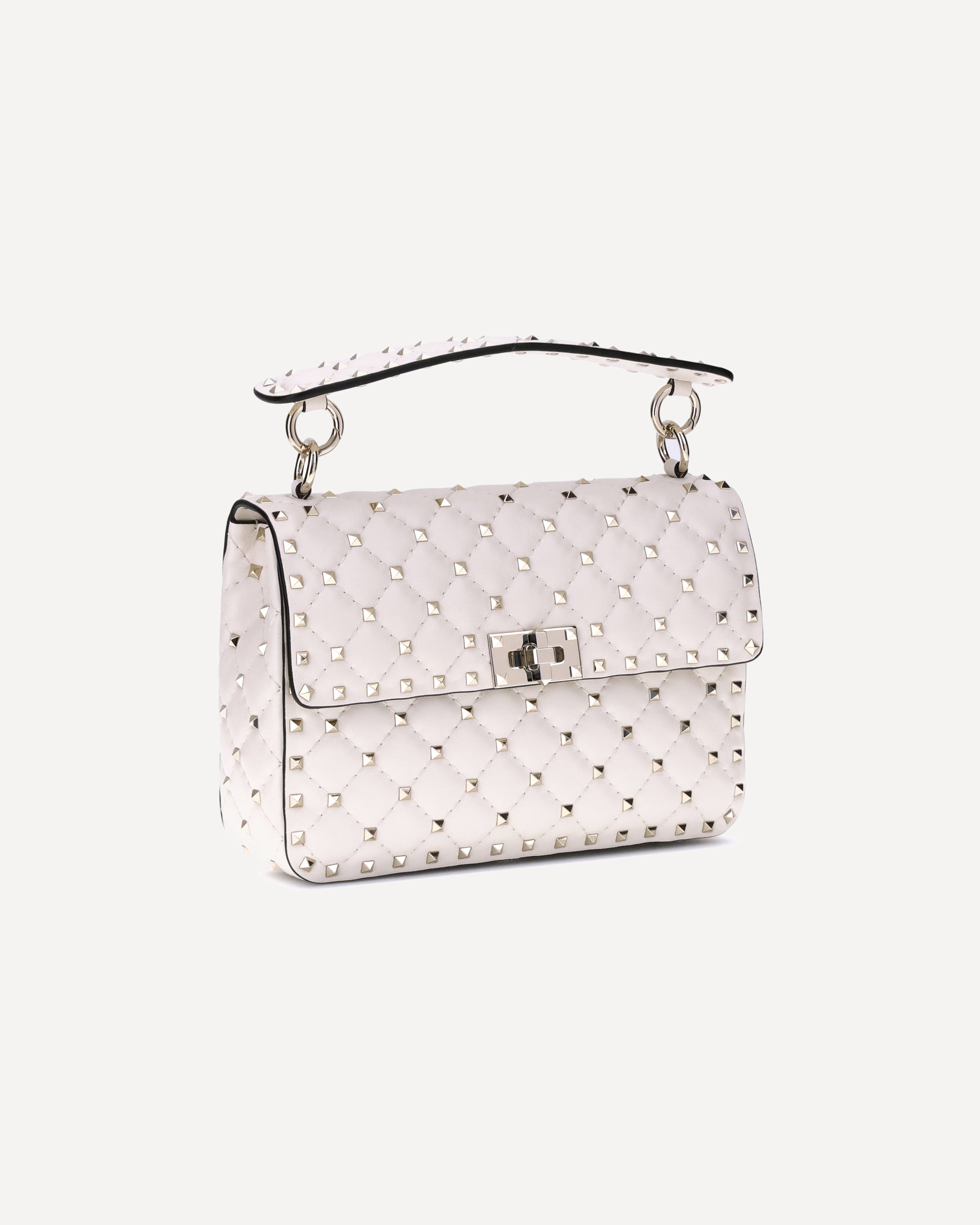 Valentino Garavani's Rockstud Spike medium Shoulder Bag is an iconic model with a bold character, crafted in diamond-quilted leather and decorated with gold-tone Rockstud studs across the surface. Featuring a removable studded black leather top handle and adjustable smooth leather shoulder strap, it combines style and practicality. The well-organized interior features two zippered pockets and three card slots. The front flap and swivel closure completes the design with a sophisticated touch.