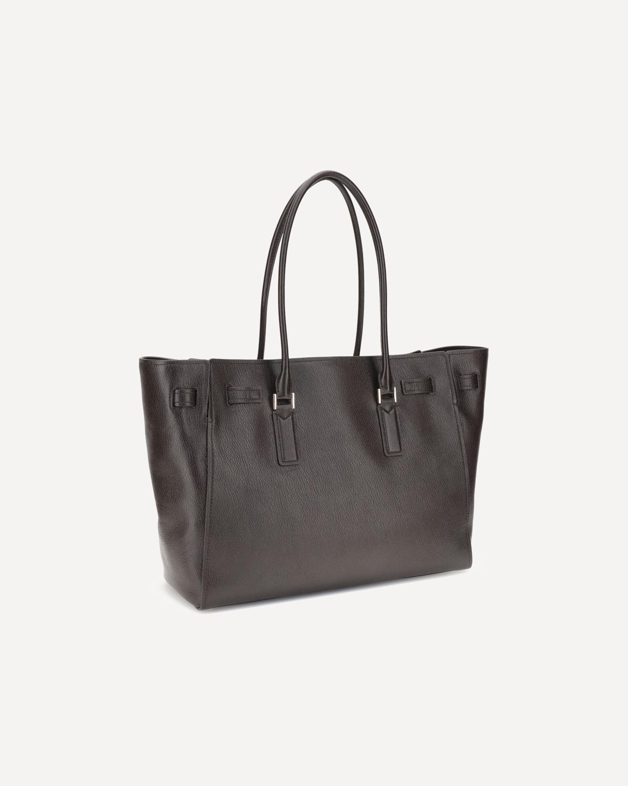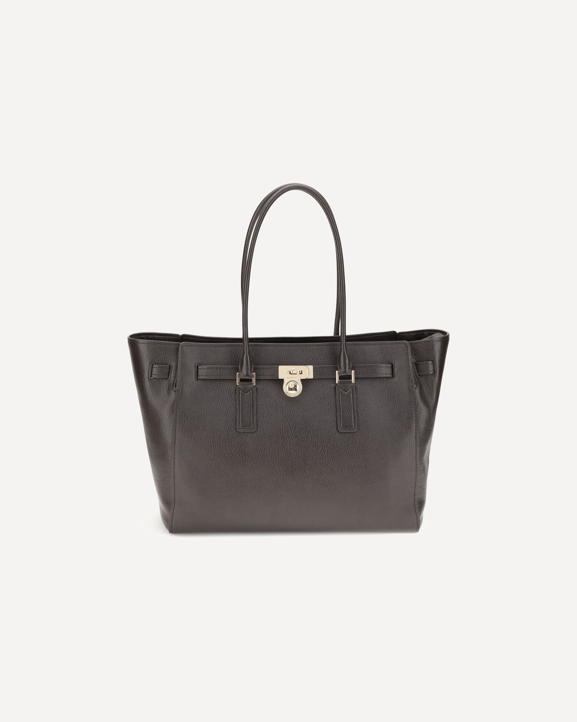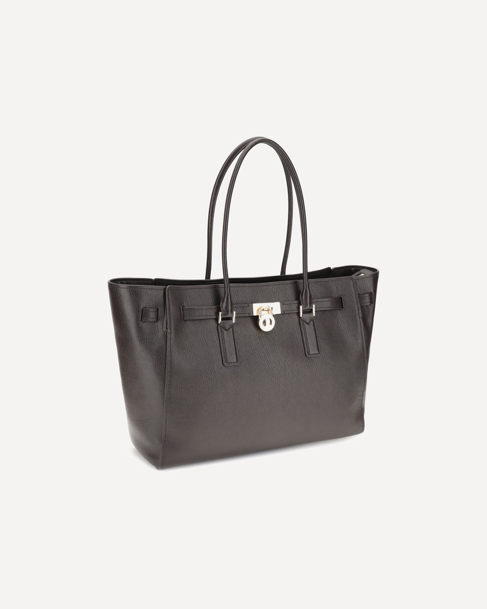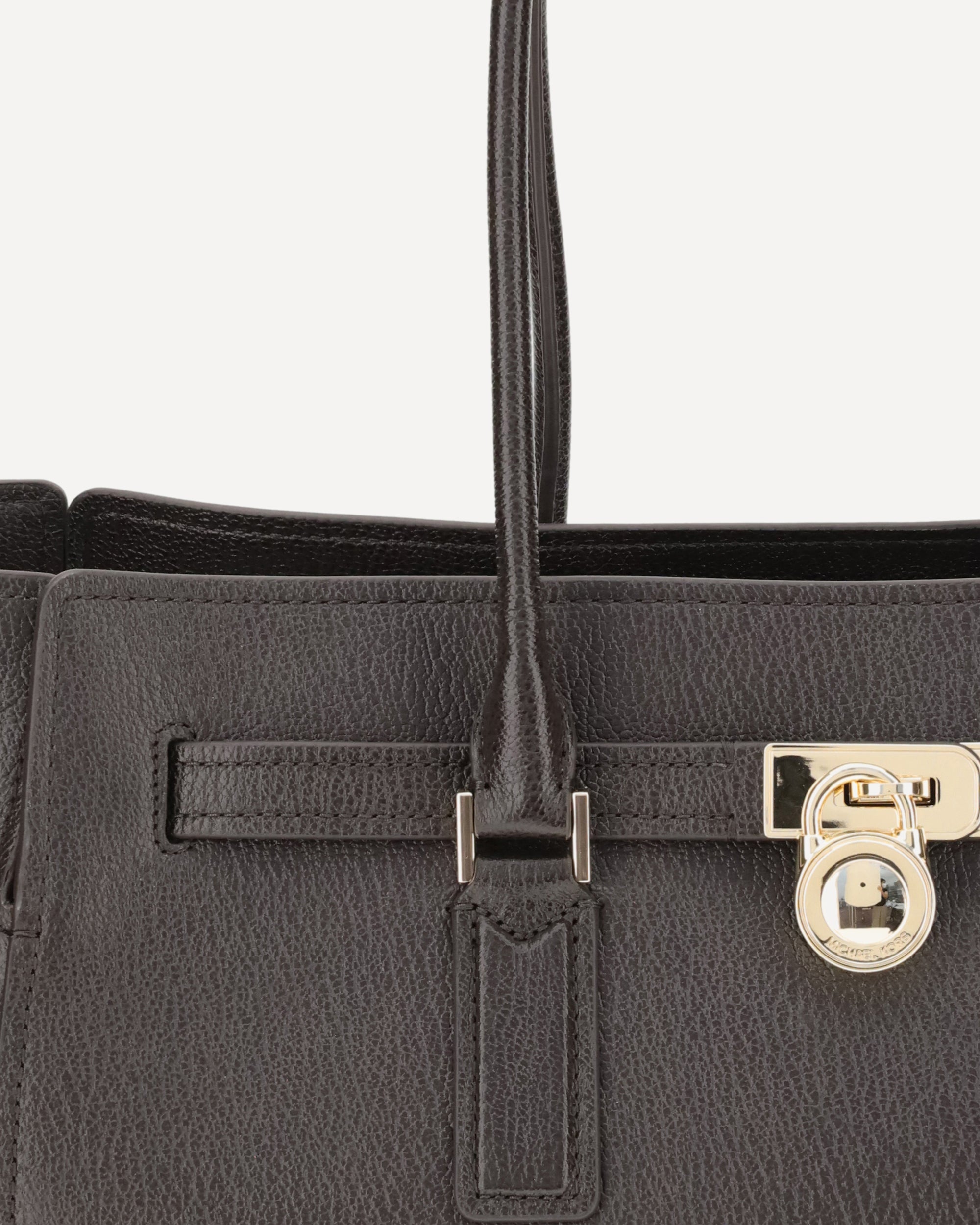 The Hamilton Moderne large Tote Bag by Michael Kors is a roomy, structured model designed to combine functionality and elegance. The silhouette with decorative belt and iconic padlock pendant define its sophisticated style, ideal for everyday use. Featuring a zippered closure, it has an organized interior with a back zippered pocket and two front pouch pockets, perfect for storing laptops, documents and personal items neatly and conveniently.